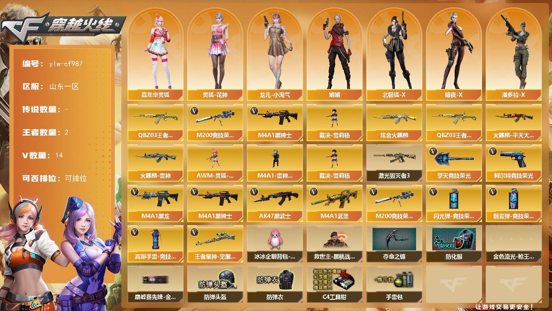 PX_2551700-14V-2王者-1炫金 【热门武器】:QBZ-03-王者蔷薇,M200-竞技荣光,M4A1-黑骑士,裁决-雪莉杨 【王者炫金武器】:QBZ-03-王者蔷薇,炫金火麒麟 【皮肤】:火麒麟-雷神,火麒麟-平天大圣 【角色】:暗夜-X,北极狐-X,芳心审判者,风暴女,嘉年华灵狐,娟娟,灵狐-花神,龙儿,龙儿-小淘气,潘多拉-X 【人偶武器】:裁决-雪莉杨,M4A1-雷神-精英刀锋,AWM-