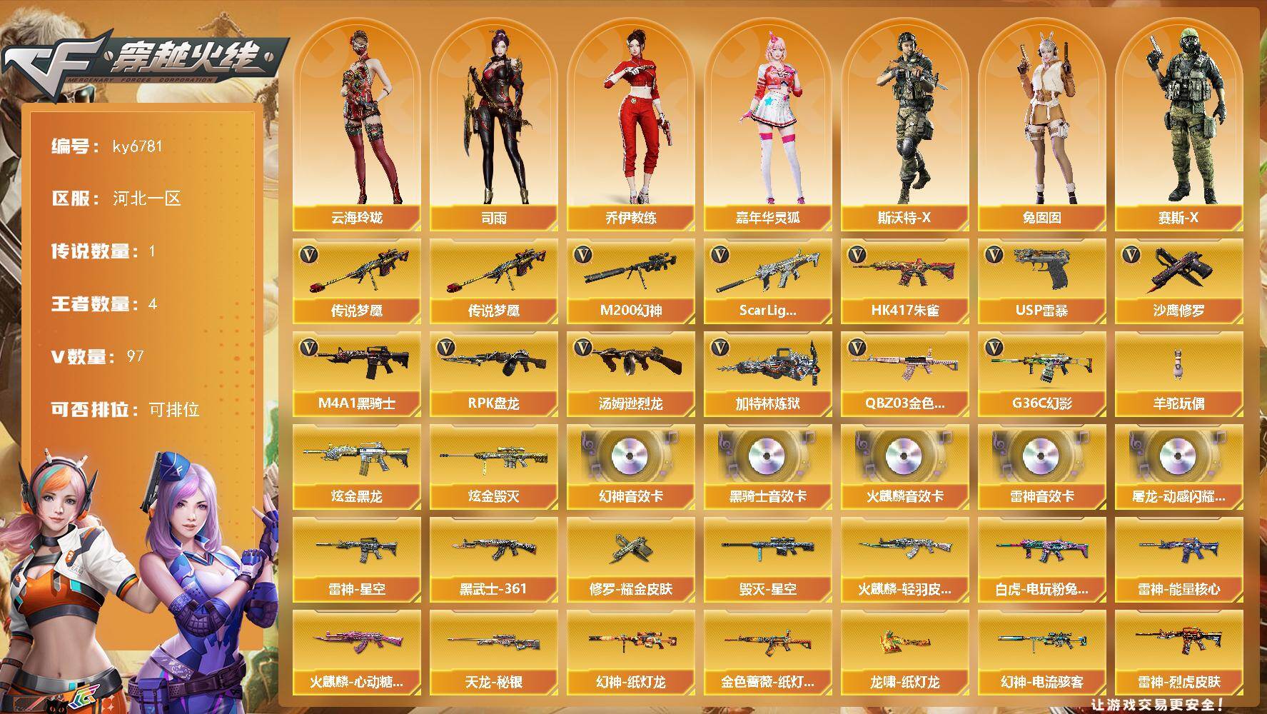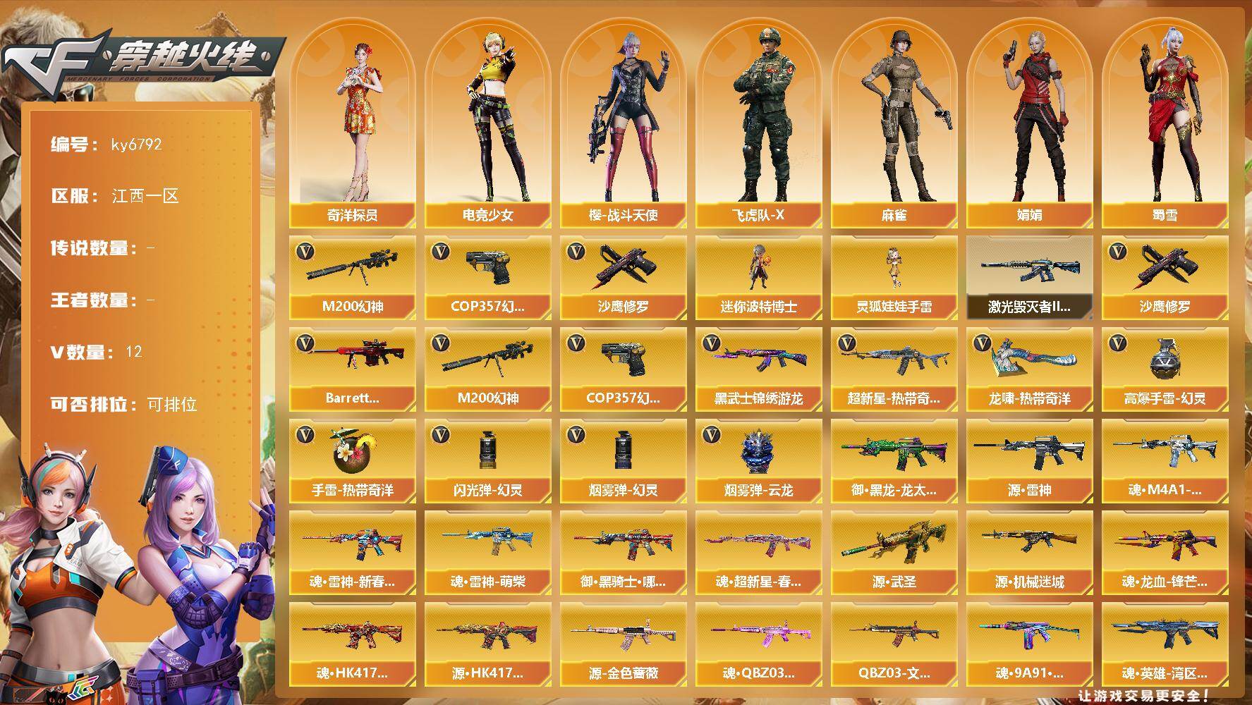 PX_2549235-9V-0王者武器数-0炫金武器数 【热门武器】:M200-幻神,COP,357-幻灵,沙鹰-修罗 【角色】:奇洋探员,电竞少女,飞虎队-X,风暴女,娟娟,兰-新年限定,麻雀,潘多拉-X,蜀雪,樱-战斗天使 【人偶武器】:迷你波特博士,灵狐娃娃手雷 【挑战大师】:激光毁灭者III-白马银枪 【英雄级武器】:黑武士-锦绣游龙,超新星-热带奇洋,Barrett-极光,M200-幻神,沙鹰-