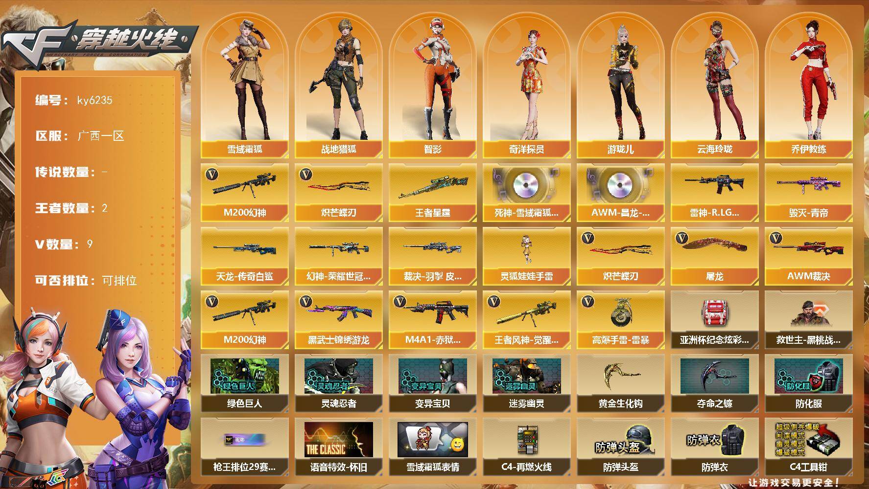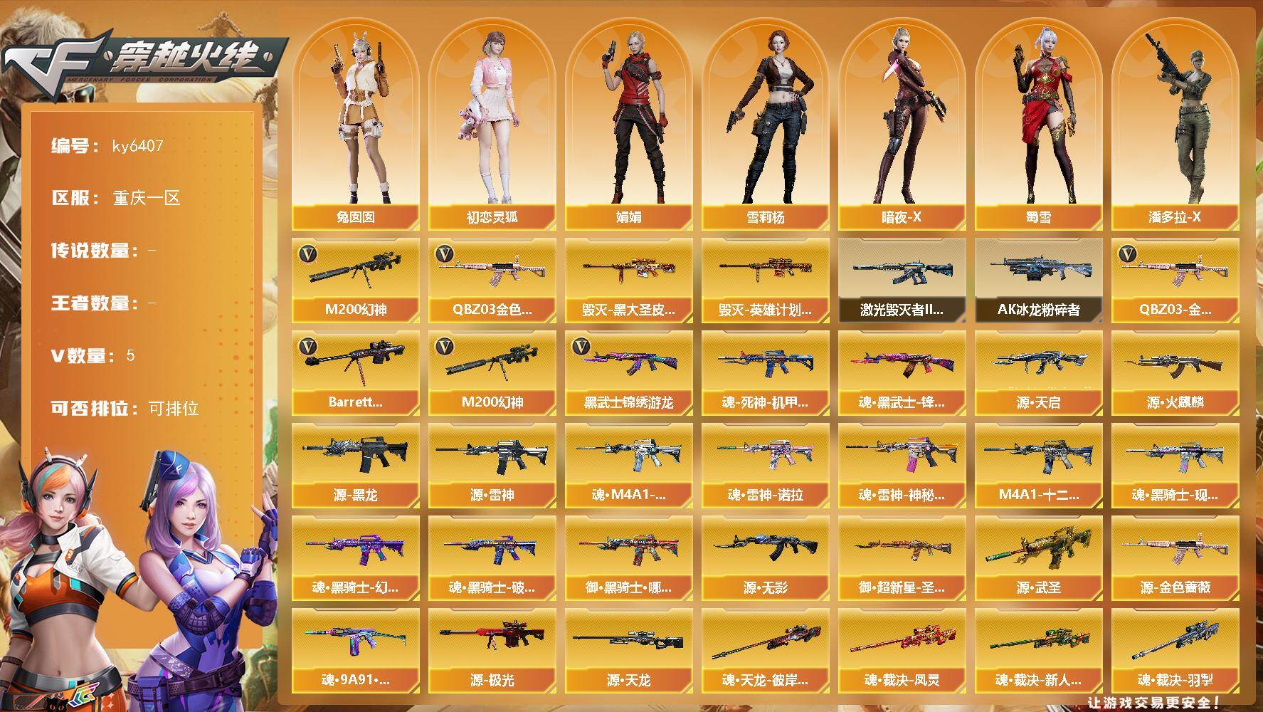 PX_2548957-6V-0王者武器数-0炫金武器数 【热门武器】:QBZ03-金色蔷薇,M200-幻神 【皮肤】:毁灭-黑大圣皮肤,毁灭-英雄计划,皮肤 【角色】:暗夜-X,初恋灵狐,风暴女,娟娟,潘多拉-X,蜀雪,兔囡囡,雪莉杨 【挑战大师】:AK47-冰龙粉碎者,激光毁灭者III-白马银枪*2 【英雄级武器】:黑武士-锦绣游龙,QBZ03-金色蔷薇,Barrett-毁灭,M200-幻神 【源级武器