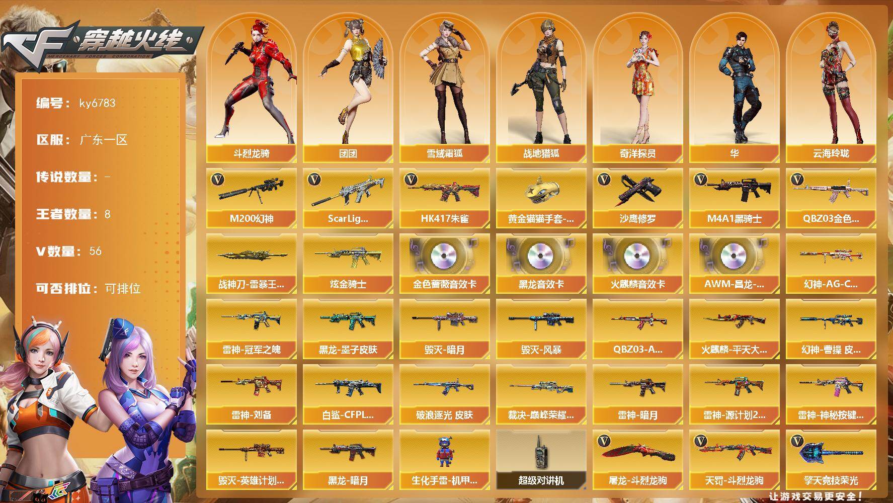 PX_2549545-56V-8王者武器数-1炫金武器数 【热门武器】:QBZ03-金色蔷薇,Scar,Light-白虎,HK417-朱雀,M200-幻神,M4A1-黑骑士,沙鹰-修罗,黄金猫猫手套-白鲨 【王者炫金武器】:斩神刀-雷暴王者,炫金骑士 【音效卡】:AK47-火麒麟音效卡,M4A1-黑龙音效卡,QBZ03-金色蔷薇音效卡,AWM-昌龙-怀旧音效卡*2 【皮肤】:幻神-曹操,皮肤,幻神-AG-