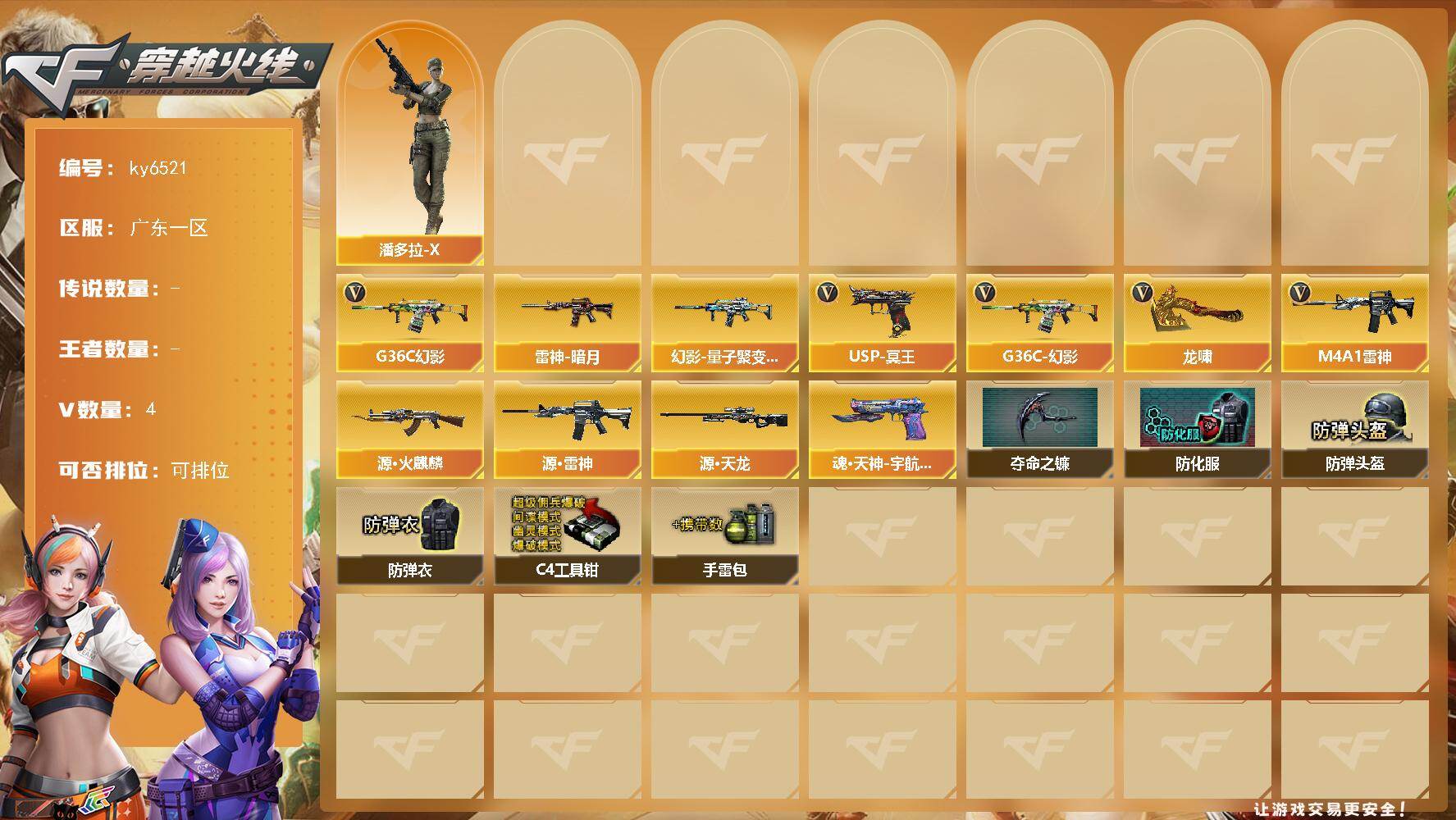 PX_2549520-4V-0王者武器数-0炫金武器数 【热门武器】:G36C-幻影 【皮肤】:幻影-量子聚变,皮肤,雷神-暗月 【角色】:潘多拉-X 【英雄级武器】:M4A1-雷神,G36C-幻影,USP-冥王,龙啸 【其他武器】:源·火麒麟,源·雷神,源·天龙,魂·天神-宇航兔兔 【道具】:夺命之镰,防化服,防弹头盔,防弹衣,C4工具钳,手雷包 【特殊枪械】: