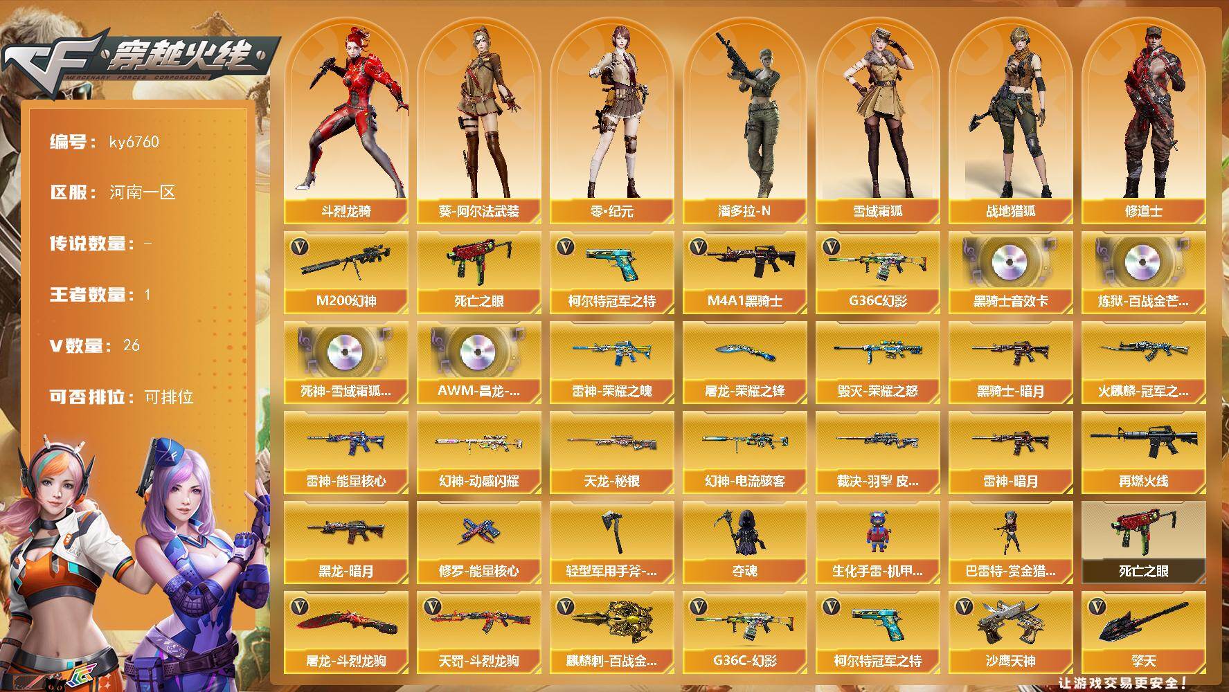 PX_2549534-26V-1王者武器数-0炫金武器数 【热门武器】:G36C-幻影,M200-幻神,死亡之眼,柯尔特-冠军之特,M4A1-黑骑士 【音效卡】:M4A1-黑骑士音效卡,炼狱-百战金芒-庆典舞曲音效卡,死神-雪域霜狐-怀旧音效卡,AWM-昌龙-怀旧音效卡 【皮肤】:幻神-动感闪耀,皮肤,幻神-电流骇客,皮肤,裁决-羽掣,皮肤,雷神-暗月,雷神-能量核心,雷神-荣耀之魄,M4A1-再燃火线,
