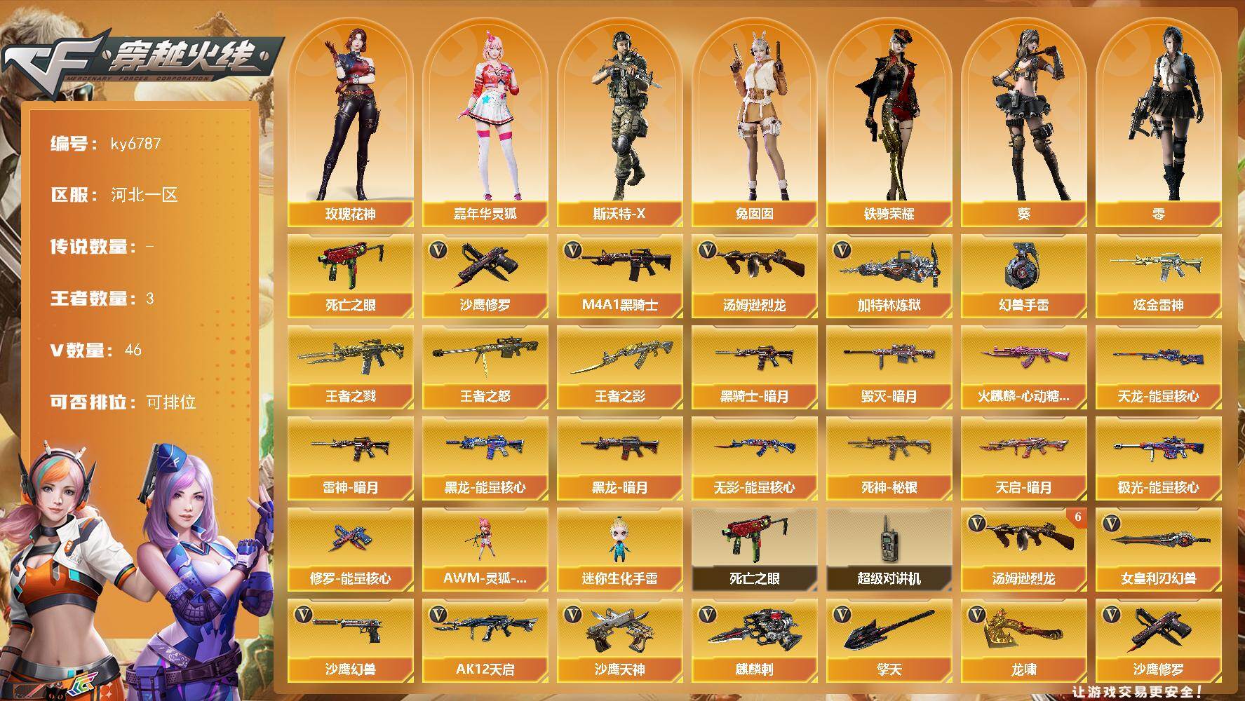 PX_2549554-46V-3王者武器数-1炫金武器数 【热门武器】:死亡之眼,M4A1-黑骑士,汤姆逊-烈龙*6,加特林-炼狱*2,沙鹰-修罗*3,高爆手雷-幻兽 【王者炫金武器】:王者之戮,王者之影,王者之怒,炫金雷神 【皮肤】:雷神-暗月,火麒麟-心动糖果,毁灭-暗月,黑龙-能量核心,黑龙-暗月,黑骑士-暗月,无影-能量核心*2,死神-秘银,天启-暗月*3,天龙-能量核心,极光-能量核心,修罗-能
