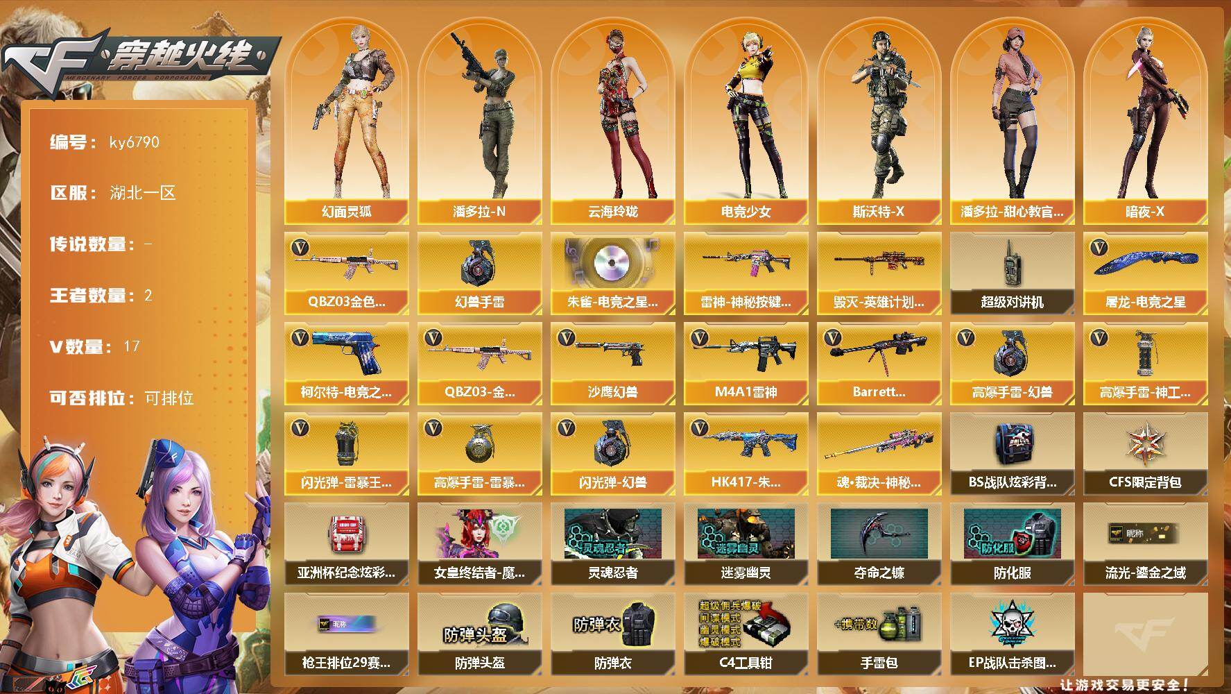 PX_2549498-17V-2王者武器数-0炫金武器数 【热门武器】:QBZ03-金色蔷薇,高爆手雷-幻兽*3 【音效卡】:HK417-朱雀-电竞之星-竞星跃动音效卡 【皮肤】:雷神-神秘按键,皮肤,毁灭-英雄计划,皮肤 【角色】:云海玲珑,幻面灵狐,暗夜-X,电竞少女,兰-海滩派对,潘多拉-X,潘多拉-甜心教官,斯沃特-X,影武者-X,潘多拉-N 【暴走生化】:超级对讲机 【英雄级武器】:M4A1-雷