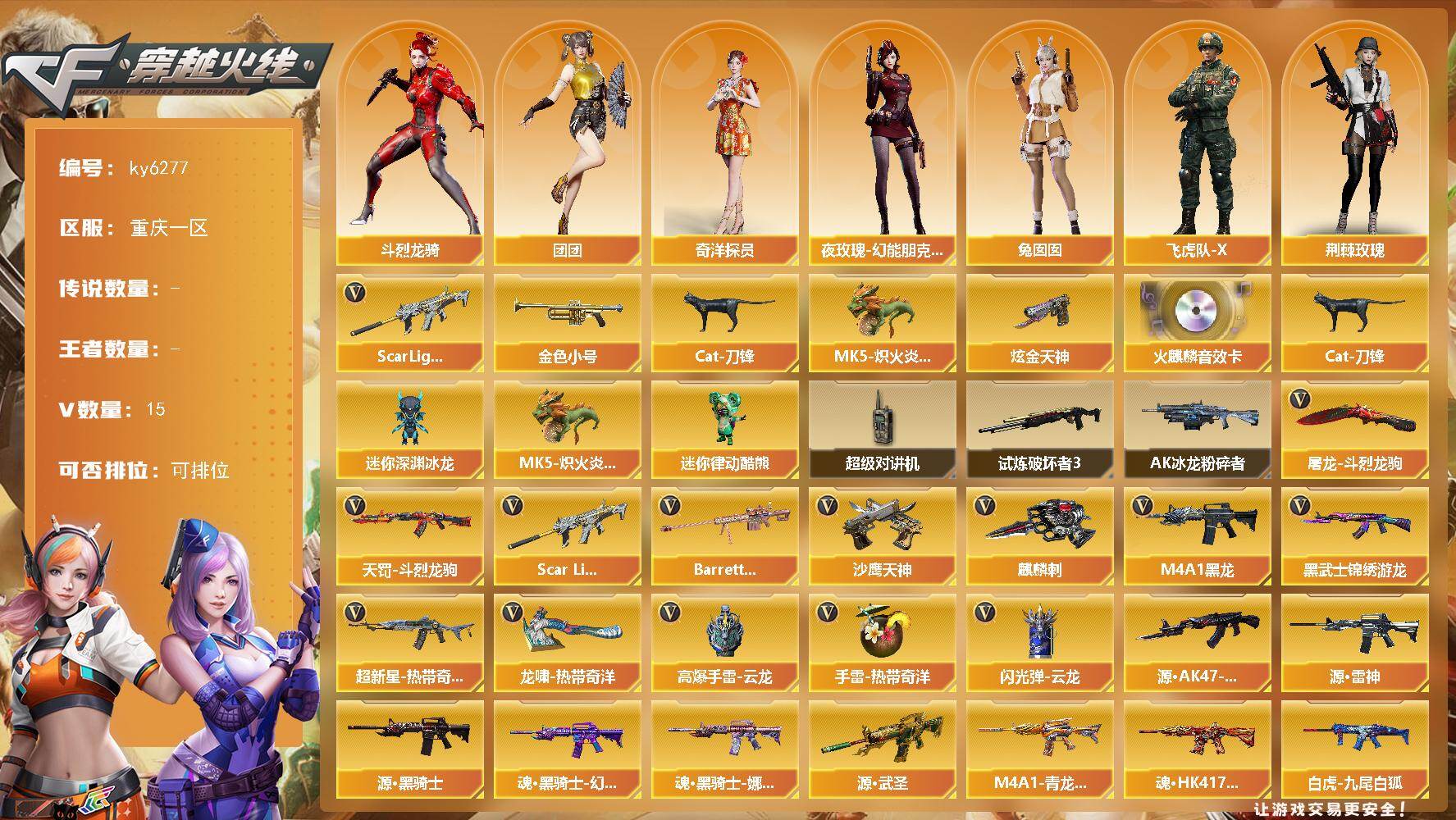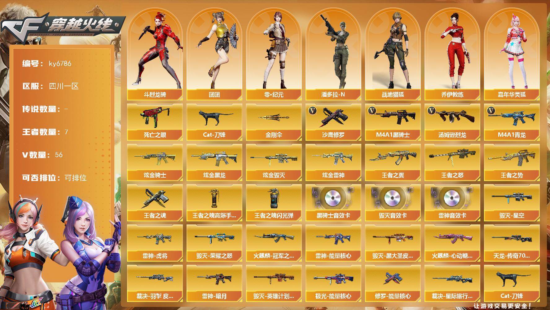 PX_2549377-12V-0王者武器数-1炫金武器数 【传说角色】:传说影煞 【热门武器】:Scar,Light-白虎,金色小号,Cat-刀锋,5-炽火炎龙 【王者炫金武器】:炫金天神 【音效卡】:AK47-火麒麟音效卡 【角色】:奇洋探员,斗烈龙骑,飞虎队-X,风暴女,荆棘玫瑰,潜龙队-X,甜心偶像,兔囡囡,夜玫瑰-幻能朋克,团团 【人偶武器】:5-炽火炎龙,迷你律动酷熊,Cat-刀锋,迷你