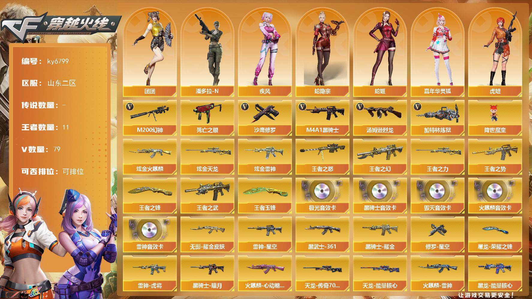 PX_2549473-81V-11王者武器数-4炫金武器数 【热门武器】:M200-幻神,死亡之眼,M4A1-黑骑士,汤姆逊-烈龙*6,加特林-炼狱,降世魔童,沙鹰-修罗*4 【王者炫金武器】:王者之幻,王者之势,王者之武*2,王者之怒,王者之力*2,王者之锋,王者玉锋,炫金火麒麟,炫金雷神,炫金天龙*2 【音效卡】:AK47-火麒麟音效卡,M4A1-雷神音效卡,M4A1-黑骑士音效卡,Barrett-毁