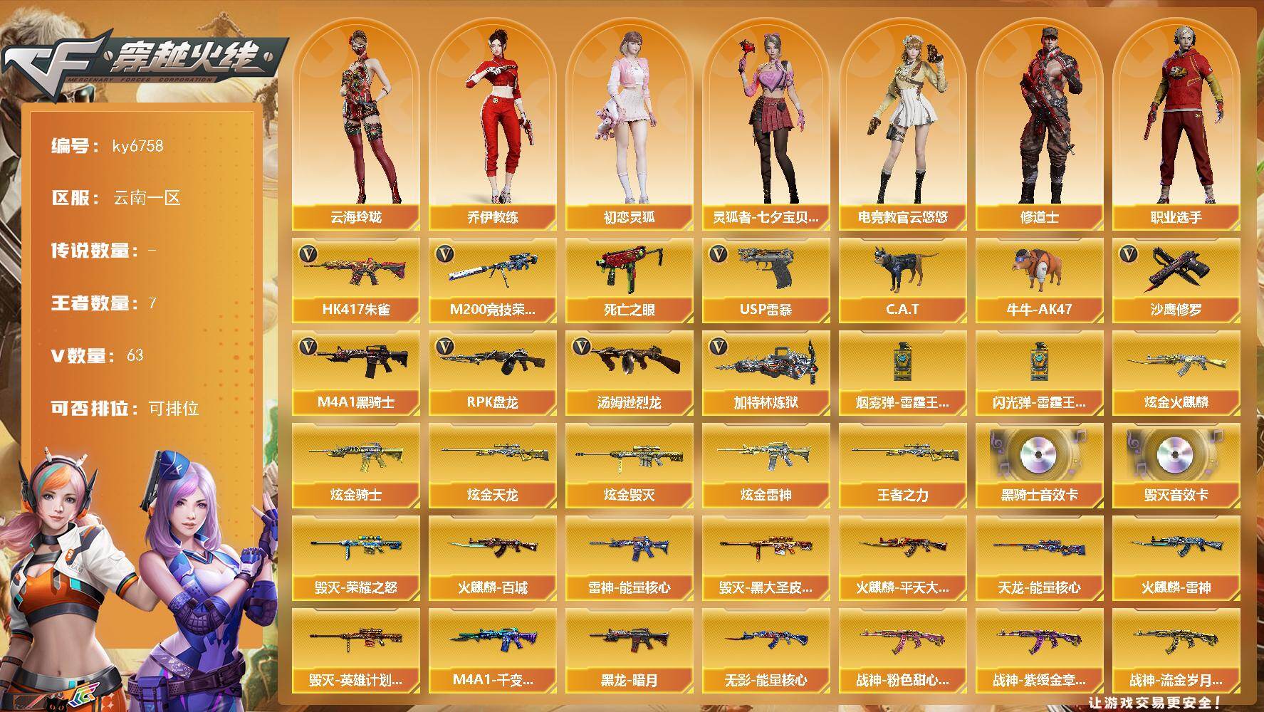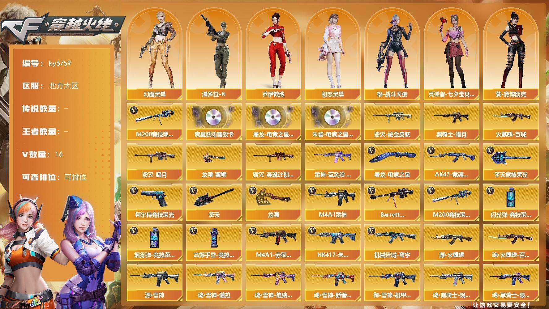 PX_2549400-17V-0王者武器数-0炫金武器数 【热门武器】:M200-竞技荣光 【音效卡】:屠龙-电竞之星-竞星跃动音效卡,QBZ03-金色蔷薇-竞星跃动音效卡,HK417-朱雀-电竞之星-竞星跃动音效卡 【皮肤】:雷神-蓝风铃,皮肤,火麒麟-百城,毁灭-暗月,毁灭耀金皮肤,毁灭-英雄计划,皮肤,黑骑士-暗月,龙啸-醒狮,皮肤 【角色】:乔伊教练,幻面灵狐,初恋灵狐,娟娟,葵-赛博朋克,灵狐者