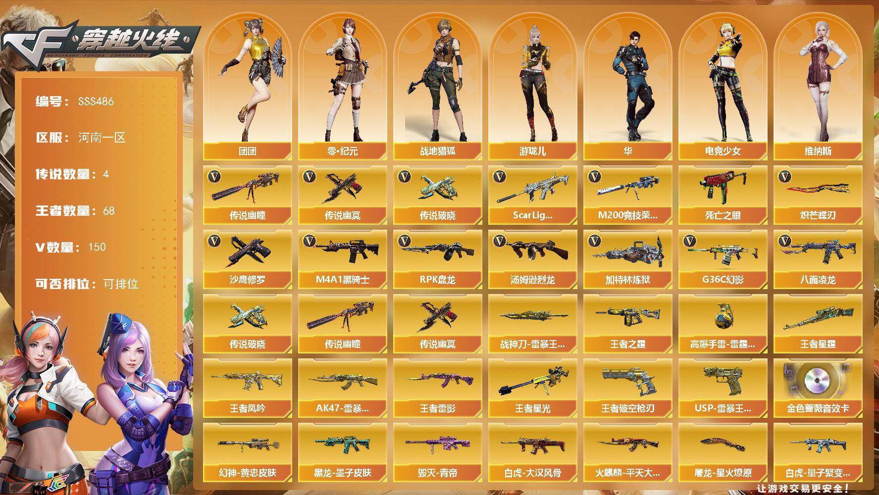 PX_2550577-181V-68王者武器数-0炫金武器数 【传说武器】:传说幽瞳,传说破晓,传说幽冥*2 【传说角色】:传说影煞,神威莲华 【热门武器】:传说幽瞳,传说破晓,传说幽冥*2,G36C-幻影,Scar,Light-白虎,M200-竞技荣光,八面凌龙,死亡之眼,M4A1-黑骑士,汤姆逊-烈龙*7,RPK-盘龙*6,加特林-炼狱,沙鹰-修罗*2,炽芒蝶刃 【王者炫金武器】:王者凤吟,AK47-