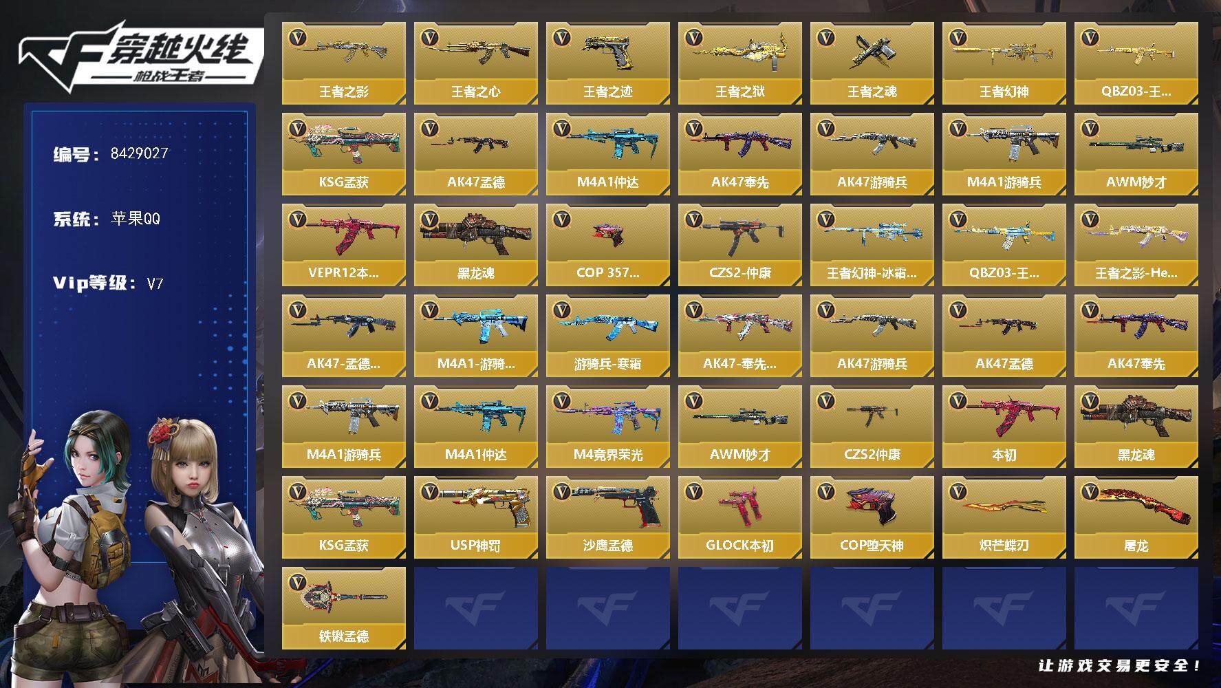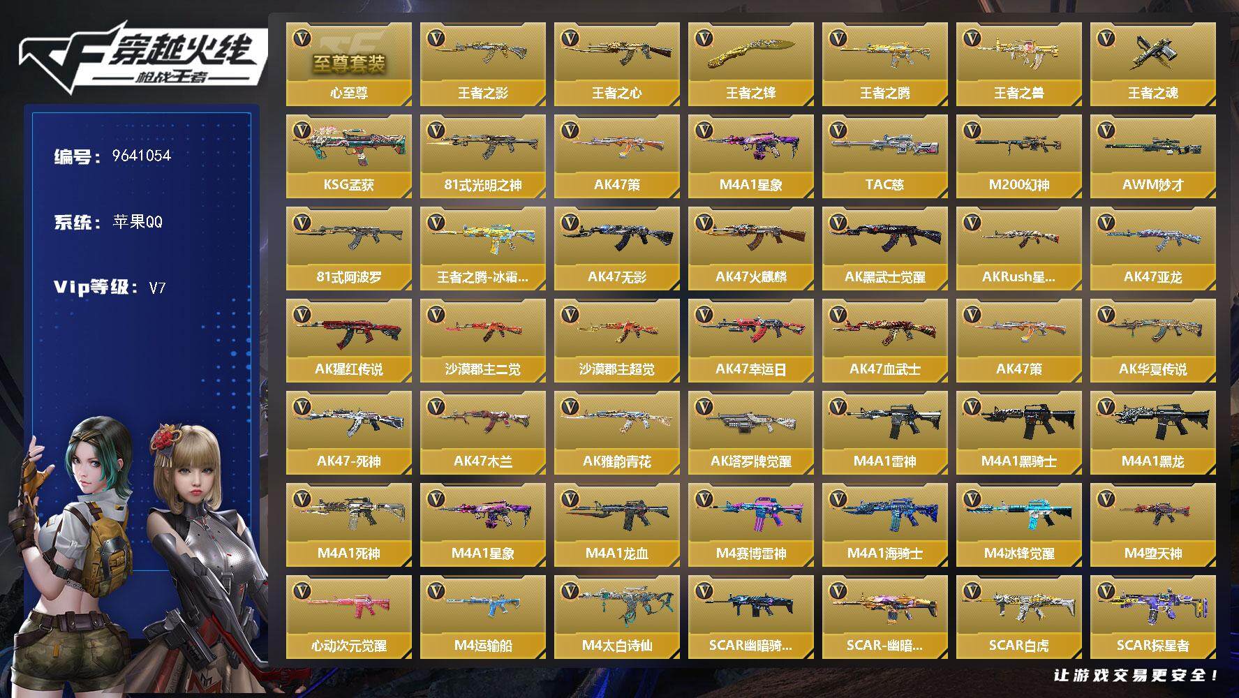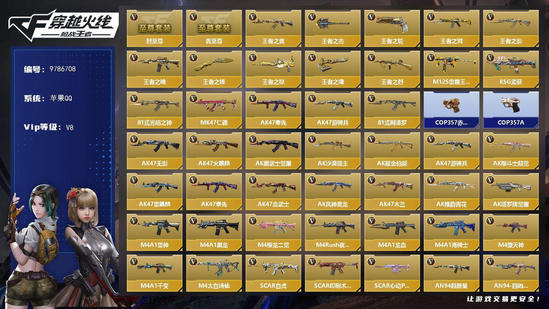 PX_2288295-??二次-苹果q-【卖号换房租!急出!!翼烈双至尊+2套王翼雷套+MK仁德+AK奉先+KSG孟获3把三国主武+7把王者版本热门主武+2把COP+热门角色香香】21王者含投掷,翼至尊,烈至尊 【王者系列】:王者之翼,王者之击,王者之轮,王者之戮,王者之影,王者之魄,王者之锋,王者之狱,王者之啸,王者之烈,M12S-雷霆王者 【热门武器】:KSG-孟获,81式-光明之神,MK47-仁德,AK47-奉先,AK47-游骑兵,81式-阿波罗,COP,357-赤龙,COP,357-A 【角色】:零,萝拉,香香,炽天使-X 【英雄武器】:AK47-无影,AK47-火麒麟*2,AK47-黑武士觉醒,AK47-沙漠领主,AK47-耀金伯爵,AK47-游骑兵,AK47-樱斗士-超觉,AK47-雷麒麟,AK47-奉先,AK47-血武士,AK47-风神翼龙,AK47-木兰,AK47-雅韵青花,AK47-塔罗牌觉醒,M4A1-雷神*2,M4A1-黑龙,M4A1-樱龙·二觉,M4A1-Rush-夜袭,M4A1-龙血,M4A1-海骑士,M4A1-堕天神,M4A1-千变,M4A1-太白诗仙,SCAR,Light-白虎,SCAR-印刷术觉醒,SCAR-心动PICK,AN94-超新星,AN94-四凶觉醒,AN94-赳赳秦师,9A91-天神,9A91-魔蜥觉醒,M14EBR-暗夜,M16-恶魔,QBZ03-金色蔷薇*2,QBZ03-玉面羞花*2,81式-光明之神,MK47-云舞,MK47-仁德,QBZ191-金甲虎啸觉醒,AWM-天龙,巴雷特-毁灭*2,巴雷特-极光,巴雷特-雷神,巴雷特-枪娘,巴雷特-安琪拉,巴雷特-冬灭,暗杀神,M200-心动次元觉醒,98K-黑骑士,VSK-94-九黎兵主觉醒,加特林-堡垒,加特林-炼狱,加特林-蟒蛇,QBB95-极光,QBB95-再战涿鹿,MK5-机械纪元,MK5-极光,王者之烈,双持斯泰尔-天使*2,A180-地狱凤凰,CBJ-MS-毒蜂,CZS2-善财童子,M12S-雷霆,PP19野牛-造纸术觉醒,嗜血金鲨,地狱烈炎,AA12-火药,KSG-孟获,M1216-血月,USP-神罚*3,USP-太白诗仙,沙鹰-修罗*3,沙鹰-天神,沙鹰-无影,气手枪-血月,沙鹰-神兵修罗,沙鹰-宇航兔兔,双持沙鹰-元让,左轮-卧龙觉醒,GLOCK18-武圣,GLO