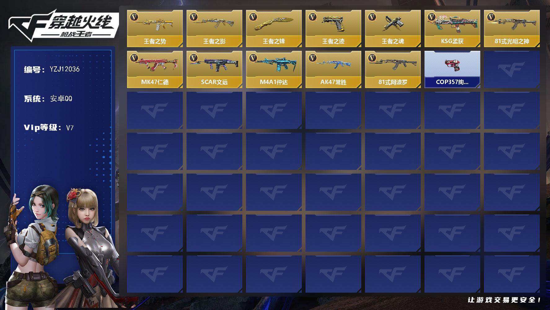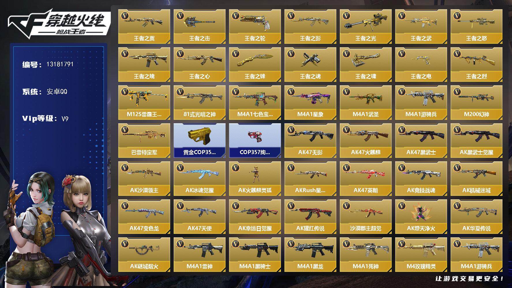 PX_2288297-可二次-安卓QQ,28王者含投掷 【王者系列】:王者之翼,王者之击,王者之轮,王者之影*2,王者之光*2,王者之武,王者之怒,王者之魄,王者之心,王者之锋,王者之魂,王者之啸,王者之电*2,王者之烈,M12S-雷霆王者 【热门武器】:81式-光明之神,M4A1-七色宝葫,M4A1-星象,M4A1-武圣,M4A1-游骑兵,M200-幻神,巴雷特-定军,黄金COP,357,COP,357-绚樱*3 【角色】:葵,龙野,幽灵刀锋-觉醒,樱,香香,关小雨*2,蝴蝶,雅典娜,祝融夫人 【英雄武器】:AK47-无影,AK47-火麒麟,AK47-黑武士,AK47-黑武士觉醒,AK47-沙漠领主,AK47-冰魂觉醒,AK47-火麒麟-灵狐,AK47-Rush-星速,AK47-英朗,AK47-竞技战魂,AK47-机械迷城,AK47-变色龙,AK47-天使,AK47-幸运日觉醒,AK47-猩红传说,AK47-沙漠郡主-超觉,AK47-燎天净火,AK47-华夏传说,AK47-谜城烟火,M4A1-雷神*2,M4A1-黑骑士*2,M4A1-黑龙,M4A1-死神*3,M4A1-玫瑰精灵,M4A1-游骑兵,M4A1-沙漠领主,M4A1-枪娘,M4A1-君威GS,M4A1-武圣,M4A1-卧龙觉醒,M4A1-星象,M4A1-樱龙·超觉,M4A1-变色龙,M4A1-雷神-萝拉,M4A1-七色宝葫,M4A1-运输船*2,M4A1-铁胆虎魄,QBZ95-天使,SCAR-幽暗骑士觉醒,SCAR-印刷术,剑齿虎,AN94-超新星,剑齿虎-炫彩,AN94-赳赳秦师,9A91-死神,M14EBR-暗夜觉醒,AK12-天启*2,QBZ03-湮灭,QBZ03-金色蔷薇,QBZ03-玉面羞花,HK417-炎龙铠甲,81式-光明之神,AWM-天龙,AWM-大湾溢彩,巴雷特-毁灭*4,巴雷特-极光*5,巴雷特-雷神,巴雷特-枪娘,巴雷特-定军,巴雷特-变色龙,巴雷特-冬灭,暗杀神,M200-幻神,09式狙-天神,MR1-龙吟惊沧海,RPK-赤炎盘龙,MG3-雏凤,加特林-炼狱,刘易斯-血月,MK5-机械纪元,MK5-极光,寒霜烈龙,王者之烈,双持斯泰尔-天使*2,斯泰尔-恶魔,斯泰尔-幻兽,斯泰尔-蝴蝶,QCW05-未来战士,地狱火,嗜血金鲨,地狱烈炎*2,亡命之徒-幻兽,KSG-黑骑士,M1887-
