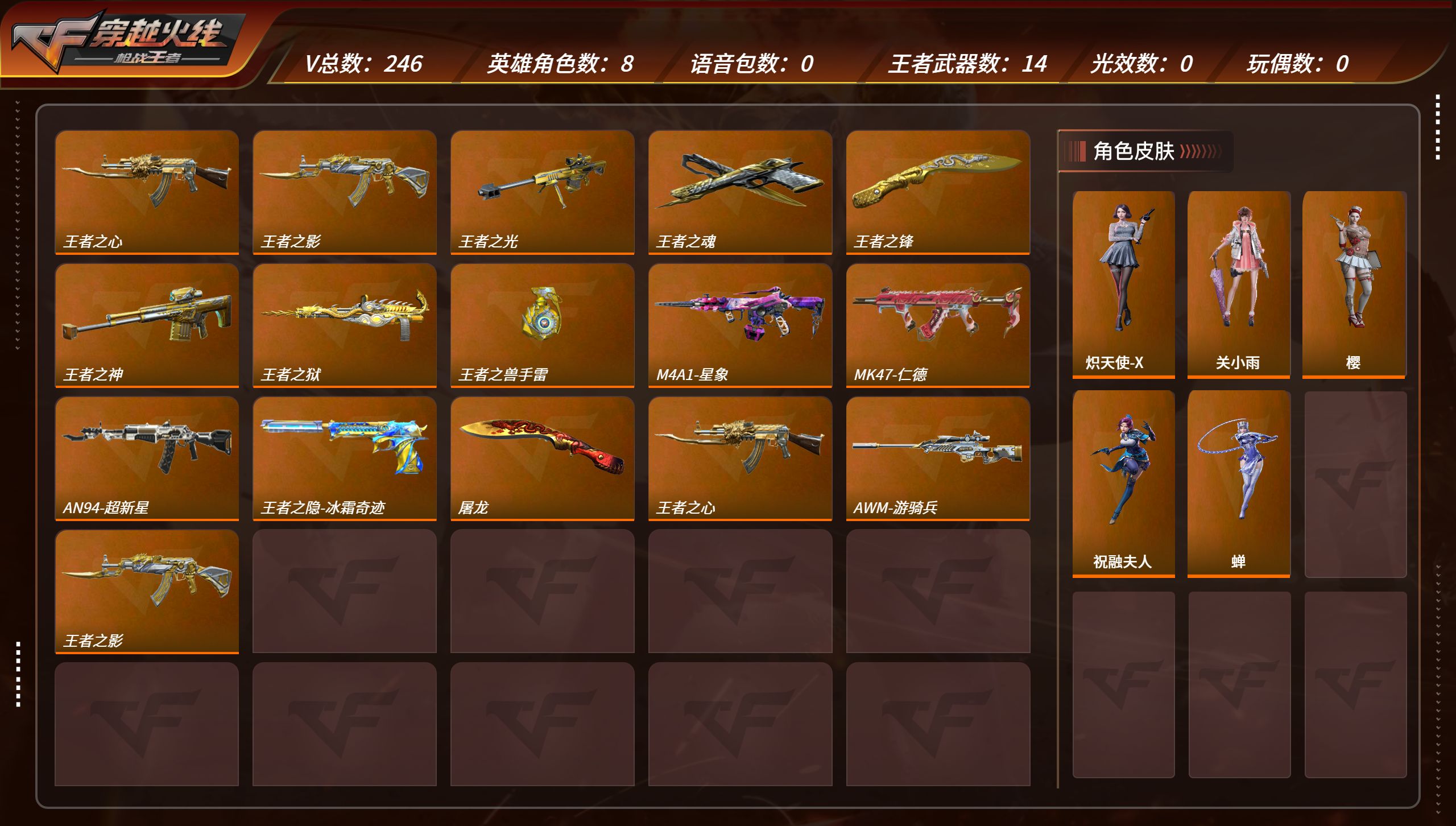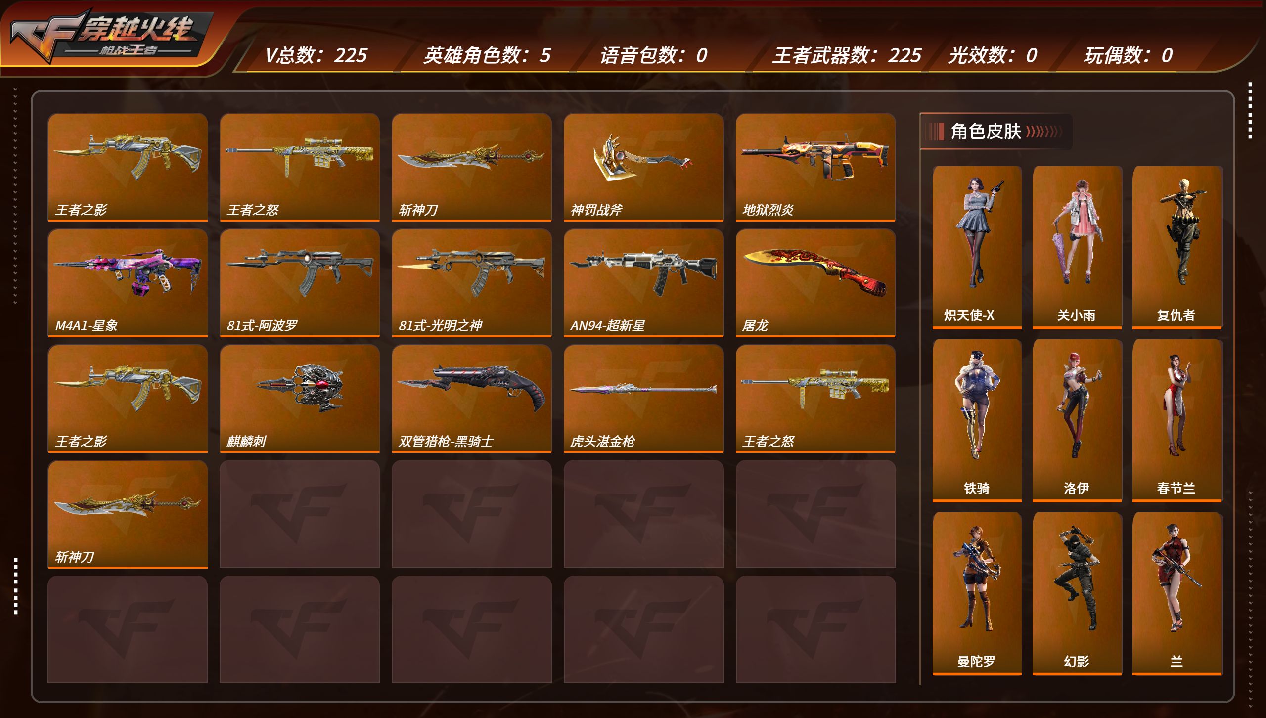 PX_2276565-3,安卓Q,225V,226金V,,王影冰皮,王者之怒,星象 【金V角色】龙野,葵,关小雨,零-水下丽影,炽天使-X 【金V武器】沙鹰-修罗,巴雷特-毁灭,地狱烈炎,M4A1-卧龙,M4A1-雷神,AK47-冰魂觉醒,马来剑-毁灭,屠龙,AK47-角斗士,沙鹰-天神,沙鹰-天神,黑武士手雷,黑武士烟雾弹,双持斯泰尔-天使,斩神刀,王者之怒,龙啸,沙鹰-火麒麟,M4A1-樱龙·二觉,血月,AK47-火麒麟,擎天,巴雷特-极光,死神手雷,沙鹰-飞电,CZ75-死神,沙鹰-无影,AN94-超新星,沙鹰-修罗,USP-神罚,麒麟刺,黑武士闪光弹,M4A1-星象,黑武士闪光弹,USP-神罚,死神烟雾弹,死神闪光弹,AK47-樱斗士-二觉,火麒麟烟雾弹,火麒麟手雷,火麒麟闪光弹,AK47-耀金伯爵,死神手雷,死神闪光弹,死神烟雾弹,激光短刃-黑骑士,血阳,沙鹰-修罗,AK47-Rush-星速,燃烧弹-游骑兵,AK47-机械迷城,M4A1-死神,巴雷特-毁灭,AK47-无影,巴雷特-毁灭,战斧-无影,AWM-天龙,改装GLOCK-黑龙,AK47-竞技战魂,加特林-堡垒觉醒,沙鹰-修罗,屠龙,沙鹰-修罗,QSZ92-天使,沙鹰-修罗,QSZ92-天使,气手枪-炼狱,QBZ19-天使,巴雷特-变色龙,双持沙鹰-变色龙,双持尼泊尔-变色龙,地狱火,双截棍-天使,AK47-变色龙,龙啸,马来剑-毁灭,屠龙,屠龙,M14EBR-暗夜觉醒,竞技战魂闪光弹,剑齿虎-炫彩,刘易斯-血月,MR1-龙吟惊沧海,5-极光,巴雷特-极光,巴雷特-毁灭,QSZ92-天使,AK47-幸运日觉醒,黑龙刺,AK47-雷麒麟,M4A1-机械迷城,M200-心动次元,马来剑-毁灭,M4A1-心动次元,M4A1-心动次元,AK47-心动次元,AK47-血武士,M4A1-运输船,屠龙,CZS2-心动次元,黑骑士手雷,手雷-竞界荣光,死神闪光弹,嗜血金鲨,AK47-血武士,PP19野牛-造纸术,47-鼓龙,巴雷特-毁灭,81式-光明之神,星芒,47-云舞,巴雷特-冬灭,双管猎枪-黑骑士,唐刀-华夏传说,龙鳞-觉醒,AK47-沙漠郡主-超觉,USP-神罚,SCAR-幽暗骑士觉醒,神罚战斧,沙鹰-神兵修罗,AK47-轮回,KSG-火力竞放,SCAR-印刷术,双持斯泰尔-天使,黑骑士烟雾弹,QBZ03-玉面羞花,燃烧弹-黑骑士,燃烧弹-黑骑士,燃烧弹-黑骑士,燃烧弹-黑骑士,燃烧弹-黑骑士,黑骑士闪光弹,改装GLOCK-木兰,百战巾帼枪,AK47-木兰,AK47-火麒麟,M4A1-太白诗仙,神罚战斧,KSG-极光,M4A1-猎神,M4A1-海骑士,M4A1-夏清,王者之影,QBZ191-金甲虎啸觉醒,屠龙,USP-太白诗仙,CBJ-MS-毒蜂,AA12-火药,AK47-火麒麟,麒麟刺,AK47-麒麟,马来剑-毁灭,M4A1-赛博雷神,M4A1-雷神,死神闪光弹,虎头湛金枪,HK417-朱雀,AWM-指南针,高爆手雷-神工天巧,09式狙-天神,地狱火,巴雷特-毁灭,AK47-黑武士觉醒,09式狙-天神,星芒,KSG-孟获,唐刀-大唐荣耀,烟雾弹-星际宇航,98K-黑骑士,沙鹰-宇航兔兔,燃烧弹-游骑兵,闪光弹-游骑兵,烟雾弹-游骑兵,M4A1-黑骑士,QBZ191-帝皇铠甲,尼泊尔-冰锋觉醒,沙鹰-修罗-现代金属,巴雷特-毁灭-寒霜,M4A1-雷神-RGB骇客,屠龙-星空,龙啸-RGB骇客,AK47-火麒麟-雷掣战翼,巴雷特-极光-淬意蝶舞,死神手雷-暗月,沙鹰-无影-暗月,沙鹰-修罗-现代金属,麒麟刺-魔神,死神烟雾弹-暗月,火麒麟烟雾弹-暗月,火麒麟手雷-暗月,火麒麟闪光弹-寒霜,死神手雷-暗月,死神烟雾弹-暗月,沙鹰-修罗-现代金属,AK47-星速-纸片,燃烧弹-游骑兵-紫魇,巴雷特-毁灭-寒霜,AK47-无影-不屈老兵,巴雷特-毁灭-寒霜,战斧-无影-暗月,AWM-天龙-魔神,沙鹰-修罗-现代金属,屠龙-星空,沙鹰-修罗-现代金属,沙鹰-修罗-现代金属,屠龙-星空,屠龙-星空,巴雷特-极光-淬意蝶舞,巴雷特-毁灭-寒霜,黑龙刺-暗月,屠龙-星空,黑骑士手雷-诸神黄昏,81式-光明之神-三足金乌,黑骑士闪光弹-能量核心,AK47-火麒麟-能量核心,王者之影-冰霜奇迹,AK47-火麒麟-能量核心,M4A1-雷神-星空,98K-黑骑士-能量核心,燃烧弹-游骑兵-紫魇,M4A1-黑骑士-现代金属 【银V武器】源·AK47-黑武士,源·左轮-黑武士,源·浴火麒麟-初心,源·擎天,源·惊天雷神-初心,M4A1-紫狱,源·M4A1-青龙,AK47-泰坦破坏者Ⅱ,M4A1-机械龙血,SPAS12-雷电核心,源·屠龙,左轮-雷电核心,源·M4A1-海骑士,源·AK47-华夏传说,AK47-召唤,源·SCAR-探星者,源·QCW05-变形金刚·大黄蜂,源·左轮-黑武士,源·惊天雷神-初心,源·AWM-天龙,源·惊天雷神-初心,源·AWM-天龙,源·AK47-谜城烟火,源·QBZ191-封神榜 【铜V武器】焕·蝴蝶刀,AK47-雷斯库瓦-觉醒,焕·M4A1-S,焕·斯泰尔-月神,SCAR-电竞荣耀·情久,漫·环保98K,AK47-牛魔王,白骨刃,M4A1-电竞荣耀·LGD,闪光弹-浪子娃,沙鹰-鹰眼娃,AK47-喷火娃,烟雾弹-隐身娃,闪光弹-浪子娃,KSG-悟能,G36-竞技亚魂,丛林匕首-庆龙,P90-突突兔,81式-阿波罗,QBZ97-岚,TAC-晴,G3A3-五色琉璃,SKS-女妖之咒,AK47-塔罗牌,柯尔特-伏刹山海 【史诗武器】风之子,黄金AK47,黄金QCW05,香蕉匕首,黄金锅-2018S2限定,黄金AWM-A,M4A1-XM-赢家,双持沙鹰-幽灵,M4A1-飞龙在天,沙鹰-飞龙在天,巴雷特-飞龙在天,铁锹-飞龙在天,AK47-飞龙在天,黄金MG3,红红火火手雷,98K-烛龙,黄金AK47-A,AK47-烛龙,黄金NAR,黄金零号,QBZ95-烛龙,手斧-御龙,毛瑟-御龙,AK47-铸魂,QBZ03-烛龙,疾火-流星,黄金M249,黄金拖鞋,AK47-惊魂骑士,AK47-死亡之翼,AK47-蜂鸟,黄金M14EBR,黄金手斧,AWM-深海猎手,黄金温切斯特,牛牛烟火,五色石闪光弹,欢声雷动闪光弹,左轮-金韵,黄金野牛,军用铁铲-金韵,AWM-暗杀之眼,CZS2-圣婴,黄沙剑,QBZ95-泰坦,M4A1-S-脉动,GLOCK18-小金刚,电磁机甲拳套,左轮-麟龙,斯泰尔-赤龙,23-湛蓝裂痕,黄金沙鹰-A,龙虾钳,集装箱闪光弹,黄金足球奖杯,AK47-御龙,黄金乌兹双枪,沙鹰-银角大王,双刃-昼伏夜影,AN94-四凶,HK416-黑石猴,巴雷特-麟龙,QBZ03-麟龙,燃烧弹-烛九阴·昼,高爆手雷-狙击高手,改装GLOCK-排插军迷,AN94-游戏主播,军用铁锹-