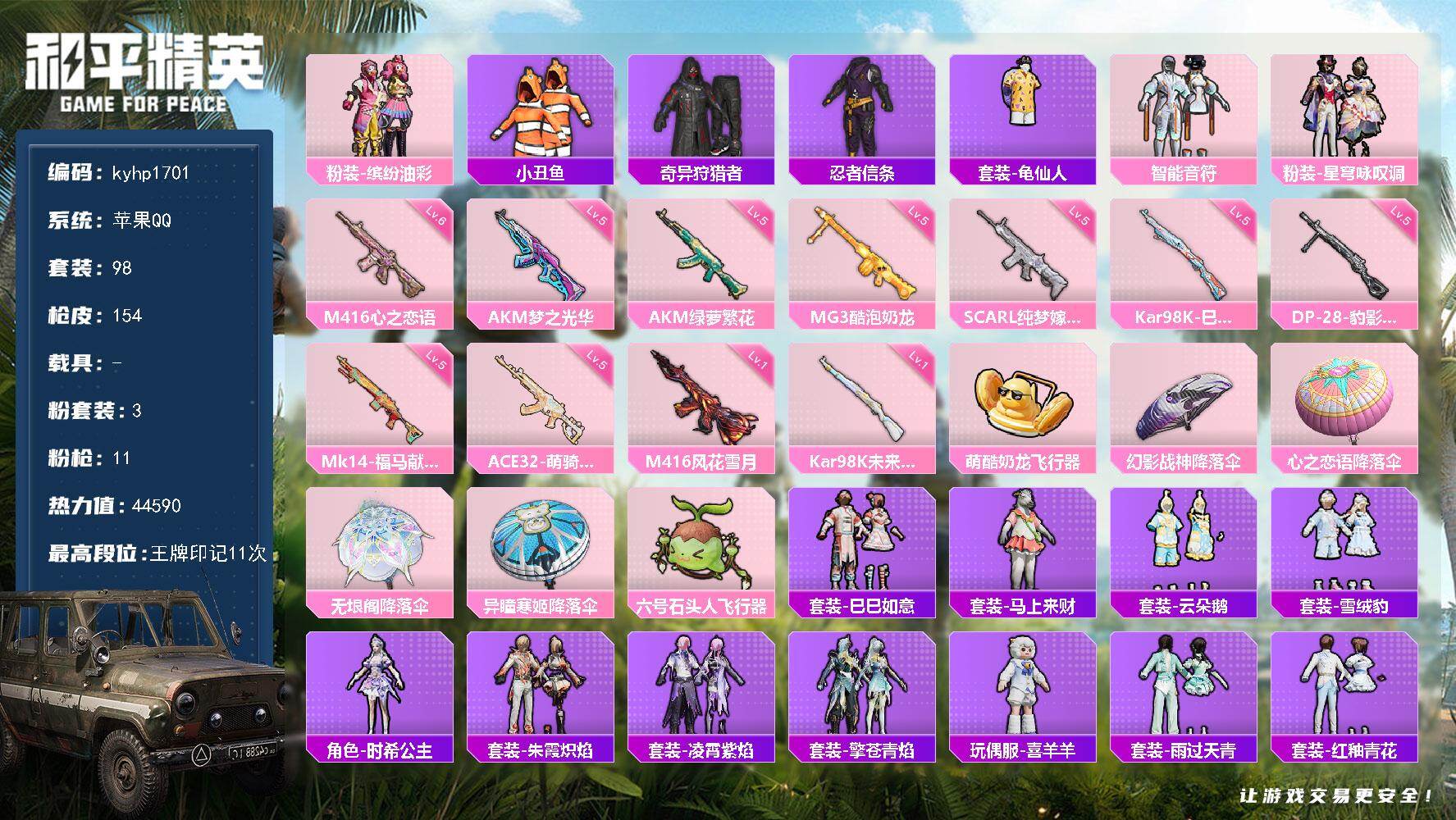 PX_2554780--3粉装-11特效枪-0载具-2粉色飞行器-44590热力值-11王牌印记-98套装-154枪皮 【热门品类】:粉装-缤纷油彩,套装-小丑鱼,套装-奇异狩猎者,套装-忍者信条,套装-龟仙人 【粉色套装】:粉装-智能音符,粉装-缤纷油彩,粉装-星穹咏叹调 【粉色枪皮等级】:AKM-梦之光华(五级),AKM-绿萝繁花(五级),SCAR-L-纯梦嫁纱(五级),M416-心之恋语(六级),M
