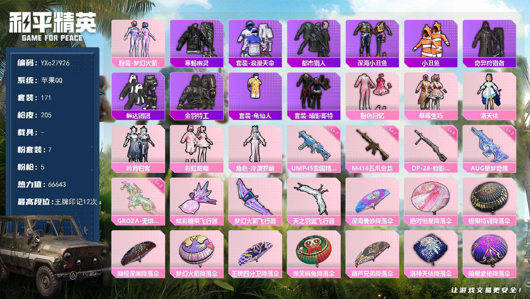 PX_2554795-??,都市,新101,3级AUG星梦,胖达,满地铁天赋】YXc27926-【无二次协助处理】【因赛季更新游戏段付以上号为准!】 ,苹果Q-5稀有7粉装5特效枪26热门171套装205枪皮,,12印记,历史超级王牌13星, 【5稀有】,奇异狩猎者,寒蝎幽灵,AKM-缤纷海域,都市猎人,浪漫天命, 【7粉装】,梦幻火箭,洛天依,冷漠罗丽,粉色回忆,草莓生巧,彩虹甜喵,吟月归客, 【5特效枪】,M416-五爪金龙,(7级),GROZA-无垠阁,(3级),UMP45-雪国精灵,(7级),DP-28-豹影疾电,(5级),AUG-星梦奇缘,(3级), 【26热门】,小丑鱼,龟仙人,呆萌铁蟹,鹰眼刺客,激萌罗小黑,迅捷狂鲨,深海小丑鱼,金羽特工,胖达团团,裁决冥王,暗影哥特,团圆交子,瑞龙福将,水银刺客,狂沙舞者,漫步者,英勇保护者,弄潮海豚,M416-快乐主宰,AKM-奇异狩猎者,M762-奇异狩猎者,M762-瑞龙福将,M24-奇异狩猎者,S686-奇异狩猎者,Kar98K-深海曼妙,GROZA-林间仙鹿, 【2飞行器】,梦幻火箭飞行器,天之羽翼飞行器, 【3头盔】,梦幻火箭头盔,幻影战神头盔,深海小丑鱼头盔, 【4背包】,酷熊伴侣背包,梦幻火箭背包,深海小丑鱼背包,神秘黑猫背包,