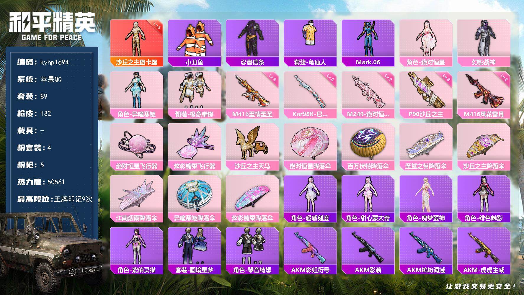 PX_2554829--1神装-4粉装-5特效枪-0载具-3粉色飞行器-50561热力值-9王牌印记-89套装-132枪皮 【红色神装等级】:沙丘之主-图卡盟(五级) 【红色角色神装】:沙丘之主-图卡盟 【热门品类】:套装-小丑鱼,套装-忍者信条,套装-龟仙人,角色-Mark.06 【粉色套装】:角色-绝对恒星,粉装-幻影战神,角色-异瞳寒姬,粉装-极意拳锋 【粉色枪皮等级】:M416-风花雪月(二级),