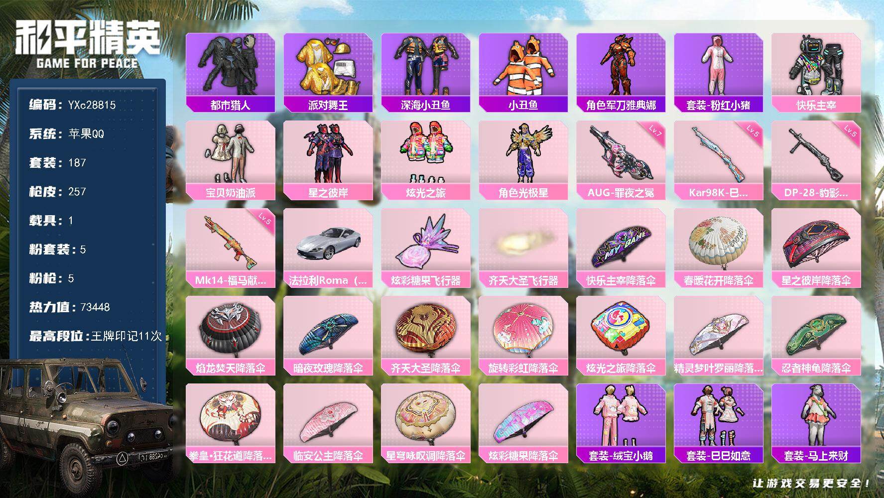PX_2554868-??满天赋,都市,金鞋】YXc28815-【可二次】【因赛季更新游戏段付以上号为准!】 ,苹果Q-4稀有1载具5粉装5特效枪16热门187套装257枪皮,,11印记,历史卓越王牌8星, 【4稀有】,AKM-缤纷海域,都市猎人,派对舞王,派对舞王(金靴子), 【1载具】,法拉利Roma(纽博格林银), 【5粉装】,光极星,宝贝奶油派,炫光之旅,快乐主宰,星之彼岸, 【5特效枪】,Kar98K-巳巳如意,(5级),DP-28-豹影疾电,(5级),AUG-罪夜之冕,(7级),Mk14-闲梦青缨,(7级),Mk14-福马献瑞,(5级), 【16热门】,小丑鱼,雪山精英,呆萌铁蟹,鹰眼刺客,迅捷狂鲨,深海小丑鱼,团圆交子,瑞龙福将,粉红小猪,漫步者,破蛋小黄鸡,极速红龙,军刀雅典娜,M416-快乐主宰,M762-瑞龙福将,AUG-魔法学院, 【1飞行器】,齐天大圣飞行器, 【2头盔】,金曜白虎头盔,深海小丑鱼头盔, 【1背包】,梦幻火箭背包