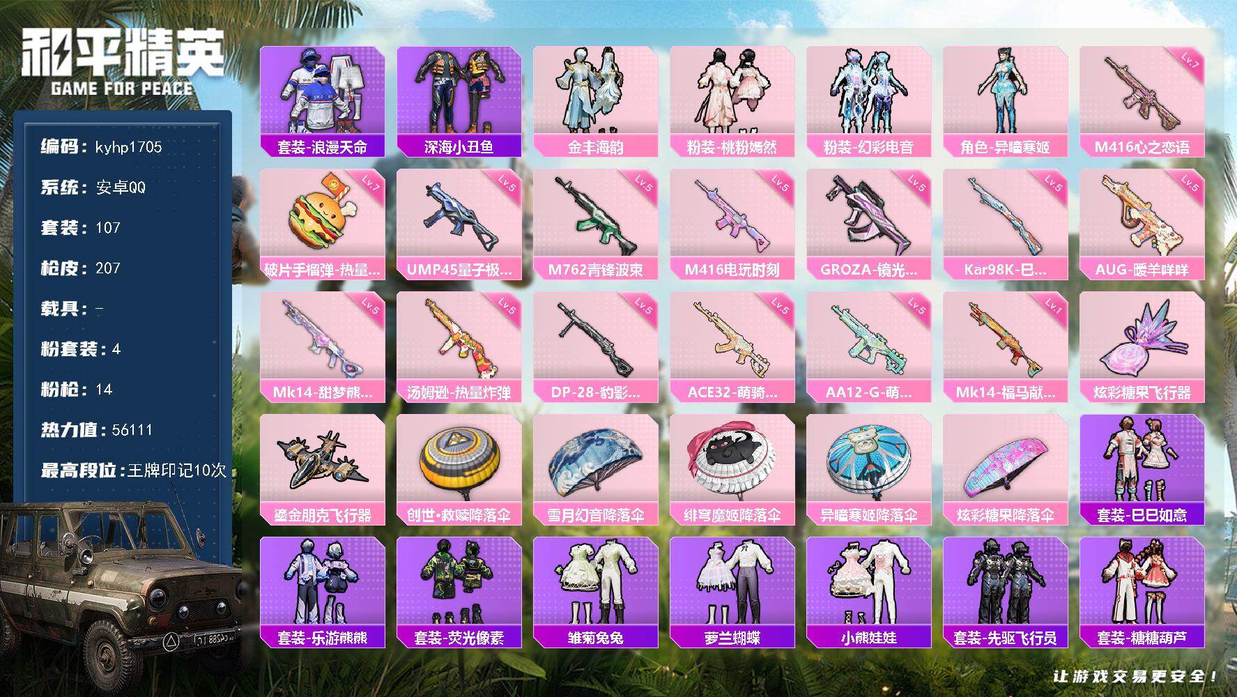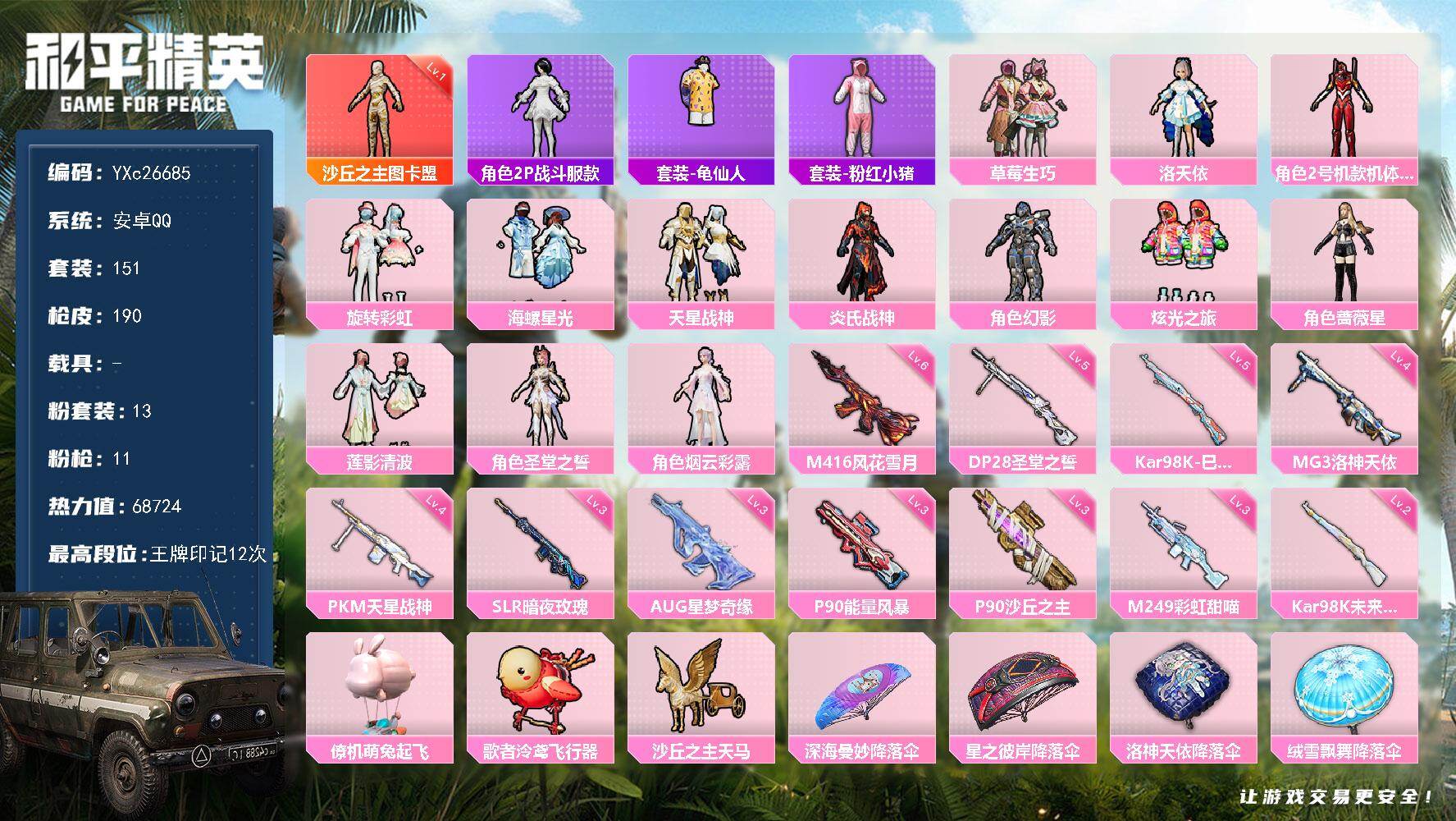 PX_2554851-安卓,手Q-5粉装-1特效枪-1载具-1粉色飞行器-35278热力值-1王牌印记-128套装-97枪皮 【热门品类】:粉装-雪国幻梦,套装-浪漫天命,熔岩游骑兵连帽夹克 【粉色套装】:粉装-守护骑士,粉装-火曜朱雀,粉装-土曜战麒,粉装-金曜白虎,粉装-雪国幻梦 【粉色枪皮等级】:M416-五爪金龙(六级) 【粉色载具】:玛莎拉蒂Ghibli(蓝) 【粉色枪皮】:M416-五爪金龙 【粉色降落伞】:凝视深渊降落伞,甜心宝贝降落伞,至尊龙雀降落伞,橘柚倾心降落伞 【稀有枪皮】:AKM-冰凉西瓜,AKM-灼热熔岩,AKM-生命誓言,AKM-虎虎生威,M16A4-凝视深渊,M16A4-幻世战舞者,M16A4-生命誓言,M16A4-红色方程式,SCAR-L-凝视深渊,SCAR-L-生命誓言,SCAR-L-雷霆特警,M416-时之沙漏,GROZA-生命誓言,GROZA-雷霆特警,AUG-凝视深渊,AUG-耀粉歌者,QBZ-彩虹符号,QBZ-诡娃娃,QBZ-飞驰魅影,M762-折纸暴龙,M762-牛气冲天,M762-甜心宝贝,M762-诡娃娃,Mk47-粉色回忆,G36C-荒野猎神,G36C-雪国精灵,UZI-炫彩节奏,UMP45-狮舞迎春,UMP45-诡娃娃,UMP45-金玉无双,Vector-生命誓言,P90-飞驰魅影,Kar98K-彩虹符号,Kar98K-狮舞迎春,Kar98K-王子的夏天,Kar98K-飞驰魅影,M24-冰封烈焰,AWM-荒野猎神,SKS-诡娃娃,VSS-雷霆特警,Mini14-时之沙漏,Mini14-生命誓言,Mini14-耀粉歌者,Mini14-金鼠迎春,S686-冰封烈焰,S686-未来战士,S686-生命誓言,S1897-飞驰魅影,S12K-破晓战魂,S12K-幻世战舞者,M249-工程核心,M249-百万伏特,M249-破晓战魂,DP-28-未来战士,MG3-幻世战舞者,P92-雷霆特警,P1911-冰封烈焰,蝎式手枪-欢乐香蕉 【其他套装】:套装-SS3特训,套装-SS4特训,套装-SS5特训,套装-SS6特训,套装-SS7特训,套装-SS8特训,套装-SS9特训,套装-SS11特训,套装-SS12特训,套装-SS13特训,套装-SS14特训,套装-SS17特训,套装-SS19特训,套装-SS20特训,套装-SS21特训,套装-丛林猎人,套装-云虎纪,套装-人气偶像,套装-传奇侦探,套装-六六大吉,套装-冷焰舞者,套装-半糖蓝莓,套装-夏日音浪,套装-好奇恐龙,套装-完美偶像,套装-幻世战舞者,套装-幻影武者,套装-怒火燎原,套装-战地督导,套装-探宝勇士,套装-攀登者,套装-春日漫步,套装-朋克治安官,套装-极速红龙,套装-格斗先锋,套装-橘黑制服,套装-沙漠兵团,套装-沙漠雄狮,套装-浪漫天命,套装-海滨突袭者,套装-深蓝色名流,套装-湖蓝色名流,套装-滨海假日,套装-潮流先锋,套装-灼焰舞者,套装-炫蓝之夏,套装-热血青春,套装-燃烧卡路里,套装-爆竹金鼠,套装-牛气满满,套装-特战装甲,套装-特种空勤,套装-特训学院,套装-狂沙舞者,套装-猎鹰,套装-猛禽,套装-甜蜜告白,套装-疯狂小兔子,套装-白色伏地魔,套装-破蛋小黄鸡,套装-福星高照,套装-空岛之星,套装-空投萌叽,套装-竞技勇士朋克,套装-竞技名士,套装-竞技达人朋克,套装-红色运动,套装-绮丽涂鸦,套装-耀眼新星,套装-蓝彩潮人,套装-蓝色守护者,套装-蓝色运动,套装-街头潮人,套装-都市漫游者,套装-都市魅力,套装-酒红色名流,套装-野性战心,套装-野性战魂,套装-金鼠迎春,套装-长空猛禽,套装-阳光火鸡,套装-青年教官,套装-青涩时光,套装-骑行爱好者,套装-魅力单车,套装-黄色伏地魔,套装-黄色名流,套装-黄色运动,套装-黑色伏地魔,套装-龙腾端午,套装-无烬之地,套装-甜蜜菠萝,套装-战地菁英,套装-派对绅士,套装-极地朋克,套装-恒星战甲,套装-和平特警,套装-夜莺强袭者,套装-风暴特警,套装-冰川特警,套装-雷霆特警,套装-冷血极客,套装-梦魇先生,套装-坚韧舞者,套装-黑夜传说,套装-万圣娃娃,套装-森林猎手,套装-凛冬战士,套装-雪山精英,套装-雪山征服者,套装-熔岩使者,套装-裁决冥王,套装-浴火魔神,套装-奇趣章鱼,套装-摩艾涂鸦,套装-时之沙漏,套装-维京奇缘,套装-圣诞大吉,套装-飞驰魅影,套装-音速流光,套装-水晶王族 【稀有头盔】:银河战甲头盔(3级),雪国精灵头盔(3级),雪国精灵头盔(2级),雪国精灵头盔(1级),折纸暴龙头盔(1级),土曜战麒头盔(3级),土曜战麒头盔(2级),土曜战麒头盔(1级),甜心宝贝头盔(3级),甜心宝贝头盔(1级) 【稀有背包】:银河战甲背包(3级),银河战甲背包(2级),雪国精灵背包(3级),雪国精灵背包(2级),雪国精灵背包(1级),折纸暴龙背包(2级),木曜青龙背包(3级),木曜青龙背包(2级),木曜青龙背包(1级),水曜玄武背包(3级),水曜玄武背包(2级),水曜玄武背包(1级),甜心宝贝背包(2级),夏日绵绵冰背包(1级) 【营地ID】:569208614