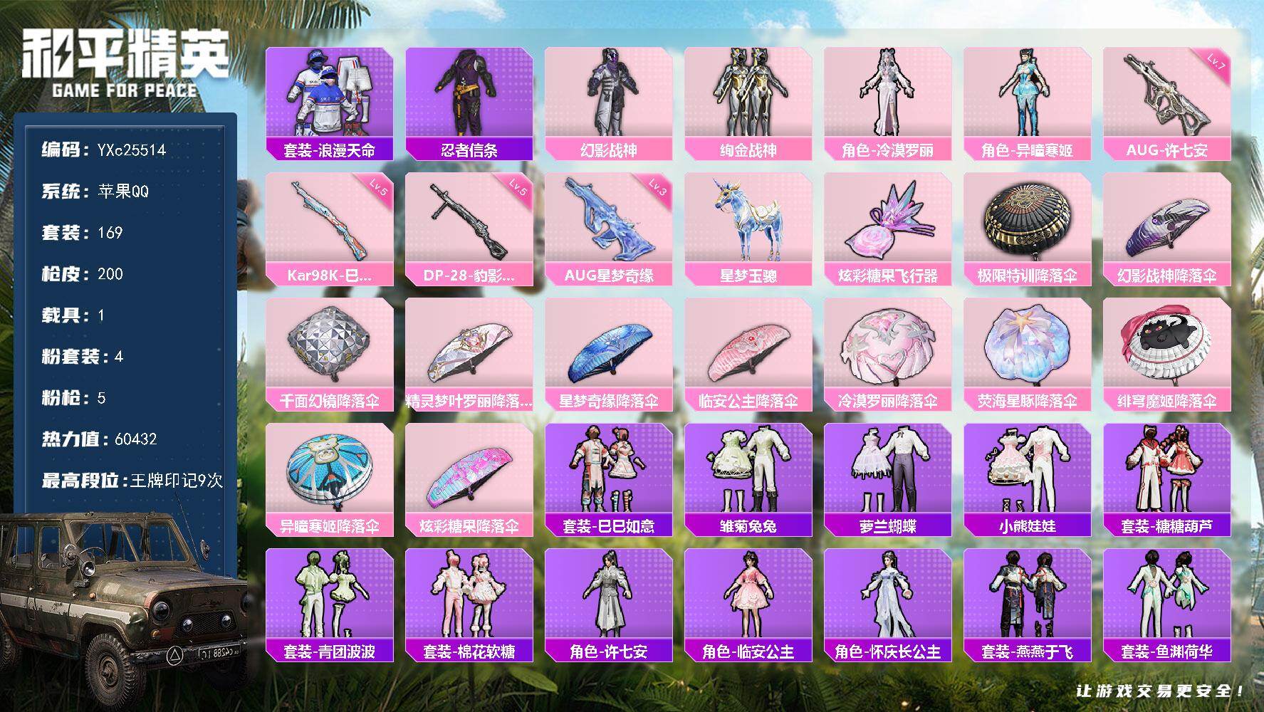 PX_2554819-星梦AUG】YXc25514-【无二次协助处理】【因赛季更新游戏段付以上号为准!】 ,苹果Q-1稀有1载具4粉装4特效枪8热门169套装200枪皮,,9印记,历史超级王牌8星, 【1稀有】,浪漫天命, 【1载具】,星梦玉骢, 【4粉装】,异瞳寒姬,冷漠罗丽,幻影战神,绚金战神, 【5特效枪】,Kar98K-巳巳如意,(5级),DP-28-豹影疾电,(5级),AUG-许七安,(7级),AUG-星梦奇缘,(3级),Mk14-福马献瑞(2级) 【8热门】,鹰眼刺客,TT战队服,忍者信条,水银刺客,漫步者,破蛋小黄鸡,极速红龙,S686-奇异狩猎者, 【1头盔】,幻影战神头盔, 【1背包】,幻影战神背包,