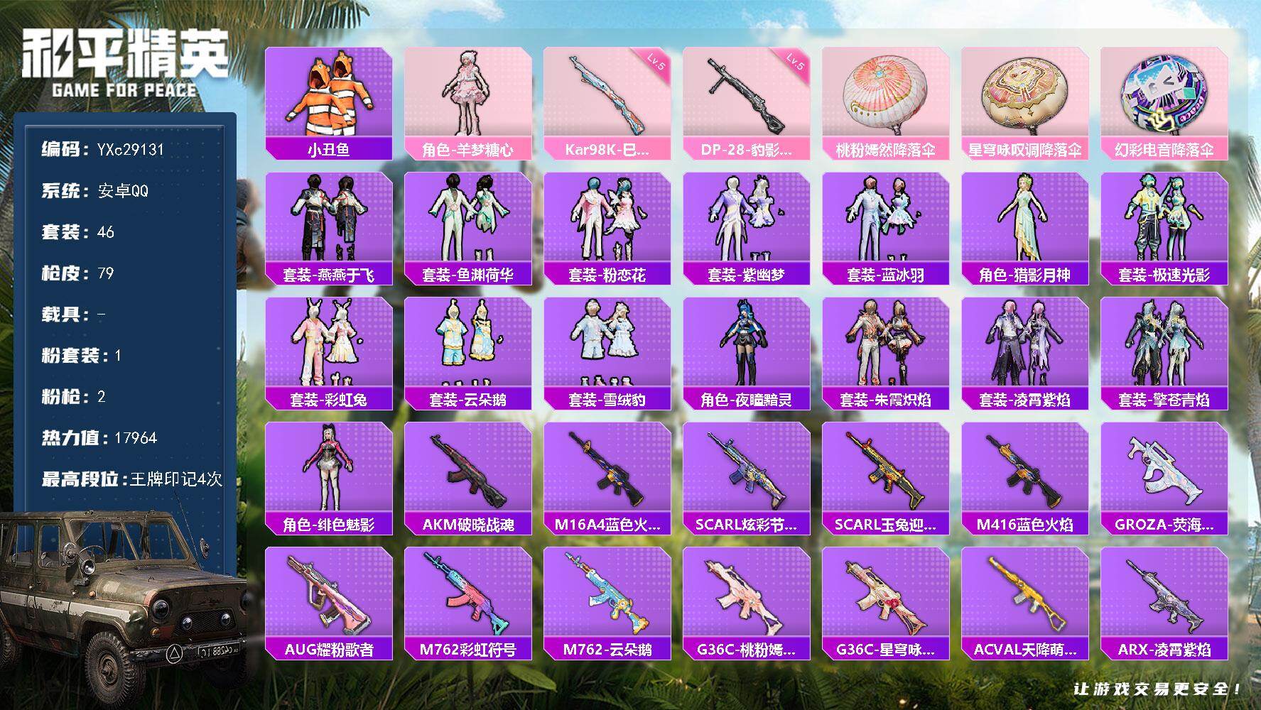 PX_2554873-??鱼,满地铁天赋】YXc29131-【无二次协助处理】【因赛季更新游戏段付以上号为准!】 安卓Q-1粉装2特效枪2热门46套装79枪皮,,4印记,历史超级王牌16星, 【1粉装】,羊梦糖心, 【2特效枪】,Kar98K-巳巳如意,(5级),DP-28-豹影疾电,(5级), 【2热门】,小丑鱼,呆萌铁蟹,