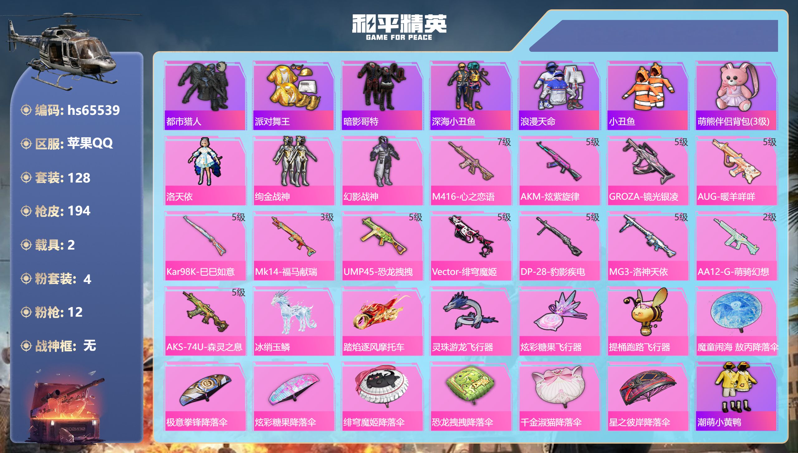 PX_2543865-,苹果手Q-10王牌印记-4粉装-12特效枪-2载具-60759热力值-128套装-194枪皮-2卓越印记 【4粉装】角色-镜中幻,套装-绚金战神,套装-幻影战神,角色-洛天依 【12特效枪】Vector-绯穹魔姬/5级,UMP45-恐龙拽拽/5级,AKS-74U-森灵之息/5级,Mk14-福马献瑞/3级,DP-28-豹影疾电/5级,Kar98K-巳巳如意/5级,GROZA-镜光银凌/5级,MG3-洛神天依/5级,M416-心之恋语/7级,AKM-炫紫旋律/5级,AUG-暖羊咩咩/5级,AA12-G-萌骑幻想/2级 【7稀有紫装】都市猎人,派对舞王,暗影哥特,深海小丑鱼,浪漫天命,小丑鱼,萌熊伴侣背包(3级) 【2稀有载具】冰绡玉鳞,踏焰逐风摩托车 【127稀有时装】洛天依,绚金战神,幻影战神,都市猎人,浪漫天命,暗影哥特,深海小丑鱼,小丑鱼,派对舞王,潮萌小黄鸭,龙魂突击队,小熊娃娃,异域银装,摩登魅猫,绒宝小鹅,街头风暴,星途旅人,冰河战士,鱼渊荷华,TT战队服,青团波波,大橘大利,燕燕于飞,战术大师,智谋强哥,雏菊兔兔,马上有钱,糖糖葫芦,香桃花海,蝶变,巳巳如意,粉恋花,棉花软糖,元素星魂,午间小调,彩虹兔,琴音绮想,乐音,雪绒豹,画境星梦,朱霞炽焰,狂鲨锋刃,游乐,凌霄紫焰,擎苍青焰,炫彩糖果,萌鸡速递,元气之梦,书海巡游,风迹短诗,蜜露汐语,漫游都市,薄荷星砂,秘语星愿,云朵鹅,顶瓜瓜,雪国风尚,蓝冰羽,恋语绒绒,青翼流星,紫幽梦,SS35特训,SS29特训,萝兰蝴蝶,SS31特训,SS33特训,SS32特训,SS36特训,豚鼠丹丹,雪兔飞飞,白熊同盟,萌黄之夏,SS37特训,SS28特训,特训学院,黄色运动,蓝色运动,黄色伏地魔,白色伏地魔,野性山猫,漫步者,黑色伏地魔,SS34特训,竞技名士,猛禽,SS30特训,长空猛禽,旭日情侣,冷焰舞者,魅力单车,幻世战舞者,特殊使命,牛气满满,幻影公爵,狙击之神,红釉青花,麻辣教官,鹰眼刺客,雨过天青,福马献瑞,冰冻风暴,幻影武者,蓝彩潮人,绮丽涂鸦,超能勇士,海岛探路者,幻世保卫者,烈火街头,耀粉歌者,牛气冲天,飞行日记,SS19特训,光之冒险,SS20特训,SS21特训,玉兔迎春,SS22特训,SS23特训,夏日倾情,甜蜜熊情侣,缤纷果语,海盐绵绵冰,王牌教练,柠萌假日,SS24特训,鹤鸣,快乐星愿 【194稀有枪械】M416-心之恋语/7级,AKM-炫紫旋律/5级,GROZA-镜光银凌/5级,AUG-暖羊咩咩/5级,Kar98K-巳巳如意/5级,Mk14-福马献瑞/3级,UMP45-恐龙拽拽/5级,Vector-绯穹魔姬/5级,DP-28-豹影疾电/5级,MG3-洛神天依/5级,AA12-G-萌骑幻想/2级,AKS-74U-森灵之息/5级,DBS-乌木金纹,SCAR-L-海盐豹豹,平底锅-精灵梦叶罗丽,GROZA-海盐豹豹,野牛-雏菊兔兔,Mk14-冰河战士,平底锅-雏菊兔兔,M762-雏菊兔兔,Mini14-雏菊兔兔,R1895-雏菊兔兔,UZI-冰河战士,M16A4-冰河战士,MK20-H-乌木金纹,DBS-风迹短诗,莫辛纳甘-风迹短诗,Win94-乌木金纹,MK12-风迹短诗,MK12-乌木金纹,烟雾弹-冰澜龙吟,PKM-紫幽梦,ACE32-画境星梦,M1加兰德-画境星梦,MP5K-画境星梦,Mk14-紫幽梦,蜜獾-乌木金纹,M762-云朵鹅,S1897-紫幽梦,SVD-云朵鹅,P92-紫幽梦,蜜獾-绯穹魔姬,SPAS-12-狂鲨锋刃,M417-玩趣呆呆,MK20-H-狂鲨锋刃,AUG-冰晶雪宝,铝热弹-炫彩糖果,UZI-炫彩糖果,AA12-G-画境星梦,平底锅-画境星梦,M249-冰晶雪宝,Mk47-风迹短诗,JS9-凌霄紫焰,MG-36-凌霄紫焰,平底锅-紫幽梦,破片手榴弹-海盐豹豹,UMP45-海盐豹豹,ARX-凌霄紫焰,AKS-74U-乌木金纹,AKM-涂鸦街区,蜜獾-风迹短诗,P92-凌霄紫焰,Famas-乌木金纹,Famas-霓彩脉冲,SPAS-12-云朵鹅,破片手榴弹-拽到爆炸,S1897-糯团青竹,平底锅-凌霄紫焰,Mk14-薄荷星砂,AKS-74U-鸡智如我,沙漠之鹰-云朵鹅,烟雾弹-冰氧夏日,Mk14-紫晶流影,MG-36-薄荷星砂,大砍刀-云朵鹅,PKM-啾咪啾咪,AUG-绝对恒星,GROZA-荧海星豚,S1897-荧海星豚,SVD-霓彩脉冲,SLR-霓彩脉冲,平底锅-属我最6,SCAR-L-彩虹符号,蜜獾-冰澜龙吟,大砍刀-冰澜龙吟,AUG-紫晶流影,S12K-霓彩脉冲,AKM-霓彩脉冲,撬棍-火尖枪,M416-红色方程式,M416-蓝色火焰,M416-糯团青竹,M416-黄金龙骨,M416-绯红前夜,AKM-影袭,AKM-星之彼岸,AKM-彩虹符号,AKM-缤纷海域,AKM-破晓战魂,AKM-恐龙拽拽,SCAR-L-红色方程式,SCAR-L-玉兔迎春,SCAR-L-夜灯,SCAR-L-炫彩节奏,M16A4-幻世战舞者,GROZA-恐龙拽拽,GROZA-影袭,AUG-耀粉歌者,QBZ-洛神天依,M762-彩虹符号,M762-绯红前夜,M762-天降萌叽,Mk47-乌木金纹,Mk47-洛神天依,G36C-镜域双华,AC-VAL-天降萌叽,AC-VAL-乌木金纹,Kar98K-洛神天依,Kar98K-魅影蝠王,Kar98K-影袭,M24-乌木金纹,M24-影袭,M24-炫彩节奏,AWM-黄金龙骨,AWM-恐龙拽拽,莫辛纳甘-蜜语绒猫,莫辛纳甘-乌木金纹,VSS-未来战士,VSS-星之彼岸,Mini14-旋转彩虹,Mini14-耀粉歌者,Mini14-穿刺龙虾,Mini14-春暖花开,Mk14-乌木金纹,UZI-影袭,UZI-啾咪啾咪,UMP45-蓝色火焰,UMP45-生命誓言,汤姆逊-炫彩节奏,S686-彩虹符号,S686-红色方程式,S686-生命誓言,S1897-炫彩节奏,S12K-破晓战魂,S12K-幻世战舞者,S12K-垂柳戏鸭,M249-糯团青竹,M249-星之彼岸,DP-28-彩虹符号,MG3-幻世战舞者,MG3-乌木金纹,P18C-百万伏特,平底锅-光之冒险,撬棍-幻世战舞者,Kar98K-顶峰精英,撬棍-冰晶雪宝,蜜獾-虎痴许褚,AC-VAL-荒原烈焰,ACE32-冰晶雪宝,AUG-异域银装,MK20-H-糖糖葫芦,MK20-H-星途旅人,野牛-燕燕于飞,M200-乌木金纹,SPAS-12-燕燕于飞,蝎式手枪-燕燕于飞,十字弩-异域银装,SCAR-L-星途旅人,S686-巳巳如意,蜜獾-糖糖葫芦,UMP45-糖糖葫芦,SPAS-12-乌木金纹,平底锅-糖糖葫芦,Vector-燕燕于飞,十字弩-燕燕于飞,破片手榴弹-星途旅人,莫辛纳甘-镭金极速,AKM-荧星灵猫,M16A4-雨过天青,GROZA-福马献瑞,蜜獾-启元战纹,AMR-雨过天青,SLR-乌木金纹,AA12-G-雨过天青,PKM-雨过天青,沙漠之鹰-雨过天青,燃烧瓶-福马献瑞,P90-紫矿核心,P18C-糖糖葫芦,GRO
