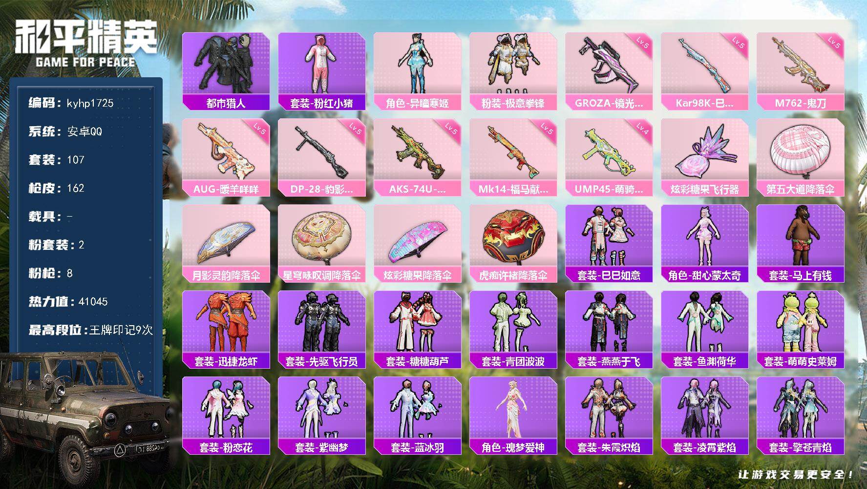 PX_2554905--2粉装-8特效枪-0载具-1粉色飞行器-41045热力值-9王牌印记-107套装-162枪皮 【热门品类】:套装-都市猎人,套装-粉红小猪 【粉色套装】:角色-异瞳寒姬,粉装-极意拳锋 【粉色枪皮等级】:GROZA-镜光银凌(五级),AUG-暖羊咩咩(五级),M762-鬼刀(五级),UMP45-萌骑冒险(四级),AKS-74U-森灵之息(五级),Kar98K-巳巳如意(五级),Mk