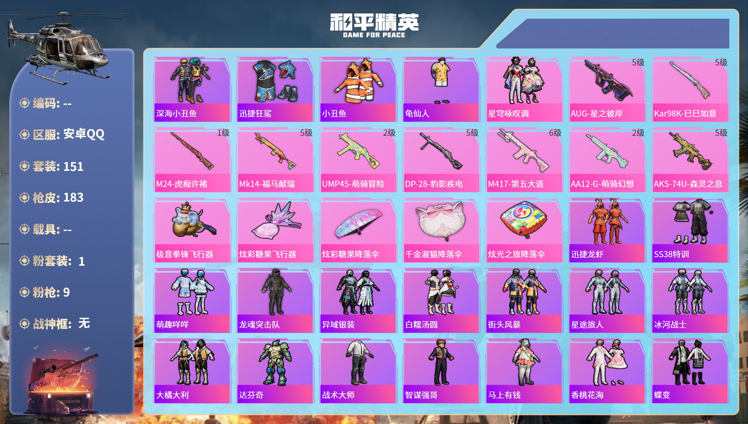 PX_2548823-安卓手Q-1王牌印记-2粉装-4特效枪-34206热力值-95套装-105枪皮 【2粉装】套装-星穹咏叹调,套装-暗夜鎏金 【4特效枪】Kar98K-巳巳如意/5级,DP-28-豹影疾电/5级,DP-28-暗夜鎏金/7级,ACE32-萌骑漫游/1级 【95稀有时装】星穹咏叹调,暗夜鎏金,龙魂突击队,白糯汤圆,大橘大利,风玲,战术大师,紫俏灵猫,蝶变,巳巳如意,元素星魂,云魄琉璃,炫彩糖果,萌鸡速递,元气之梦,漫游都市,薄荷星砂,顶瓜瓜,马上来财,SS35特训,SS31特训,SS33特训,SS32特训,星际旅行,都市漫游者,夏日音浪,潮流炫酷,白熊同盟,萌黄之夏,SS37特训,萌趣绒叽,特训学院,黄色运动,蓝色运动,黄色伏地魔,白色伏地魔,酒红色名流,湖蓝色名流,黄色名流,顽皮玉兔,SS26特训,空岛之星,黑色伏地魔,炫蓝之夏,SS34特训,竞技名士,深蓝色名流,猛禽,长空猛禽,旭日情侣,街头潮人,怒火燎原,冷焰舞者,魅力单车,灼焰舞者,战地督导,春日漫步,极速红龙,狙击之神,麻辣教官,完美偶像,人气偶像,幻影武者,破蛋小黄鸡,蓝彩潮人,竞技达人朋克,破晓战魂,和煦暖阳,霓虹街区,田园牧歌,萌趣颜团子,轻风白浪,特种颜团子,耀粉歌者,牛气冲天,SS18特训,飞行日记,SS17特训,绚烂繁星,熠彩粉晶,空投萌叽,SS19特训,SS20特训,SS21特训,玉兔迎春,SS22特训,SS23特训,飞狐塔尔斯,缤纷果语,滨海厨神,妙红点点,幻彩翩翩,海盐绵绵冰,吉莉礼服,鹤鸣 【105稀有枪械】Kar98K-巳巳如意/5级,DP-28-豹影疾电/5级,DP-28-暗夜鎏金/7级,ACE32-萌骑漫游/1级,DBS-乌木金纹,SCAR-L-海盐豹豹,Mk14-冰河战士,UZI-冰河战士,M16A4-冰河战士,MK20-H-乌木金纹,Win94-乌木金纹,MK12-乌木金纹,蜜獾-乌木金纹,SPAS-12-狂鲨锋刃,MK20-H-狂鲨锋刃,AUG-冰晶雪宝,铝热弹-炫彩糖果,UZI-炫彩糖果,大砍刀-像素花束,AKS-74U-乌木金纹,Famas-乌木金纹,破片手榴弹-拽到爆炸,Mk14-薄荷星砂,烟雾弹-冰氧夏日,MG3-智耀战神,MG-36-薄荷星砂,AUG-紫晶流影,S12K-霓彩脉冲,AMR-鸡智如我,AKM-霓彩脉冲,M416-红色方程式,M416-蓝色火焰,AKM-彩虹符号,AKM-灼热熔岩,AKM-萌趣颜团子,SCAR-L-红色方程式,SCAR-L-玉兔迎春,SCAR-L-炫彩节奏,M16A4-幻世战舞者,GROZA-田园牧歌,AUG-耀粉歌者,AUG-天降萌叽,QBZ-彩虹符号,M762-暗夜鎏金,M762-第五大道,M762-天降萌叽,Mk47-乌木金纹,Mk47-妙红点点,G36C-乌木金纹,AC-VAL-天降萌叽,蜜獾-天降萌叽,Kar98K-乌木金纹,Kar98K-红色方程式,Kar98K-彩虹符号,M24-乌木金纹,M24-炫彩节奏,莫辛纳甘-乌木金纹,AMR-乌木金纹,AMR-妙红点点,SKS-苔丝玫瑰,SKS-糯团青竹,VSS-田园牧歌,Mini14-耀粉歌者,Mk14-乌木金纹,UZI-红色方程式,UMP45-蓝色火焰,UMP45-生命誓言,Vector-生命誓言,Vector-田园牧歌,汤姆逊-耀粉歌者,汤姆逊-暗夜鎏金,野牛-乌木金纹,MP5K-乌木金纹,P90-玩趣呆呆,S686-红色方程式,S1897-炫彩节奏,S1897-暗夜鎏金,S12K-破晓战魂,S12K-音爆索尼克,SPAS-12-田园牧歌,M249-彩虹符号,M249-妙红点点,DP-28-彩虹符号,MG3-第五大道,MG3-幻世战舞者,MG3-妙红点点,MG3-乌木金纹,沙漠之鹰-旋转彩虹,TMP-9-江南烟雨,平底锅-空岛之星,平底锅-光之冒险,平底锅-空投萌叽,平底锅-田园牧歌,平底锅-妙红点点,破片手榴弹-萌趣颜团子,ACE32-冰晶雪宝,AUG-异域银装,M200-乌木金纹,SPAS-12-乌木金纹,GROZA-福马献瑞,蜜獾-启元战纹,SLR-乌木金纹,P90-紫矿核心,GROZA-紫矿核心,P90-巳巳如意 【5稀有飞行器】极意拳锋飞行器,炫彩糖果飞行器,破刃行动尾迹,空岛之星尾迹,粉色滑翔尾迹 【15稀有背包】狂鲨锋刃背包(3级),炫彩糖果背包(3级),喜羊羊与灰太狼背包(3级),碧影闪光背包(3级),萌趣颜团子背包(3级),蝶变背包(3级),音爆索尼克背包(3级),暗夜鎏金背包(3级),苔丝玫瑰背包(3级),田园牧歌背包(3级),福马献瑞背包(3级),星兔领航员背包(3级),炫蓝之夏背包(3级),冰河战士背包(3级),蓝莓炮弹背包(3级) 【31稀有降落伞】炫彩糖果降落伞,狂鲨锋刃降落伞,福马献瑞降落伞,竞逐热浪降落伞,江南烟雨降落伞,橙云降落伞,月下萌萌兔降落伞,第五大道降落伞,紫菱降落伞,妙红点点降落伞,钢铁雄心降落伞,蝶舞翩翩降落伞,星兔领航员降落伞,绿草茵茵降落伞,天涯共此时降落伞,SS22王牌降落伞,光之冒险降落伞,普通降落伞,马戏团糖果降落伞,白昼之火降落伞,暗夜鎏金降落伞,鬼刀降落伞,异域银装降落伞,寂夜之火降落伞,破晓战魂降落伞,萌趣颜团子降落伞,金丰海韵降落伞,干得PEL亮降落伞,田园牧歌降落伞,星之彼岸降落伞,蓝海之火降落伞 【14稀有头盔】炫彩糖果头盔(3级),金丰海韵头盔(3级),音爆索尼克头盔(3级),罪夜之冕头盔(3级),第五大道头盔(3级),海盐豹豹头盔(3级),荒原烈焰头盔(3级),田园牧歌头盔(3级),福马献瑞头盔(3级),萌趣颜团子头盔(3级),仲夏莫吉托头盔(3级),暗夜鎏金头盔(3级),冰河战士头盔(3级),妙红点点头盔(3级)