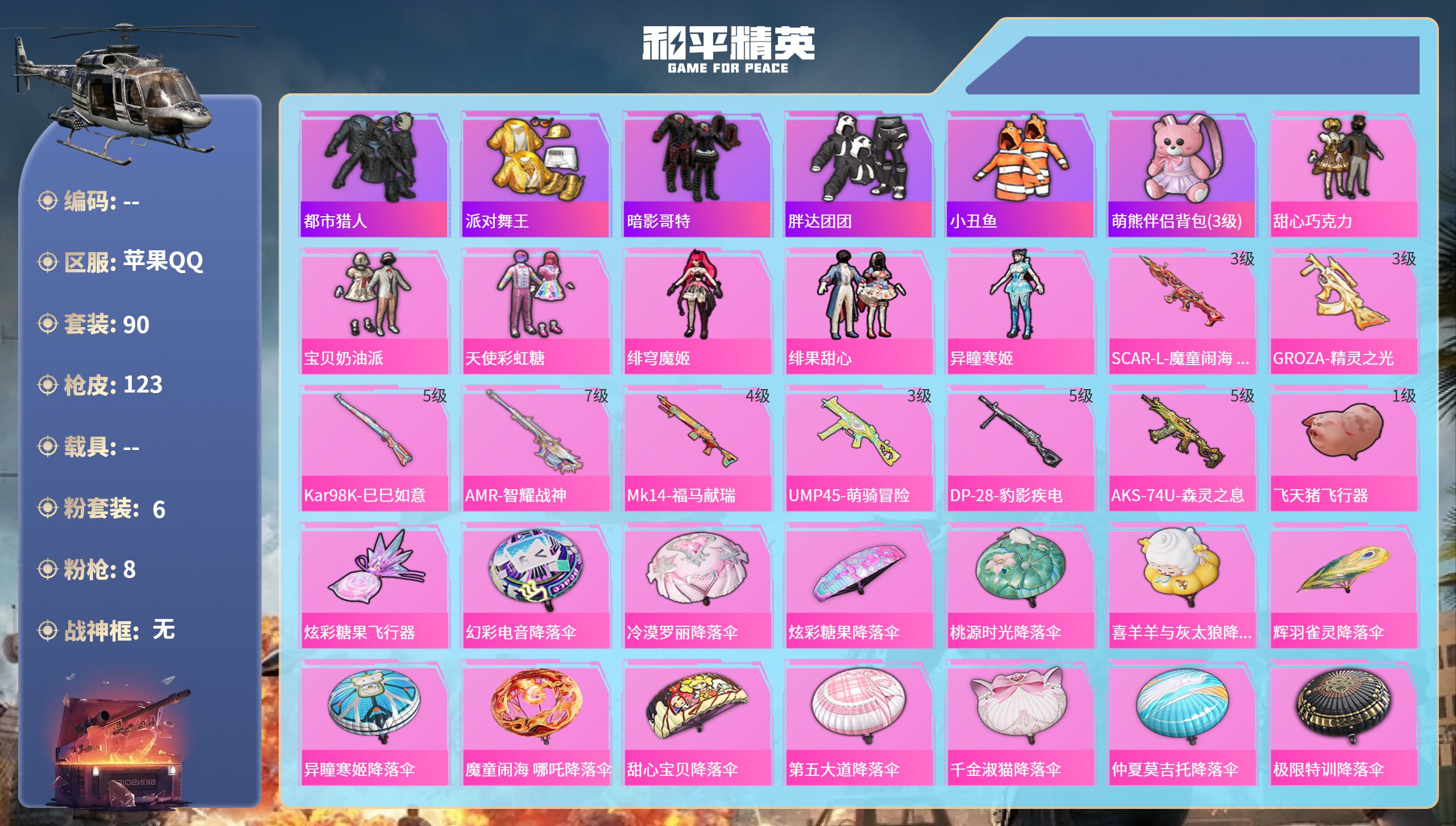 PX_2548692-苹果手Q-6王牌印记-6粉装-8特效枪-41274热力值-90套装-123枪皮 【6粉装】套装-天使彩虹糖,套装-绯果甜心,套装-宝贝奶油派,套装-甜心巧克力,角色-异瞳寒姬,角色-绯穹魔姬 【8特效枪】GROZA-精灵之光/3级,Kar98K-巳巳如意/5级,DP-28-豹影疾电/5级,SCAR-L-魔童闹海,哪吒/3级,UMP45-萌骑冒险/3级,AMR-智耀战神/7级,Mk14-福马献瑞/4级,AKS-74U-森灵之息/5级 【6稀有紫装】都市猎人,派对舞王,暗影哥特,胖达团团,小丑鱼,萌熊伴侣背包(3级) 【90稀有时装】甜心巧克力,宝贝奶油派,天使彩虹糖,绯穹魔姬,绯果甜心,异瞳寒姬,迅捷龙虾,SS38特训,都市猎人,胖达团团,暗影哥特,小丑鱼,派对舞王,Alan,Walker,糯粉咩咩,异域银装,白糯汤圆,战术大师,雏菊兔兔,马上有钱,果冻柠檬,午间小调,琴音绮想,乐音,灵公主,雪绒豹,画境星梦,魔药课室,朱霞炽焰,狂鲨锋刃,阳光菠萝,喜羊羊,懒羊羊,美羊羊,凌霄紫焰,粉黛兰香,云魄琉璃,炫彩糖果,萌鸡速递,元气之梦,书海巡游,风迹短诗,薄荷星砂,秘语星愿,云朵鹅,顶瓜瓜,雪国风尚,蓝冰羽,青翼流星,紫幽梦,SS35特训,萝兰蝴蝶,SS31特训,SS33特训,SS32特训,SS36特训,军械专家,龙的传人,SS37特训,黄色名流,顽皮玉兔,暖暖麦兜,漫步者,SS34特训,竞技名士,长空猛禽,旭日情侣,街头潮人,冷焰舞者,魅力单车,水银刺客,青涩时光,狙击之神,红釉青花,鹰眼刺客,雨过天青,福马献瑞,冰冻风暴,破蛋小黄鸡,摇滚战魂,蓝彩潮人,海岛探路者,耀粉歌者,夏日倾情,缤纷果语,青涩年华,白兰地假日,王牌教练,暗夜之虎,柠萌假日 【124稀有枪械】SCAR-L-魔童闹海,哪吒/3级,GROZA-精灵之光/3级,Kar98K-巳巳如意/5级,AMR-智耀战神/7级,Mk14-福马献瑞/4级,UMP45-萌骑冒险/3级,DP-28-豹影疾电/5级,AKS-74U-森灵之息/5级,MG3-梦海之灵,GROZA-海盐豹豹,野牛-雏菊兔兔,平底锅-雏菊兔兔,M762-雏菊兔兔,Mini14-雏菊兔兔,R1895-雏菊兔兔,UZI-冰河战士,MK20-H-乌木金纹,DBS-风迹短诗,莫辛纳甘-风迹短诗,Win94-乌木金纹,MK12-风迹短诗,MK12-乌木金纹,SVD-冷漠罗丽,撬棍-冷漠罗丽,破片手榴弹-爆破雪人,S12K-极意拳锋,PKM-紫幽梦,MG3-霓彩脉冲,R45-幻彩电音,ACE32-画境星梦,SCAR-L-冷漠罗丽,M1加兰德-画境星梦,MP5K-画境星梦,Mk14-紫幽梦,蜜獾-乌木金纹,M762-云朵鹅,S1897-紫幽梦,SVD-云朵鹅,P92-紫幽梦,SPAS-12-狂鲨锋刃,M417-玩趣呆呆,MK20-H-狂鲨锋刃,AUG-冰晶雪宝,铝热弹-炫彩糖果,UZI-炫彩糖果,ARX-像素花束,大砍刀-像素花束,AA12-G-画境星梦,平底锅-画境星梦,Mk47-风迹短诗,P90-魔法小松鼠,JS9-凌霄紫焰,MG-36-凌霄紫焰,平底锅-紫幽梦,破片手榴弹-海盐豹豹,UMP45-海盐豹豹,ARX-凌霄紫焰,AKS-74U-乌木金纹,AKM-涂鸦街区,蜜獾-风迹短诗,爆炸猎弓-喜羊羊与灰太狼,P92-凌霄紫焰,Famas-乌木金纹,Famas-霓彩脉冲,SPAS-12-云朵鹅,破片手榴弹-拽到爆炸,信号枪-异瞳寒姬,平底锅-凌霄紫焰,沙漠之鹰-云朵鹅,MG3-智耀战神,MG-36-薄荷星砂,M24-时光之吻,S686-时光之誓,大砍刀-云朵鹅,SLR-圣穹绘梦,野牛-果冻柠檬,SLR-霓彩脉冲,SCAR-L-彩虹符号,M200-六号稻草人,M762-果冻柠檬,燃点复合弓-火尖莲影,S12K-霓彩脉冲,AKM-霓彩脉冲,撬棍-火尖枪,破片手榴弹-火尖莲影,AKM-影袭,GROZA-影袭,M762-甜心宝贝,M762-天降萌叽,AC-VAL-天降萌叽,Kar98K-影袭,M24-影袭,M24-仲夏莫吉托,SKS-金玉无双,UZI-影袭,UZI-啾咪啾咪,Vector-生命誓言,Vector-金玉无双,M249-糯团青竹,DP-28-甜心宝贝,平底锅-甜心宝贝,撬棍-甜心宝贝,GROZA-暮色玫影,撬棍-冰晶雪宝,MG3-火熔核心,蝎式手枪-千金淑猫,爆炸猎弓-精灵之光,ACE32-冰晶雪宝,AUG-异域银装,汤姆逊-樱桃泡泡,M200-乌木金纹,十字弩-异域银装,M16A4-绒绒猫尾,M16A4-雨过天青,GROZA-福马献瑞,蜜獾-启元战纹,AMR-雨过天青,SLR-乌木金纹,AA12-G-雨过天青,PKM-雨过天青,沙漠之鹰-雨过天青,燃烧瓶-福马献瑞,汤姆逊-像素花束,MG3-火熔核心 【8稀有飞行器】飞天猪飞行器/1级,狂鲨锋刃飞行器,马上有福飞行器,鸡智如我飞行器,炫彩糖果飞行器,登顶巅峰飞行器,破刃行动尾迹,异域银装飞行器 【26稀有背包】萌熊伴侣背包(3级),极意拳锋背包(3级),魔童闹海,哪吒背包(3级),冷漠罗丽背包(3级),狂鲨锋刃背包(3级),画境星梦背包(3级),炫彩糖果背包(3级),喜羊羊与灰太狼背包(3级),凌霄紫焰背包(3级),粉黛兰香背包(3级),智耀战神背包(3级),紫幽梦背包(3级),萌鸡速递背包(3级),薄荷星砂背包(3级),风迹短诗背包(3级),云朵鹅背包(3级),霁蓝缠春背包(3级),甜心宝贝背包(3级),仲夏莫吉托背包(3级),精灵菇菇背包(3级),异域银装背包(3级),雪国风尚背包(3级),甜蜜菠萝背包(3级),福马献瑞背包(3级),荒原烈焰背包(3级),冰河战士背包(3级) 【38稀有降落伞】SS35王牌降落伞,SS36王牌降落伞,幻彩电音降落伞,冷漠罗丽降落伞,SS32王牌降落伞,炫彩糖果降落伞,狂鲨锋刃降落伞,会说话的汤姆猫降落伞,雨过天青降落伞,福马献瑞降落伞,画境星梦降落伞,紫幽梦降落伞,桃源时光降落伞,折梦之诗降落伞,SS34王牌降落伞,喜羊羊与灰太狼降落伞,辉羽雀灵降落伞,异瞳寒姬降落伞,凌霄紫焰降落伞,SS33王牌降落伞,风迹短诗降落伞,云朵鹅降落伞,圣穹绘梦降落伞,果冻柠檬降落伞,六号稻草人降落伞,野性觉醒降落伞,魔童闹海,哪吒降落伞,甜心宝贝降落伞,第五大道降落伞,钢铁雄心降落伞,都市猎人降落伞,普通降落伞,千金淑猫降落伞,异域银装降落伞,寂夜之火降落伞,仲夏莫吉托降落伞,雏菊兔兔降落伞,极限特训降落伞 【23稀有头盔】金羽特工头盔(3级),甜心宝贝头盔(3级),林间