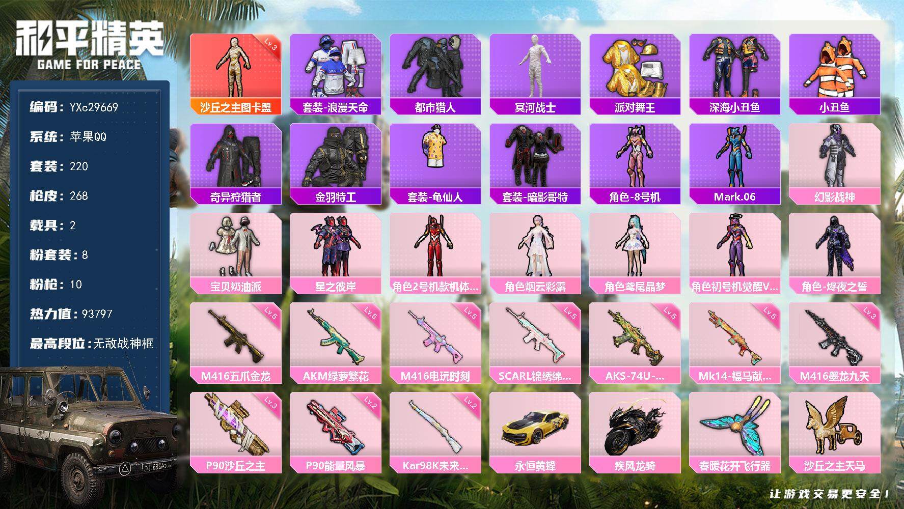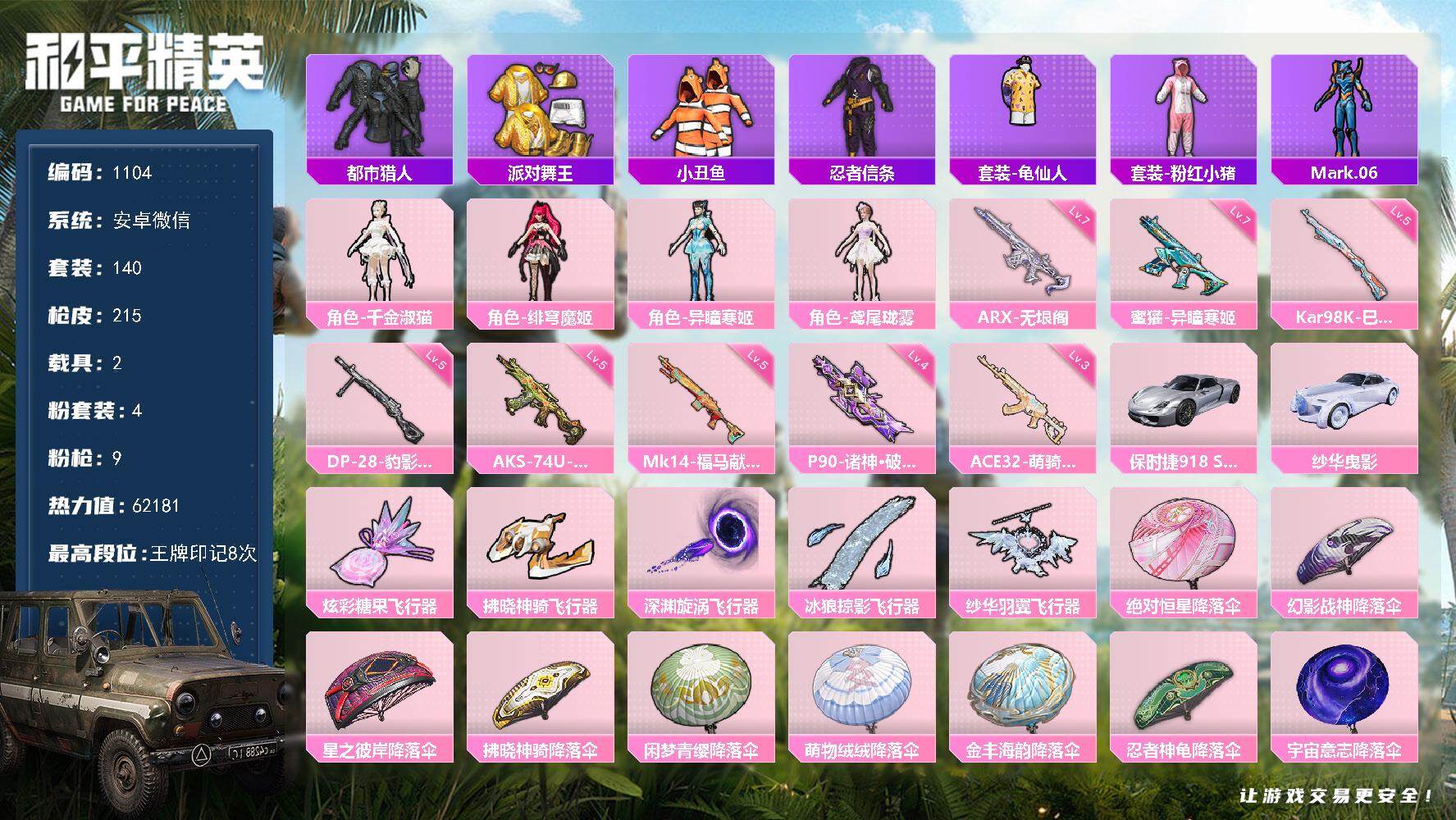 PX_2562935-装碎片-连体王者打野23段2星元9传说1典藏-地铁满天赋0违规【新红装敞篷车皮,异瞳寒姬,绯穹魔姬,千金淑猫,鸢尾珑雾,都市,金鞋,小丑鱼,忍者信条,龟仙人,粉红小猪,Mark.06】安卓,微信-4粉装-9特效枪-2载具-5粉色飞行器-62181热力值-8王牌印记-140套装-215枪皮 【热门品类】:套装-都市猎人,套装-派对舞王,套装-小丑鱼,套装-忍者信条,套装-龟仙人,套装-粉红小猪,角色-Mark.06 【粉色套装】:角色-千金淑猫,角色-绯穹魔姬,角色-异瞳寒姬,角色-鸢尾珑雾 【粉色枪皮等级】:蜜獾-异瞳寒姬(七级),ACE32-萌骑漫游(三级),ARX-无垠阁(七级),AKS-74U-森灵之息(五级),P90-诸神·破晓(四级),Kar98K-巳巳如意(五级),Mk14-福马献瑞(五级),DP-28-豹影疾电(五级) 【粉色载具】:保时捷918,Spyder(液态银),纱华曳影 【粉色枪皮】:蜜獾-异瞳寒姬,ACE32-萌骑漫游,ACE32-百变纱华,ARX-无垠阁,AKS-74U-森灵之息,P90-诸神·破晓,Kar98K-巳巳如意,Mk14-福马献瑞,DP-28-豹影疾电 【粉色飞行器】:炫彩糖果飞行器,拂晓神骑飞行器,深渊漩涡飞行器,冰狼掠影飞行器,纱华羽翼飞行器 【粉色降落伞】:绝对恒星降落伞,幻影战神降落伞,星之彼岸降落伞,拂晓神骑降落伞,闲梦青缨降落伞,萌物绒绒降落伞,金丰海韵降落伞,忍者神龟降落伞,宇宙意志降落伞,幽焰骑士降落伞,鬼刀降落伞,冷漠罗丽降落伞,绯穹魔姬降落伞,异瞳寒姬降落伞,炫彩糖果降落伞,百变纱华降落伞 【稀有套装】:套装-龟仙人,套装-巳巳如意,套装-超能元气,套装-雪国风尚,套装-炫彩糖果,角色-幸运青,套装-马上有钱,套装-迅捷龙虾,套装-遗迹猎人,套装-雏菊兔兔,套装-萝兰蝴蝶,套装-小熊娃娃,角色-达芬奇,角色-临安公主,套装-燕燕于飞,套装-鱼渊荷华,套装-粉恋花,套装-紫幽梦,套装-蓝冰羽,套装-星影赞美诗,套装-星渊小夜曲,套装-彩虹兔,套装-云朵鹅,套装-雪绒豹,角色-乐音,角色-夜瞳黯灵,套装-朱霞炽焰,套装-凌霄紫焰,角色-绯色魅影,角色-紫俏灵猫,套装-书海巡游,套装-画境星梦,套装-琴音绮想,套装-雨过天青,套装-红釉青花,角色-枫露凝珀,套装-燕雀桃枝 【稀有枪皮】:AUG-冰晶雪宝