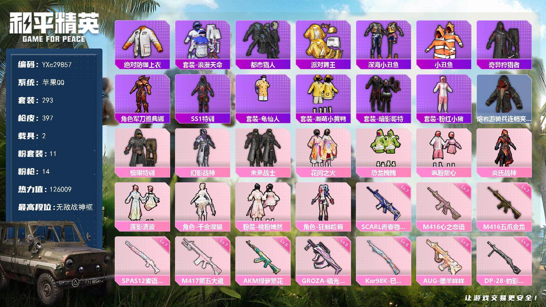 PX_2563095-??框,都市,金鞋,巡查衣,极限特训,哥特】YXc29857-【可二次】【因赛季更新游戏段付以上号为准!】 ,苹果Q-8稀有2载具11粉装14特效枪34热门293套装397枪皮,20印记,历史无敌战神, 【8稀有】,奇异狩猎者,巡查衣,AWM-黄金龙骨,SCAR-L-粉色回忆,都市猎人,浪漫天命,派对舞王,派对舞王(金靴子), 【2载具】,冰绡玉鳞,辉羽雀灵自行车, 【11粉装】,狂魅哈莉,千金淑猫,桃粉嫣然,炎氏战神,飒粉甜心,幻影战神,莲影清波,极限特训,未来战士,花间之火,恐龙拽拽, 【14特效枪】,M416-五爪金龙,(7级),M416-心之恋语,(7级),P90-魔童闹海敖丙,(3级),AKS-74U-森灵之息,(5级),AKM-绿萝繁花,(5级),Kar98K-巳巳如意,(5级),SPAS-12-蜜语绒猫,(7级),DP-28-豹影疾电,(5级),AUG-暖羊咩咩,(5级),GROZA-镜光银凌,(5级),M417-第五大道,(7级),Mk14-福马献瑞,(5级),UMP45-萌骑冒险,(5级),SCAR-L-青春物语,(7级), 【34热门】,小丑鱼,龟仙人,雪山精英,东方飞龙,潮萌小黄鸭,梦魇先生,鹰眼刺客,好奇恐龙,软萌银虎,激萌罗小黑,迅捷狂鲨,深海小丑鱼,暗夜契约,暗影哥特,SS1特训,团圆交子,瑞龙福将,纯白誓言,粉红小猪,水银刺客,狂沙舞者,漫步者,粉甜马卡龙,破蛋小黄鸡,风华少年志,黑色刀锋,军刀雅典娜,英勇保护者,弄潮海豚,AKM-奇异狩猎者,M762-奇异狩猎者,M762-瑞龙福将,M24-奇异狩猎者,S686-奇异狩猎者, 【4头盔】,梦幻火箭头盔,金曜白虎头盔,幻影战神头盔,金羽特工头盔, 【6背包】,折纸暴龙背包,甜心宝贝背包,百万伏特背包,幻影战神背包,深海小丑鱼背包,金羽特工背包,