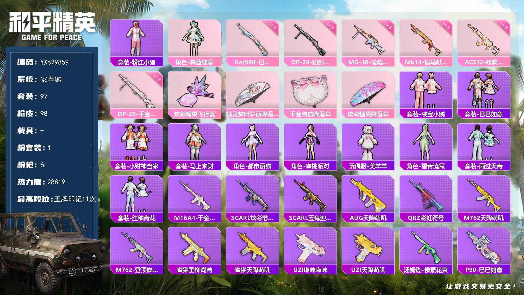 PX_2563113-01,满级心之恋语,满地铁天赋】YXc29828-【无二次协助处理】【因赛季更新游戏段付以上号为准!】 ,安卓Q-1载具2粉装5特效枪10热门129套装197枪皮,,13印记,历史超级王牌23星, 【1载具】,兰博轿车灰色, 【2粉装】,梦幻火箭,月影灵韵, 【5特效枪】,M416-心之恋语,(7级),Kar98K-巳巳如意,(5级),MG-36-沧焰双生,(5级),DP-28-豹影疾电,(5级),Mk14-福马献瑞,(5级), 【10热门】,小狗蛇点点,鹰眼刺客,神秘黑猫,团圆交子,瑞龙福将,粉红小猪,漫步者,静谧青瓷,M762-瑞龙福将,AWM-激战未来, 【1飞行器】,梦幻火箭飞行器, 【1头盔】,梦幻火箭头盔, 【2背包】,梦幻火箭背包,神秘黑猫背包,