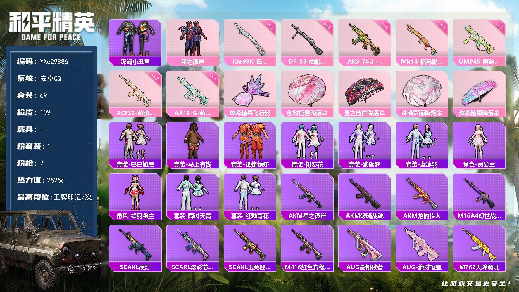 PX_2563072-??尾,满地铁天赋】YXc29886-【无二次协助处理】【因赛季更新游戏段付以上号为准!】 ,安卓Q-1粉装7特效枪2热门69套装109枪皮,,7印记,历史传奇王牌8星, 【1粉装】,星之彼岸, 【7特效枪】,AKS-74U-森灵之息,(5级),Kar98K-巳巳如意,(5级),DP-28-豹影疾电,(5级),Mk14-福马献瑞,(5级),AA12-G-萌骑幻想,(1级),UMP45-萌骑冒险,(5级),ACE32-萌骑漫游,(2级), 【2热门】,深海小丑鱼,破蛋小黄鸡, 【1头盔】,深海小丑鱼头盔,