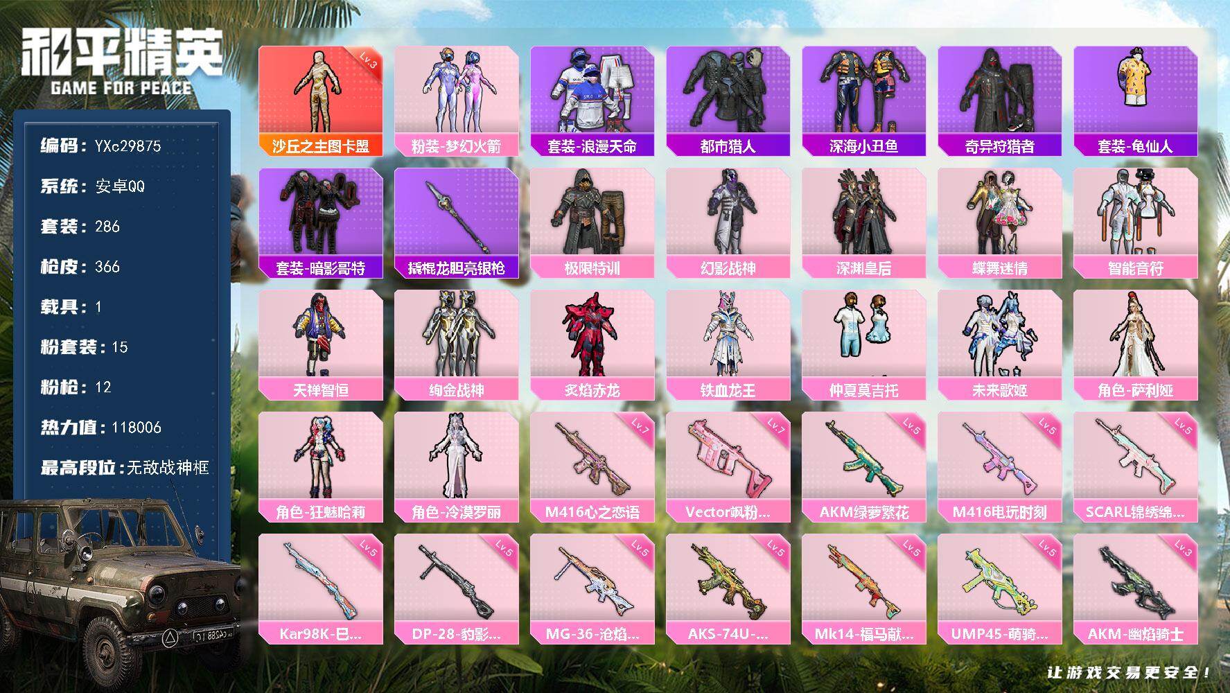 PX_2563081-??框,3级图卡盟,都市,粉玛莎,新101,极限特训,哥特,粉熊包,满地铁天赋】YXc29875-【无二次】【因赛季更新游戏段付以上号为准!】 ,安卓Q-1红装3稀有1载具15粉装12特效枪16热门286套装366枪皮,18印记,历史无敌战神, 【1红装】,沙丘之主-图卡盟,(3级), 【3稀有】,奇异狩猎者,都市猎人,浪漫天命, 【1载具】,玛莎拉蒂粉色, 【15粉装】,狂魅哈莉,梦幻火箭,蝶舞迷情,萨利娅,未来歌姬,冷漠罗丽,深渊皇后,幻影战神,智能音符,仲夏莫吉托,极限特训,天禅智恒,绚金战神,炙焰赤龙,铁血龙王, 【12特效枪】,SCAR-L-锦绣绵绵,(5级),M416-心之恋语,(7级),M416-电玩时刻,(5级),AKM-幽焰骑士,(3级),AKS-74U-森灵之息,(5级),AKM-绿萝繁花,(5级),Kar98K-巳巳如意,(5级),Vector-飒粉甜心,(7级),MG-36-沧焰双生,(5级),DP-28-豹影疾电,(5级),Mk14-福马献瑞,(5级),UMP45-萌骑冒险,(5级), 【16热门】,龟仙人,浪漫假日,东方飞龙,鹰眼刺客,深海小丑鱼,4AM战队服,暗影哥特,团圆交子,瑞龙福将,狂沙舞者,漫步者,破蛋小黄鸡,极速红龙,Kar98K-终极赛罗,M762-瑞龙福将,M24-奇异狩猎者, 【3头盔】,梦幻火箭头盔,百万伏特头盔,幻影战神头盔, 【4背包】,百万伏特背包,幻影战神背包,萌熊伴侣背包,深海曼妙背包,