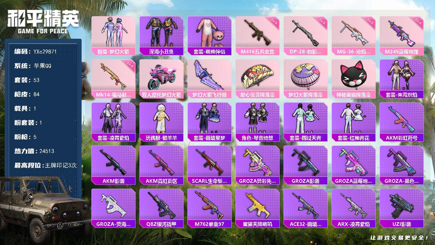 PX_2563082-01,五爪,双马尾】YXc29871-【无二次协助处理】【因赛季更新游戏段付以上号为准!】 ,苹果Q-1载具1粉装5特效枪6热门53套装84枪皮,,3印记,历史超级王牌4星, 【1载具】,双人摩托梦幻火箭, 【1粉装】,梦幻火箭, 【5特效枪】,M416-五爪金龙,(5级),MG-36-沧焰双生,(5级),DP-28-豹影疾电,(5级),M249-蓝莓炮弹,(4级),Mk14-福马献瑞,(4级), 【6热门】,雪山精英,鹰眼刺客,深海小丑鱼,大橘为重,萌熊伴侣,漫步者, 【1飞行器】,梦幻火箭飞行器, 【1头盔】,金羽特工头盔, 【1背包】,梦幻火箭背包,