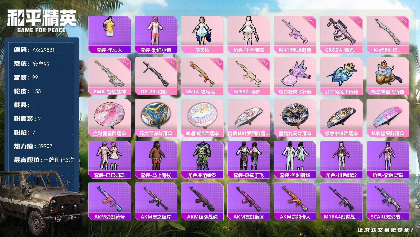 PX_2563079-??铁天赋】YXc29881-【可二次】【因赛季更新游戏段付以上号为准!】 ,安卓Q-2粉装7特效枪6热门99套装155枪皮,,3印记,历史传奇王牌14星, 【2粉装】,千金淑猫,洛天依, 【7特效枪】,M416-电玩时刻,(5级),Kar98K-巳巳如意,(5级),DP-28-豹影疾电,(5级),AMR-智耀战神,(5级),GROZA-镜光银凌,(5级),Mk14-福马献瑞,(5级),ACE32-萌骑漫游,(4级), 【6热门】,龟仙人,呆萌铁蟹,粉红小猪,破蛋小黄鸡,极速红龙,弄潮海豚, 【1背包】,梦幻火箭背包,