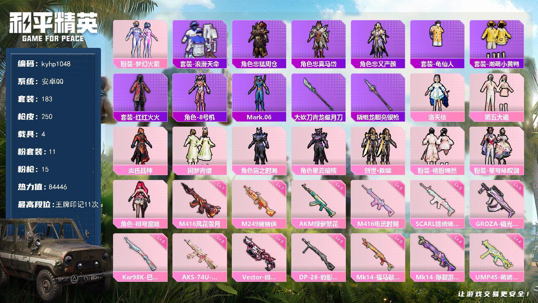 PX_2562591--11粉装-15特效枪-4载具-5粉色飞行器-84446热力值-11王牌印记-183套装-250枪皮 【热门品类】:粉装-梦幻火箭,套装-浪漫天命,角色-忠猛周仓,角色-忠真马岱,角色-忠义严颜,套装-龟仙人,套装-潮萌小黄鸭,套装-红红火火,角色-8号机,角色-Mark.06,大砍刀-青龙偃月刀,撬棍-龙胆亮银枪 【粉色套装】:粉装-梦幻火箭,角色-洛天依,粉装-第五大道,粉装-炎