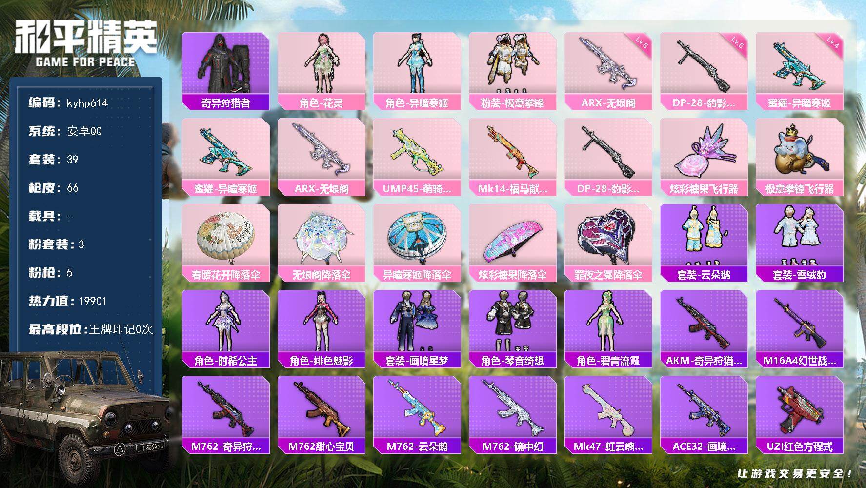 PX_2561804--3粉装-5特效枪-0载具-2粉色飞行器-19901热力值-2王牌印记-39套装-66枪皮 【热门品类】:套装-奇异狩猎者 【粉色套装】:角色-花灵,角色-异瞳寒姬,粉装-极意拳锋 【粉色枪皮等级】:蜜獾-异瞳寒姬(四级),ARX-无垠阁(五级),DP-28-豹影疾电(五级) 【粉色枪皮】:蜜獾-异瞳寒姬,ARX-无垠阁,UMP45-萌骑冒险,Mk14-福马献瑞,DP-28-豹影疾电