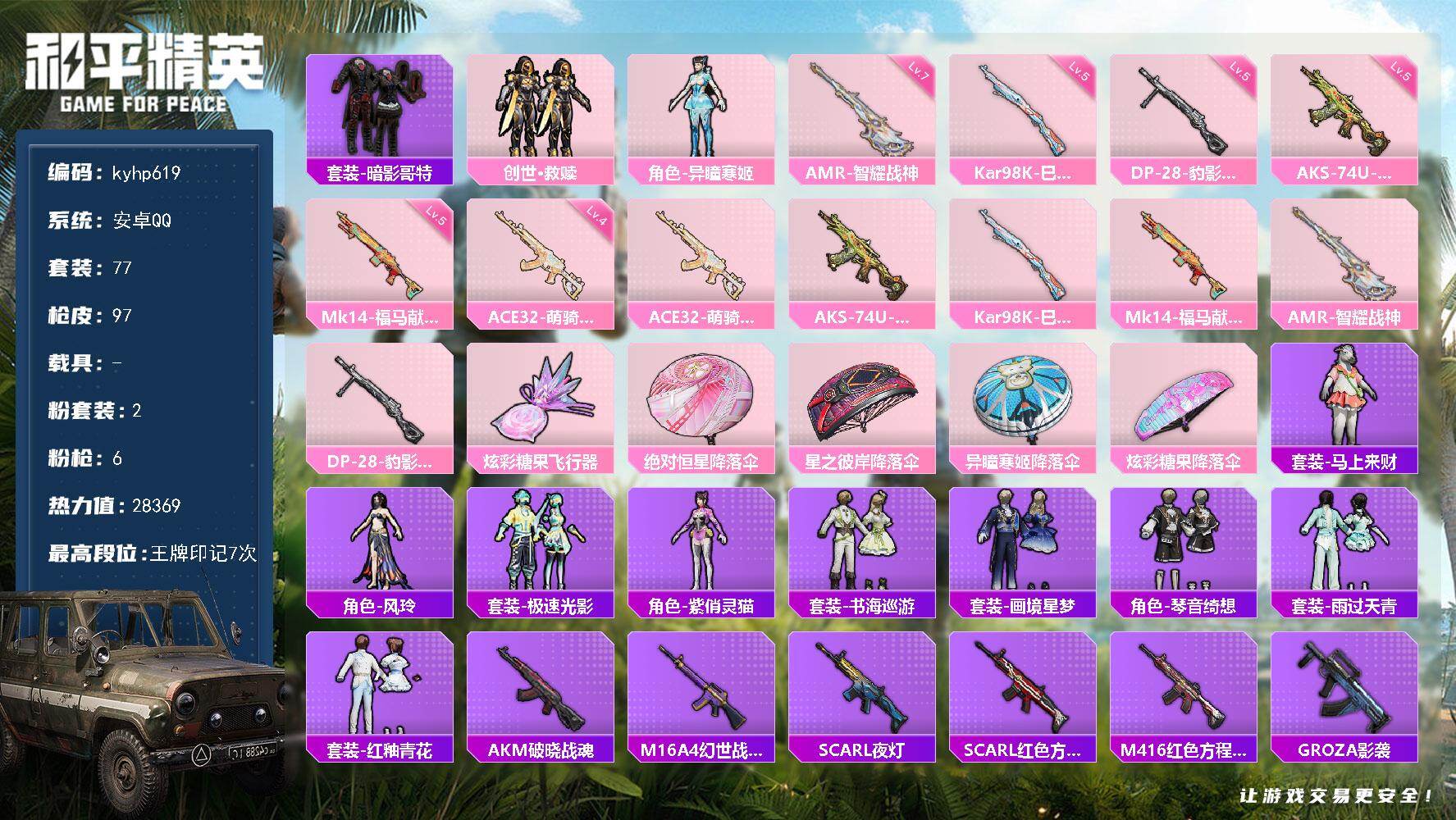 PX_2561808--2粉装-6特效枪-0载具-1粉色飞行器-28369热力值-7王牌印记-77套装-97枪皮 【热门品类】:套装-暗影哥特 【粉色套装】:套装-创世·救赎,角色-异瞳寒姬 【粉色枪皮等级】:ACE32-萌骑漫游(四级),AKS-74U-森灵之息(五级),Kar98K-巳巳如意(五级),Mk14-福马献瑞(五级),AMR-智耀战神(七级),DP-28-豹影疾电(五级) 【粉色枪皮】:AC