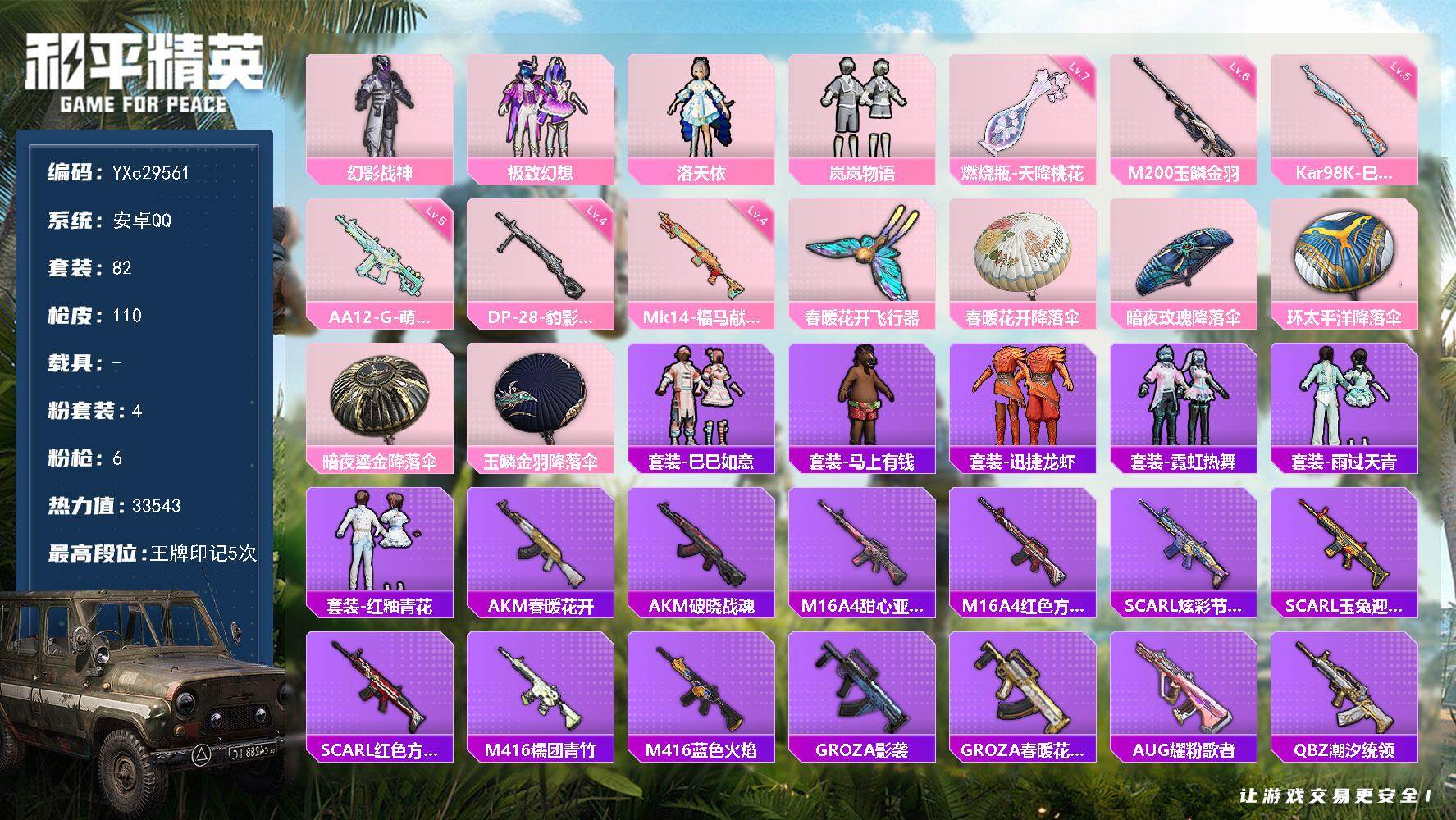 PX_2558899-??铁天赋】YXc29561-【无二次协助处理】【因赛季更新游戏段付以上号为准!】 ,安卓Q-4粉装6特效枪3热门82套装110枪皮,5印记,历史超级王牌13星, 【4粉装】,洛天依,幻影战神,极致幻想,岚岚物语, 【6特效枪】,Kar98K-巳巳如意,(5级),DP-28-豹影疾电,(4级),M200-玉鳞金羽,(6级),Mk14-福马献瑞,(4级),AA12-G-萌骑幻想,(5级),燃烧瓶-天降桃花,(7级), 【3热门】,迅捷狂鲨,破蛋小黄鸡,弄潮海豚, 【1飞行器】,春暖花开飞行器
