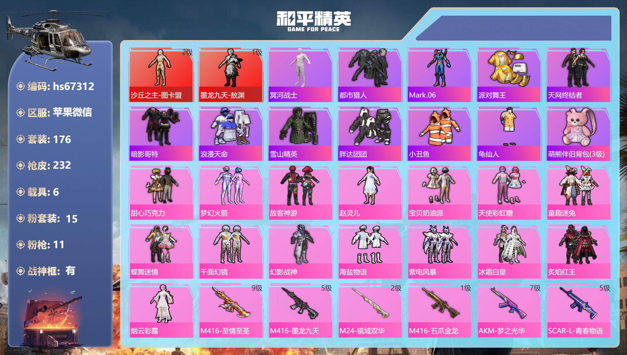 PX_2550149-,苹果微信-18王牌印记-有战神框-2红装-15粉装-11特效枪-6载具-86049热力值-176套装-232枪皮-5卓越印记-3传奇印记 【2红装】墨龙九天-敖渊/1级,沙丘之主-图卡盟/2级 【15粉装】套装-冰霜白皇,套装-童趣迷兔,套装-梦幻火箭,女娲后裔-赵灵儿,套装-天使彩虹糖,套装-蝶舞迷情,套装-幻影战神,套装-炙焰红王,角色-烟云彩露,套装-放客神游,套装-宝贝奶油派,套装-紫电风暴,套装-甜心巧克力,套装-千面幻镜,套装-海盐物语 【11特效枪】MK12-雪月幻音/1级,M416-五爪金龙/1级,M24-镜域双华/2级,M416-墨龙九天/5级,Kar98K-巳巳如意/5级,DP-28-豹影疾电/5级,SCAR-L-青春物语/5级,M416-至情至圣/9级,Mk14-福马献瑞/5级,M249-彩虹甜喵/1级,AKM-梦之光华/7级 【12稀有紫装】冥河战士,都市猎人,Mark.06,派对舞王,天网终结者,暗影哥特,浪漫天命,雪山精英,胖达团团,小丑鱼,龟仙人,萌熊伴侣背包(3级) 【6稀有载具】玛莎拉蒂Quattroporte(夜幕蓝),路特斯ELETRE(花绽灰),时空跃影(星辉银),焰龙咆哮,合金龙骨(绿),星梦玉骢 【1僚机】僚机-萌兔起飞 【175稀有时装】图卡盟/2级,敖渊/1级,甜心巧克力,梦幻火箭,放客神游,赵灵儿,宝贝奶油派,天使彩虹糖,童趣迷兔,蝶舞迷情,千面幻镜,幻影战神,海盐物语,紫电风暴,冰霜白皇,炙焰红王,烟云彩露,TC追光队服,SS38特训,都市猎人,胖达团团,浪漫天命,龟仙人,Mark.06,雪山精英,暗影哥特,小丑鱼,冥河战士,派对舞王,天网终结者,兔兔白日梦,狂沙舞者,粉团憨憨,萌趣咩咩,恶魔人蛛,异域银装,鱼渊荷华,创世·追猎,青团波波,燕燕于飞,NV战队服,战术大师,智谋强哥,雏菊兔兔,马上有钱,糖糖葫芦,晶辉守护,蝶变,曼妙人鱼,狂鲨锋刃,阳光菠萝,绯色魅影,萌鸡速递,薄荷星砂,顶瓜瓜,蓝冰羽,青翼流星,紫幽梦,SS35特训,SS29特训,萝兰蝴蝶,SS31特训,SS33特训,SS32特训,SS36特训,焰鹰斗篷,湖雨初晴,纯白誓言,豚鼠丹丹,雪兔飞飞,夏日音浪,龙的传人,白熊同盟,萌黄之夏,隐空刺,SS37特训,SS28特训,蓝色运动,极速竞梦,飞驰魅影,白色伏地魔,音速流光,热血青春,阳光火鸡,湖蓝色名流,绯格组合,漫步者,空岛之星,热情海星,黑色伏地魔,炫蓝之夏,纯真浪花,SS34特训,竞技名士,猛禽,SS30特训,长空猛禽,特战装甲,软羊咩咩,街头潮人,惊鸿侠骨,魅力单车,缤纷假日,极地朋克,幻世战舞者,特殊使命,红红火火,青涩时光,牛气满满,娇憨猪猪,冰川特警,龙腾端午,幻影公爵,狙击之神,沙漠毒蛇,红釉青花,麻辣教官,鹰眼刺客,雨过天青,沙暴袭击者,福马献瑞,冰冻风暴,幽夜迷踪,俏皮奶喵,热血骑手,暖心橘喵,破蛋小黄鸡,绮丽涂鸦,淡雅花蕊,玲珑飞花,超能勇士,海岛探路者,李逍遥,精神漫游,破晓战魂,和煦暖阳,田园牧歌,轻风白浪,沙漠兵团,耀粉歌者,探宝勇士,SS27特训,牛气冲天,SS18特训,清新柠檬,绚烂繁星,SS19特训,光之冒险,SS20特训,SS21特训,玉兔迎春,SS22特训,SS23特训,呆萌铁蟹,夏日倾情,缤纷果语,电音精灵,神气柴柴,灵蜜圈圈,忍者信条,妙红点点,幻彩翩翩,格斗先锋,幻羽潜行,海盐绵绵冰,老实芭蕉,王牌教练,荣耀,柠萌假日,粉红小猪,SS24特训,鹤鸣,懵萌河马,SS25特训,锦衣飞扬 【234稀有枪械】M416-至情至圣/9级,M416-墨龙九天/5级,M24-镜域双华/2级,M416-五爪金龙/1级,AKM-梦之光华/7级,SCAR-L-青春物语/5级,Kar98K-巳巳如意/5级,Mk14-福马献瑞/5级,M249-彩虹甜喵/1级,DP-28-豹影疾电/5级,MK12-雪月幻音/1级,QBZ-纯真浪花,AWM-纯真浪花,汤姆逊-纯真浪花,DBS-乌木金纹,AA12-G-纯真浪花,平底锅-纯真浪花,Famas-墨龙九天,AMR-墨龙九天,SLR-墨龙九天,撬棍-朗基努斯之枪,蜜獾-精灵梦叶罗丽,SCAR-L-海盐豹豹,平底锅-精灵梦叶罗丽,野牛-雏菊兔兔,Mk14-冰河战士,DP-28-尼罗河传说,平底锅-雏菊兔兔,M762-雏菊兔兔,Mini14-雏菊兔兔,Famas-突变脉冲,R1895-雏菊兔兔,UZI-冰河战士,M16A4-冰河战士,MK20-H-乌木金纹,Win94-乌木金纹,MK12-乌木金纹,PKM-紫幽梦,Mk14-紫幽梦,蜜獾-乌木金纹,S1897-紫幽梦,P92-紫幽梦,SPAS-12-狂鲨锋刃,MK20-H-狂鲨锋刃,铝热弹-炫彩糖果,ARX-像素花束,大砍刀-像素花束,平底锅-紫幽梦,AKS-74U-乌木金纹,AKM-涂鸦街区,Famas-乌木金纹,Famas-霓彩脉冲,破片手榴弹-拽到爆炸,信号枪-异瞳寒姬,烟雾弹-冰氧夏日,Mk14-紫晶流影,MG-36-薄荷星砂,PKM-啾咪啾咪,SVD-霓彩脉冲,蜜獾-鸡智如我,AUG-紫晶流影,S12K-霓彩脉冲,AKM-霓彩脉冲,M416-蓝色火焰,M416-糯团青竹,AKM-影袭,AKM-奇异狩猎者,AKM-彩虹符号,AKM-春暖花开,AKM-龙的传人,AKM-灼热熔岩,AKM-恐龙拽拽,AKM-霓虹街区,SCAR-L-玉兔迎春,SCAR-L-夜灯,M16A4-蓝色火焰,M16A4-冥河战士,M16A4-幻世战舞者,GROZA-春暖花开,GROZA-恐龙拽拽,GROZA-影袭,GROZA-田园牧歌,GROZA-懵萌河马,AUG-耀粉歌者,AUG-甜蜜菠萝,AUG-终结者,AUG-天降萌叽,QBZ-飞驰魅影,QBZ-彩虹符号,M762-甜心宝贝,M762-彩虹甜喵,M762-天降萌叽,Mk47-乌木金纹,Mk47-天之羽翼,Mk47-妙红点点,Mk47-洛神天依,G36C-镜域双华,G36C-懵萌河马,AC-VAL-天降萌叽,AC-VAL-彩虹甜喵,AC-VAL-乌木金纹,蜜獾-天降萌叽,蜜獾-娇憨猪猪,Famas-镜域双华,Kar98K-梦幻火箭,Kar98K-飞驰魅影,Kar98K-影袭,Kar98K-炫彩节奏,M24-乌木金纹,M24-影袭,M24-炫彩节奏,AWM-天降萌叽,AWM-焰鹰斗篷,AWM-垂柳戏鸭,AWM-恐龙拽拽,莫辛纳甘-乌木金纹,莫辛纳甘-懵萌河马,AMR-乌木金纹,AMR-妙红点点,AMR-翩跹演武,M200-惊鸿侠骨,SKS-炫彩节奏,VSS-田园牧歌,Mini14-梦幻火箭,Mini14-筑梦精灵,Mini14-春暖花开,Mk14-童趣迷兔,Mk14-乌木金纹,Mk14-电糖天使,SLR-彩虹符号,SLR-娇憨猪猪,M417-惊鸿侠骨,UZI-红色方程式,UZI-影袭,UZI-幻