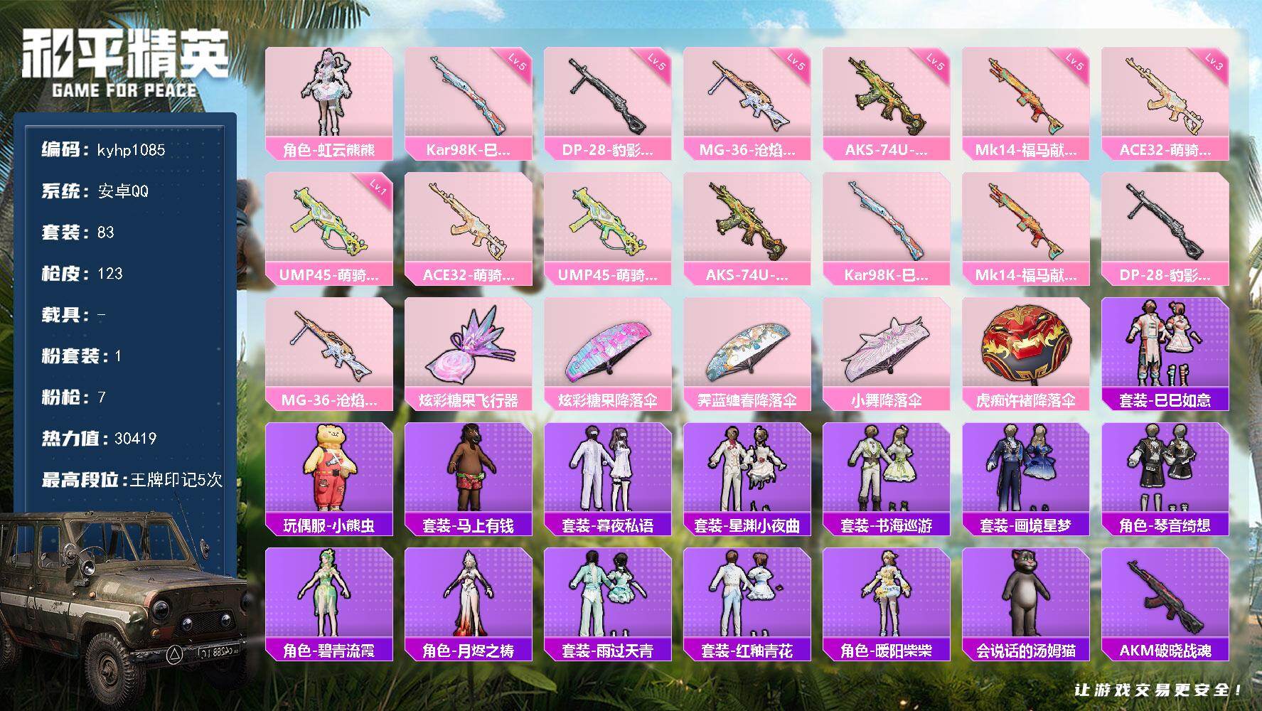 PX_2537087-,安卓手Q-1王牌印记-4特效枪-11727热力值-43套装-47枪皮 【4特效枪】DP-28-豹影疾电/2级,ACE32-萌骑漫游/2级,Kar98K-巳巳如意/2级,Mk14-福马献瑞/5级 【43稀有时装】紫俏灵猫,马上有钱,SS36特训,龙的传人,潮流炫酷,SS37特训,蓝色运动,黄色伏地魔,白色伏地魔,酒红色名流,阳光火鸡,湖蓝色名流,黄色名流,漫步者,黑色伏地魔,竞技名士,深蓝色名流,猛禽,长空猛禽,旭日情侣,冷焰舞者,魅力单车,幻世战舞者,牛气满满,狙击之神,红釉青花,麻辣教官,鹰眼刺客,雨过天青,福马献瑞,冰冻风暴,幻影武者,疯狂小兔子,绮丽涂鸦,奈斯,牛气冲天,SS20特训,SS21特训,玉兔迎春,SS22特训,SS23特训,柠萌假日,SS24特训 【48稀有枪械】Kar98K-巳巳如意/2级,Mk14-福马献瑞/5级,DP-28-豹影疾电/2级,ACE32-萌骑漫游/2级,S1897-精灵梦叶罗丽,MK12-乌木金纹,Kar98K-星穹咏叹调,信号枪-异瞳寒姬,MG-36-薄荷星砂,M416-糯团青竹,AKM-破晓战魂,SCAR-L-玉兔迎春,GROZA-影袭,AUG-幻影战神,AUG-甜蜜菠萝,M762-天降萌叽,Mk47-乌木金纹,AC-VAL-天降萌叽,Kar98K-幻影战神,AWM-天降萌叽,莫辛纳甘-乌木金纹,SKS-炫彩节奏,Mk14-乌木金纹,UZI-幻影战神,Vector-生命誓言,汤姆逊-幻影战神,P90-乌木金纹,S686-生命誓言,S1897-炫彩节奏,S12K-幻世战舞者,S12K-夜灯,MG3-乌木金纹,平底锅-光之冒险,撬棍-幻世战舞者,MG3-火熔核心,ACE32-冰晶雪宝,M16A4-雨过天青,GROZA-福马献瑞,蜜獾-启元战纹,AMR-雨过天青,SLR-乌木金纹,AA12-G-雨过天青,PKM-雨过天青,沙漠之鹰-雨过天青,燃烧瓶-福马献瑞,P90-紫矿核心,汤姆逊-像素花束,MG3-火熔核心 【1稀有飞行器】马上有福飞行器 【3稀有背包】幻影战神背包(3级),华贵君王背包(3级),福马献瑞背包(3级) 【9稀有降落伞】狂鲨锋刃降落伞,雨过天青降落伞,福马献瑞降落伞,都市猎人降落伞,绚烂橙彩降落伞,普通降落伞,化学天才降落伞,白昼之火降落伞,幻世战舞者降落伞 【5稀有头盔】甜蜜菠萝头盔(3级),星穹咏叹调头盔(3级),江南烟雨头盔(3级),深海小丑鱼头盔(3级),福马献瑞头盔(3级)