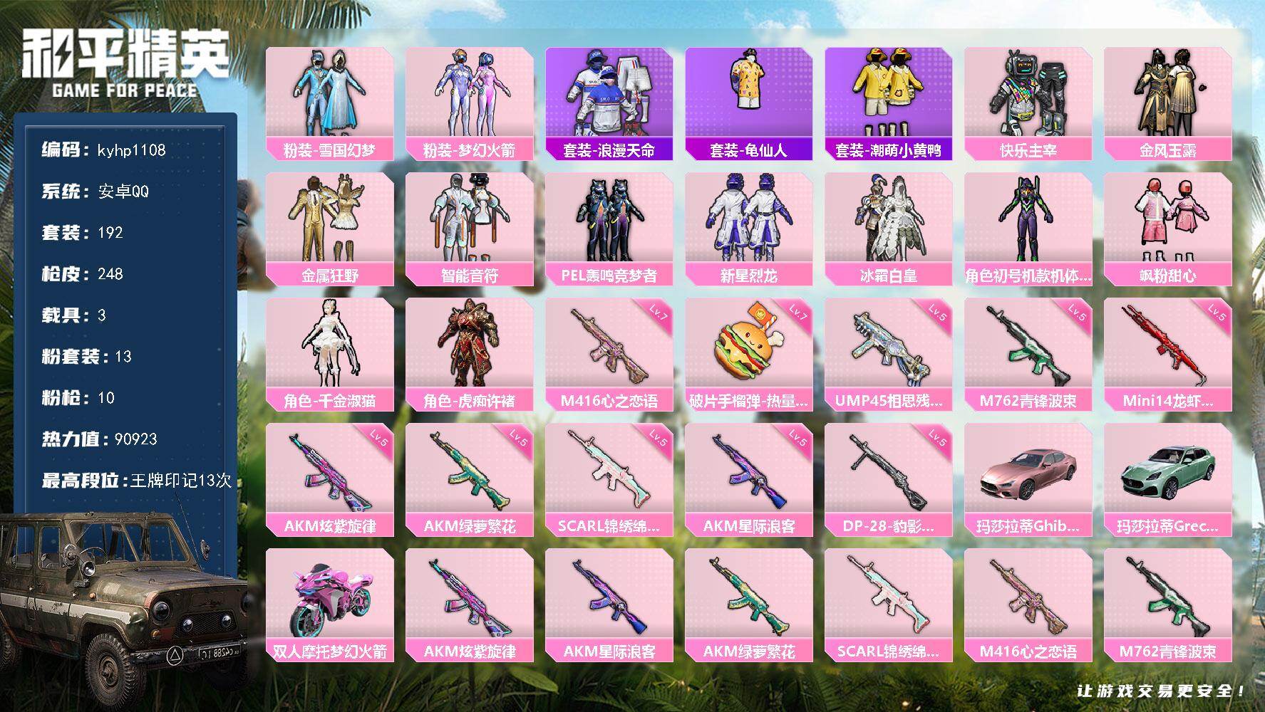 PX_2563492-火箭,SS1特训,洛天依,安卓,微信-7粉装-3特效枪-4载具-2粉色飞行器-60378热力值-16王牌印记-164套装-159枪皮 【热门品类】:粉装-梦幻火箭,套装-深海小丑鱼,套装-SS1特训,套装-龟仙人,套装-潮萌小黄鸭,套装-粉红小猪 【粉色套装】:粉装-数码大师,粉装-宝贝奶油派,粉装-天使彩虹糖,粉装-蝶舞迷情,粉装-梦幻火箭,角色-洛天依,粉装-筑梦精灵 【粉色枪皮等级】:SCAR-L-梦幻火箭(五级),M416-五爪金龙(七级),S12K-海渊国主(一级) 【粉色载具】:兰博基尼URUS(明艳黄),玛莎拉蒂Ghibli(粉),海龙奔腾,双人摩托-梦幻火箭 【粉色枪皮】:SCAR-L-梦幻火箭,M416-五爪金龙,S12K-海渊国主 【粉色飞行器】:春暖花开飞行器,梦幻火箭飞行器 【粉色降落伞】:深海曼妙降落伞,百万伏特降落伞,甜心宝贝降落伞,春暖花开降落伞,梦幻火箭降落伞,四圣焕新降落伞,暗夜玫瑰降落伞,海渊国主降落伞,橘柚倾心降落伞 【稀有套装】:套装-龟仙人 【稀有枪皮】:AKM-冰凉西瓜,AKM-四圣焕新,AKM-彩虹符号,AKM-春暖花开,AKM-海渊国主,AKM-灼热熔岩,AKM-生命誓言,AKM-百万伏特,AKM-萌趣颜团子,AKM-虎虎生威,AKM-霓虹街区,M16A4-幻世战舞者,M16A4-甜心亚梦,M16A4-生命誓言,M16A4-红色方程式,M16A4-蓝色火焰,SCAR-L-暗夜玫瑰,SCAR-L-玉兔迎春,SCAR-L-生命誓言,SCAR-L-雷霆特警,M416-蓝色火焰,GROZA-异彩先驱,GROZA-彩虹符号,GROZA-春暖花开,GROZA-生命誓言,GROZA-雷霆特警,QBZ-洛神天依,QBZ-电玩视界,QBZ-诡娃娃,QBZ-飞驰魅影,M762-拳皇97,M762-深海曼妙,M762-牛气冲天,M762-瑞龙福将,M762-生命誓言,M762-诡娃娃,Mk47-洛神天依,Mk47-百万伏特,G36C-时空追击者,AC-VAL-甜心亚梦,蜜獾-天降萌叽,UZI-啾咪啾咪,UZI-炫彩节奏,UZI-魔法学院,UMP45-圣诞大吉,UMP45-夜灯,UMP45-时空追击者,UMP45-春暖花开,UMP45-海渊国主,UMP45-生命誓言,UMP45-粉色回忆,UMP45-蓝色火焰,UMP45-诡娃娃,Vec