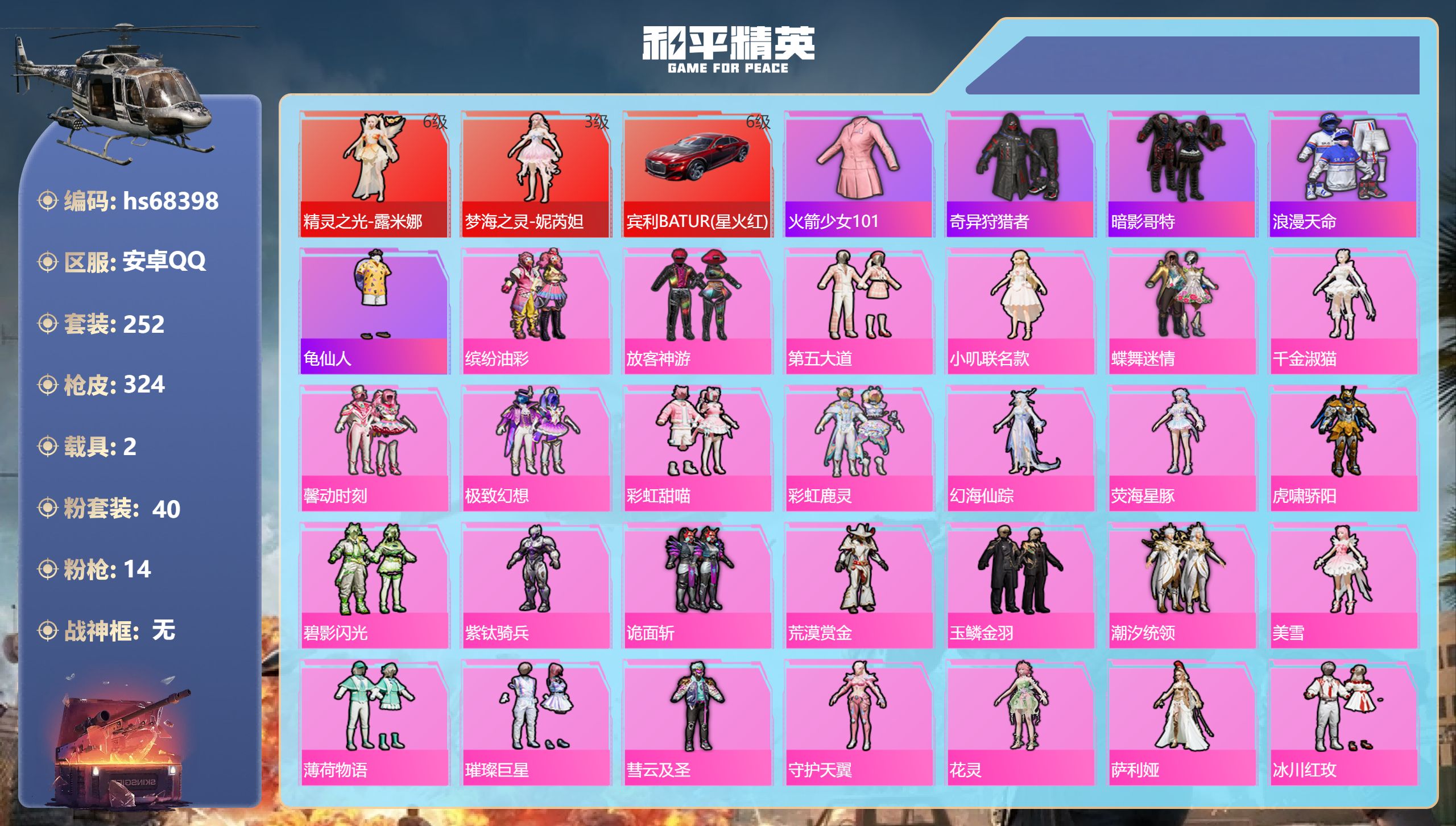 PX_2552835-,安卓手Q-4王牌印记-2红装-40粉装-14特效枪-2载具-热力值-252套装-324枪皮 【2红装】精灵之光-露米娜/6级,梦海之灵-妮芮妲/3级 【40粉装】套装-纯珍童话,角色-美雪,套装-瑰丽时代,套装-缤纷油彩,角色-时光之誓,角色-紫钛骑兵,套装-炙焰红王,角色-萨利娅,套装-金丰海韵,套装-璀璨巨星,套装-彩虹鹿灵,套装-玉鳞金羽,套装-御兔特攻,角色-荧海星豚,套装-第五大道,套装-潮汐统领,套装-馨动时刻,角色-小叽联名款,套装-仲夏莫吉托,套装-冰川红玫,角色-幻海仙踪,角色-花灵,套装-冠军兔兔,角色-千金淑猫,套装-心之回忆,套装-吟月归客,套装-碧影闪光,套装-翡翠骑士,套装-彩虹甜喵,套装-诡面斩,套装-蝶舞迷情,套装-极致幻想,套装-虎啸骄阳,套装-荒漠赏金,套装-彗云及圣,角色-时光之吻,套装-放客神游,套装-薄荷物语,角色-守护天翼,套装-挚爱序曲 【14特效枪】Kar98K-巳巳如意/5级,M417-第五大道/7级,Mk14-樱桃泡泡/1级,Vector-环太平洋/5级,M200-玉鳞金羽/4级,DP-28-千金淑猫/5级,SCAR-L-魔童闹海,哪吒/3级,GROZA-精灵之光/3级,DP-28-暗夜鎏金/1级,AMR-鸢尾晶梦/7级,P90-金丰海韵/4级,M200-梦海之灵/3级,DP-28-豹影疾电/1级,烟雾弹-丁香清露/4级 【1热门】火箭少女101 【4稀有紫装】奇异狩猎者,暗影哥特,浪漫天命,龟仙人 【2稀有载具】宾利BATUR(星火红)/6级,冰绡玉鳞 【252稀有时装】露米娜/6级,妮芮妲/3级,缤纷油彩,放客神游,第五大道,小叽联名款,蝶舞迷情,千金淑猫,馨动时刻,极致幻想,彩虹甜喵,彩虹鹿灵,幻海仙踪,荧海星豚,虎啸骄阳,碧影闪光,紫钛骑兵,诡面斩,荒漠赏金,玉鳞金羽,潮汐统领,美雪,薄荷物语,璀璨巨星,彗云及圣,守护天翼,花灵,萨利娅,冰川红玫,冠军兔兔,炙焰红王,御兔特攻,吟月归客,翡翠骑士,纯珍童话,心之回忆,挚爱序曲,金丰海韵,瑰丽时代,仲夏莫吉托,时光之吻,时光之誓,火箭少女101,浪漫天命,奇异狩猎者,龟仙人,暗影哥特,粉团憨憨,萌趣咩咩,神秘黑猫,软萌银虎,晶灵使者,石蕴玉辉,龙魂突击队,铁血战翼,,暗影刺翼,小熊娃娃,狂花道·雅典娜,鲛海歌灵,异域银装,纯白跃动,狂花道·娜可露露,都市丽猫,摩登魅猫,街头风暴,星途旅人,光矢逐梦,蜜桃派对,糖霜甜心,冰河战士,鱼渊荷华,俏兔智灵,青团波波,大橘大利,燕燕于飞,海琴烟,达芬奇,风玲,战术大师,智谋强哥,雏菊兔兔,多纳泰罗,糖糖葫芦,香桃花海,蝶变,巳巳如意,粉恋花,粉日山川,湖畔霞光,曼妙人鱼,棉花软糖,元素星魂,彩虹兔,雪绒豹,朱霞炽焰,懒羊羊,美羊羊,凌霄紫焰,粉黛兰香,炫彩糖果,萌鸡速递,元气之梦,蜜露汐语,薄荷星砂,云朵鹅,顶瓜瓜,雪国风尚,蓝冰羽,恋语绒绒,紫幽梦,SS35特训,SS29特训,萝兰蝴蝶,SS31特训,SS33特训,SS32特训,贝斯之夜,舰行太空,焰鹰斗篷,月光变奏,梦幻玩咖,金鼠迎春,冰爽风暴,源星混沌,福星高照,雪兔飞飞,都市漫游者,银松藏云,虎虎生威吉莉,夏日音浪,龙的传人,青玉碎影,萌黄之夏,影双刃,星谷精灵,落日神探,SS28特训,人鱼之吻,摇滚狂鲨,特训学院,飞驰魅影,音速流光,活力之心,湖蓝色名流,黄色名流,丝绸行者,酷潮明星,绯格组合,涂山之恋,SS26特训,空岛之星,热情海星,黑色伏地魔,炫蓝之夏,纯真浪花,SS34特训,竞技名士,蓝色守护者,深蓝色名流,赤地牡丹,猛禽,SS30特训,长空猛禽,特战装甲,山经魅狐,灰色格斗者,怒火燎原,冷焰舞者,惊鸿侠骨,魅力单车,春光漫游,战地英姿,浪漫假日,极地朋克,贵族骑装,幻世战舞者,战地督导,青涩时光,青春校园,牛气满满,娇憨猪猪,麻辣教官,幽夜迷踪,日照花林,快闪甜心,蓝彩潮人,绮丽涂鸦,坚韧舞者,竞技达人朋克,淡雅花蕊,玲珑飞花,超能勇士,林月如,破晓战魂,霓虹街区,田园牧歌,萌趣颜团子,轻风白浪,风华少年志,琉璃情波,照水倚天,暗黑裁决,SS27特训,SS18特训,治愈之星,科技之星,碧波幻想,飞行日记,SS17特训,瑞龙福将,团圆交子,金耀舞者,蓝调潮人,异彩先驱,霓虹极客,空投萌叽,金戈铁马,SS19特训,光之冒险,SS20特训,SS21特训,玉兔迎春,梦起落英,SS22特训,星河入梦,冰爽海盐,浪漫樱花,夏日倾情,滨海厨神,莱茵河畔,青涩年华,香榭午后,SS14特训,白兰地假日,龙舌兰冰茶,神气柴柴,妙红点点,幻彩翩翩,格斗先锋,幻羽潜行,海盐绵绵冰,老实芭蕉,吉莉礼服,王牌教练,荣耀,柠萌假日,SS24特训,懵萌河马,软软小魔女,SS25特训,锦衣飞扬,SS15特训 【324稀有枪械】SCAR-L-魔童闹海,哪吒/3级,GROZA-精灵之光/3级,M200-梦海之灵/3级,Kar98K-巳巳如意/5级,AMR-鸢尾晶梦/7级,M200-玉鳞金羽/4级,Mk14-樱桃泡泡/1级,Vector-环太平洋/5级,P90-金丰海韵/4级,DP-28-千金淑猫/5级,DP-28-豹影疾电/1级,DP-28-暗夜鎏金/1级,M417-第五大道/7级,烟雾弹-丁香清露/4级,MG3-梦海之灵,AC-VAL-梦海之灵,UZI-梦海之灵,QBZ-纯真浪花,AWM-纯真浪花,汤姆逊-纯真浪花,DBS-乌木金纹,AA12-G-纯真浪花,平底锅-纯真浪花,P1911-创世·救赎,撬棍-朗基努斯之枪,M417-鸢尾晶梦,大砍刀-鸢尾晶梦,SCAR-L-海盐豹豹,SKS-冠军兔兔,GROZA-海盐豹豹,SLR-金丰海韵,野牛-雏菊兔兔,蝎式手枪-金丰海韵,Mk14-冰河战士,平底锅-雏菊兔兔,M762-雏菊兔兔,Mini14-雏菊兔兔,Famas-突变脉冲,M200-宇宙意志,短管霰弹-宇宙意志,Vector-突变脉冲,R1895-雏菊兔兔,撬棍-突变脉冲,M249-金丰海韵,UZI-冰河战士,M16A4-冰河战士,MK20-H-乌木金纹,Win94-乌木金纹,MK12-乌木金纹,烟雾弹-冰澜龙吟,S12K-极意拳锋,PKM-紫幽梦,MG3-霓彩脉冲,Mk14-紫幽梦,蜜獾-乌木金纹,M762-云朵鹅,S1897-紫幽梦,SVD-云朵鹅,P92-紫幽梦,M417-玩趣呆呆,MK20-H