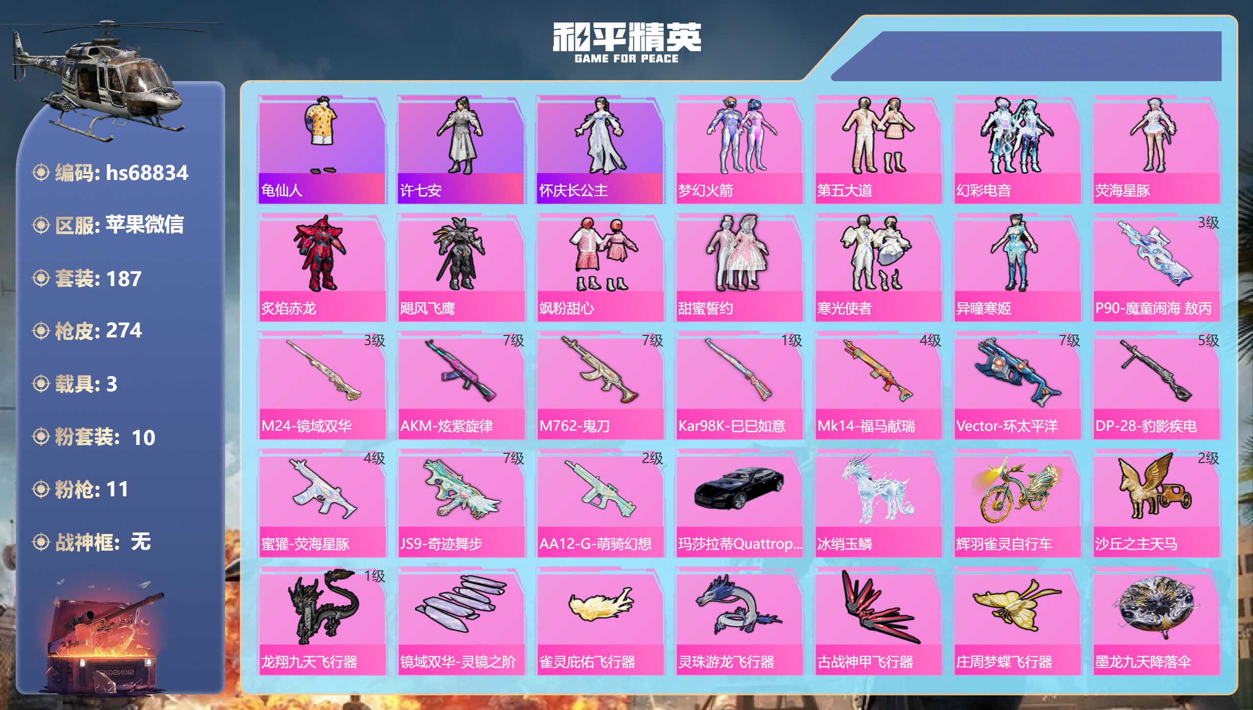 PX_2551808-,苹果微信-13王牌印记-10粉装-11特效枪-3载具-88882热力值-187套装-274枪皮-3卓越印记 【10粉装】套装-寒光使者,套装-炙焰赤龙,套装-第五大道,套装-飒粉甜心,套装-甜蜜誓约,套装-幻彩电音,角色-荧海星豚,角色-异瞳寒姬,套装-梦幻火箭,套装-飓风飞鹰 【11特效枪】Mk14-福马献瑞/4级,P90-魔童闹海,敖丙/3级,AA12-G-萌骑幻想/2级,蜜獾-荧海星豚/4级,M24-镜域双华/3级,DP-28-豹影疾电/5级,JS9-奇迹舞步/7级,M762-鬼刀/7级,Vector-环太平洋/7级,AKM-炫紫旋律/7级,Kar98K-巳巳如意/1级 【3稀有紫装】龟仙人,许七安,怀庆长公主 【3稀有载具】玛莎拉蒂Quattroporte(夜幕蓝),冰绡玉鳞,辉羽雀灵自行车 【187稀有时装】梦幻火箭,第五大道,幻彩电音,荧海星豚,炙焰赤龙,飓风飞鹰,飒粉甜心,甜蜜誓约,寒光使者,异瞳寒姬,SS38特训,龟仙人,潮萌小黄鸭,萌趣咩咩,异域银装,街头风暴,霜纹水星,冰河战士,鱼渊荷华,青团波波,拉斐尔,大橘大利,燕燕于飞,碧青流霞,战术大师,智谋强哥,怀庆长公主,许七安,雏菊兔兔,马上有钱,糖糖葫芦,蝶变,巳巳如意,粉恋花,粉日山川,彩虹兔,极光猎影,琴音绮想,霓虹热舞,雪绒豹,画境星梦,星影赞美诗,朱霞炽焰,狂鲨锋刃,游乐,懒羊羊,凌霄紫焰,粉黛兰香,擎苍青焰,萌鸡速递,元气之梦,书海巡游,圣穹绘梦,蜜露汐语,薄荷星砂,蓝海鲸歌,云朵鹅,顶瓜瓜,雪国风尚,蓝冰羽,恋语绒绒,青翼流星,紫幽梦,琉璃花蕾,SS35特训,迷域探索者,SS29特训,萝兰蝴蝶,SS31特训,SS33特训,SS32特训,无暇誓言,明鸳圣池,SS36特训,黑色刀锋,暗夜契约,纯白誓言,龙的传人,深山诡影,潮流炫酷,SS8特训,众神之王,智慧之神,青玉碎影,SS37特训,特训学院,青年教官,浓情蜜辣,飞驰魅影,白色伏地魔,音速流光,热血青春,SS9特训,阳光火鸡,湖蓝色名流,酷潮明星,绯格组合,涂山之恋,薄荷蓝莓,黑色伏地魔,黎明保卫者,炫蓝之夏,SS34特训,骑行爱好者,竞技名士,猛禽,SS30特训,长空猛禽,安第斯皇冠,特战装甲,街头潮人,丛林猎人,甜心亚梦,虚音幻奏,极地朋克,幻世战舞者,特殊使命,青涩时光,牛气满满,娇憨猪猪,春日漫步,冰川特警,龙腾端午,滨海假日,极速红龙,狙击之神,麻辣教官,鹰眼刺客,魅影蝠王,福马献瑞,SS11特训,幻影武者,破蛋小黄鸡,疯狂小兔子,梦幻奶油,蓝彩潮人,绮丽涂鸦,竞技达人朋克,野性战心,原初圣火,逆风勇士,海岛探路者,初火先锋,SS7特训,核芯基因,精神漫游,破晓战魂,和煦暖阳,霓虹街区,田园牧歌,轻风白浪,SS10特训,沙漠兵团,闪金天王,镭射皇者,探宝勇士,SS12特训,牛气冲天,SS18特训,银白舞王,SS13特训,飞行日记,SS17特训,团圆交子,金耀舞者,SS19特训,光之冒险,SS20特训,SS21特训,玉兔迎春,SS22特训,SS23特训,摩登艾咪,滨海厨神,香榭午后,SS14特训,神气柴柴,灵蜜圈圈,妙红点点,幻彩翩翩,王牌教练,柠萌假日,SS24特训,鹤鸣,懵萌河马,SS15特训,深蓝冒险家 【274稀有枪械】P90-魔童闹海,敖丙/3级,M24-镜域双华/3级,AKM-炫紫旋律/7级,M762-鬼刀/7级,Kar98K-巳巳如意/1级,Mk14-福马献瑞/4级,Vector-环太平洋/7级,DP-28-豹影疾电/5级,蜜獾-荧海星豚/4级,JS9-奇迹舞步/7级,AA12-G-萌骑幻想/2级,野牛-雏菊兔兔,Mk14-冰河战士,平底锅-雏菊兔兔,M762-雏菊兔兔,Mini14-雏菊兔兔,Famas-突变脉冲,M200-宇宙意志,短管霰弹-宇宙意志,R1895-雏菊兔兔,M249-金丰海韵,UZI-冰河战士,M16A4-冰河战士,MK20-H-乌木金纹,Mini14-鸡智如我,Win94-乌木金纹,MK12-乌木金纹,SVD-冷漠罗丽,撬棍-冷漠罗丽,烟雾弹-冰澜龙吟,AKM-极光猎影,AKS-74U-极光猎影,PKM-紫幽梦,MG3-霓彩脉冲,ACE32-画境星梦,M1加兰德-画境星梦,MP5K-画境星梦,Mk14-紫幽梦,蜜獾-乌木金纹,M762-云朵鹅,S1897-紫幽梦,SVD-云朵鹅,P92-紫幽梦,SPAS-12-狂鲨锋刃,M417-玩趣呆呆,MK20-H-狂鲨锋刃,铝热弹-炫彩糖果,UZI-炫彩糖果,ARX-像素花束,UMP45-极意拳锋,Mini14-绯穹魔姬,AA12-G-画境星梦,G36C-星穹咏叹调,平底锅-画境星梦,短管霰弹-星穹咏叹调,M249-冰晶雪宝,JS9-凌霄紫焰,MG-36-凌霄紫焰,平底锅-紫幽梦,破片手榴弹-海盐豹豹,UMP45-海盐豹豹,ARX-凌霄紫焰,AKS-74U-乌木金纹,AKM-涂鸦街区,爆炸猎弓-喜羊羊与灰太狼,P92-凌霄紫焰,Famas-乌木金纹,Famas-霓彩脉冲,SPAS-12-云朵鹅,M249-无面战甲,破片手榴弹-拽到爆炸,平底锅-辉羽雀灵,Mini14-辉羽雀灵,平底锅-凌霄紫焰,AKS-74U-鸡智如我,S12K-智耀战神,沙漠之鹰-云朵鹅,烟雾弹-冰氧夏日,Mk14-紫晶流影,MG-36-薄荷星砂,大砍刀-云朵鹅,PKM-啾咪啾咪,SLR-圣穹绘梦,UMP45-圣穹绘梦,沙漠之鹰-圣穹绘梦,GROZA-荧海星豚,S1897-荧海星豚,DBS-荧海星豚,SLR-霓彩脉冲,平底锅-属我最6,SCAR-L-彩虹符号,AKS-74U-翎光蝶翼,蜜獾-冰澜龙吟,大砍刀-冰澜龙吟,蜜獾-鸡智如我,AUG-紫晶流影,S12K-霓彩脉冲,AMR-鸡智如我,AKM-霓彩脉冲,M416-红色方程式,M416-乌木金纹,M416-夜灯,M416-糯团青竹,AKM-夜灯,AKM-乌木金纹,AKM-彩虹符号,SCAR-L-玉兔迎春,SCAR-L-乌木金纹,SCAR-L-甜蜜誓约,SCAR-L-夜灯,SCAR-L-炫彩节奏,M16A4-甜心亚梦,GROZA-乌木金纹,GROZA-黑色刀锋,GROZA-异彩先驱,GROZA-影袭,GROZA-田园牧歌,GROZA-懵萌河马,AUG-耀粉歌者,AUG-天降萌叽,QBZ-神秘黑猫,QBZ-飞驰魅影,QBZ-原初圣火,QBZ-乌木金纹,QBZ-彩虹符号,M762-镭射皇者,M762-乌木金纹,M762-彩虹符号,M762-牛气冲天,M762-天降萌叽,Mk47-乌木金纹,Mk47-妙红点点,Mk47-洛神天依,G36C-镜域双华,G36C-乌木金纹,G36C-懵萌河马,G36C-古战神甲,AC-VAL-天降萌叽,AC-VAL-彩虹甜喵,AC-VAL-甜心亚梦,AC-VAL-魅影蝠王,AC-VAL-乌木金纹,蜜獾-天降萌叽,蜜獾-娇憨猪猪,Kar98K-红色方程式,Kar98K-魅影