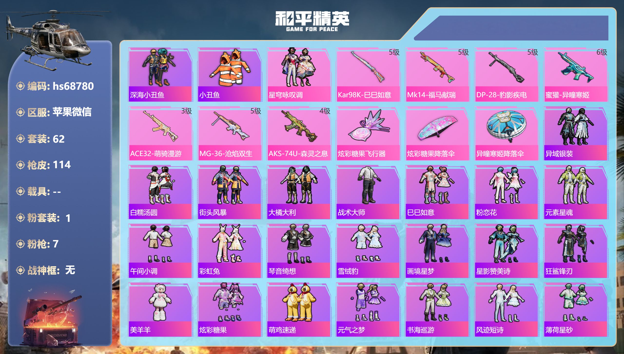 PX_2551715-,苹果微信-6王牌印记-1粉装-7特效枪-26873热力值-62套装-114枪皮-5卓越印记-3传奇印记 【1粉装】套装-星穹咏叹调 【7特效枪】DP-28-豹影疾电/5级,Kar98K-巳巳如意/5级,Mk14-福马献瑞/5级,AKS-74U-森灵之息/4级,MG-36-沧焰双生/5级,蜜獾-异瞳寒姬/6级,ACE32-萌骑漫游/3级 【2稀有紫装】深海小丑鱼,小丑鱼 【62稀有时装】星穹咏叹调,深海小丑鱼,小丑鱼,异域银装,白糯汤圆,街头风暴,大橘大利,战术大师,巳巳如意,粉恋花,元素星魂,午间小调,彩虹兔,琴音绮想,雪绒豹,画境星梦,星影赞美诗,狂鲨锋刃,美羊羊,炫彩糖果,萌鸡速递,元气之梦,书海巡游,风迹短诗,薄荷星砂,秘语星愿,云朵鹅,顶瓜瓜,雪国风尚,蓝冰羽,恋语绒绒,青翼流星,紫幽梦,马上来财,SS35特训,SS31特训,SS33特训,SS32特训,SS36特训,潮流炫酷,SS37特训,黄色运动,黄色伏地魔,阳光火鸡,湖蓝色名流,黄色名流,顽皮玉兔,SS34特训,猛禽,特战装甲,旭日情侣,街头潮人,狙击之神,红釉青花,雨过天青,福马献瑞,完美偶像,幻影武者,破蛋小黄鸡,蓝彩潮人,绮丽涂鸦,缤纷果语 【115稀有枪械】Kar98K-巳巳如意/5级,Mk14-福马献瑞/5级,DP-28-豹影疾电/5级,蜜獾-异瞳寒姬/6级,ACE32-萌骑漫游/3级,MG-36-沧焰双生/5级,AKS-74U-森灵之息/4级,GROZA-海盐豹豹,DBS-风迹短诗,莫辛纳甘-风迹短诗,Win94-乌木金纹,MK12-风迹短诗,MK12-乌木金纹,SVD-冷漠罗丽,破片手榴弹-爆破雪人,PKM-紫幽梦,MG3-桃粉嫣然,MG3-霓彩脉冲,DBS-幻彩电音,ACE32-画境星梦,M1加兰德-画境星梦,MP5K-画境星梦,Mk14-紫幽梦,M24-幻彩电音,蜜獾-乌木金纹,M762-云朵鹅,S1897-紫幽梦,SVD-云朵鹅,P92-紫幽梦,蜜獾-绯穹魔姬,SPAS-12-狂鲨锋刃,M417-玩趣呆呆,MK20-H-狂鲨锋刃,AUG-冰晶雪宝,铝热弹-炫彩糖果,UZI-炫彩糖果,大砍刀-像素花束,AA12-G-画境星梦,G36C-星穹咏叹调,平底锅-画境星梦,短管霰弹-星穹咏叹调,M249-冰晶雪宝,Mk47-风迹短诗,平底锅-紫幽梦,破片手榴弹-海盐豹豹,UMP45-海盐豹豹,AKS-74U-乌木金纹,AKM-涂鸦街区,蜜獾-风迹短诗,Famas-乌木金纹,Famas-霓彩脉冲,SPAS-12-云朵鹅,破片手榴弹-拽到爆炸,十字弩-异瞳寒姬,S1897-糯团青竹,信号枪-异瞳寒姬,Mk14-薄荷星砂,AKS-74U-鸡智如我,汤姆逊-智耀战神,沙漠之鹰-云朵鹅,烟雾弹-冰氧夏日,Mk14-紫晶流影,MG-36-薄荷星砂,大砍刀-云朵鹅,PKM-啾咪啾咪,S1897-荧海星豚,SLR-霓彩脉冲,SCAR-L-彩虹符号,蜜獾-鸡智如我,S12K-霓彩脉冲,AMR-鸡智如我,AKM-霓彩脉冲,M416-红色方程式,AKM-缤纷海域,AKM-破晓战魂,SCAR-L-红色方程式,SCAR-L-夜灯,SCAR-L-炫彩节奏,AUG-耀粉歌者,M762-彩虹符号,M24-炫彩节奏,AWM-黄金龙骨,SKS-迅猛狂鲨,Mini14-穿刺龙虾,UZI-天降萌叽,UZI-啾咪啾咪,UMP45-夜灯,S12K-夜灯,DP-28-彩虹符号,MG3-幻世战舞者,撬棍-冰晶雪宝,MG3-火熔核心,ACE32-冰晶雪宝,AUG-异域银装,M200-乌木金纹,十字弩-异域银装,S686-巳巳如意,M16A4-雨过天青,GROZA-福马献瑞,蜜獾-启元战纹,AMR-雨过天青,SLR-乌木金纹,AA12-G-雨过天青,PKM-雨过天青,沙漠之鹰-雨过天青,燃烧瓶-福马献瑞,P90-紫矿核心,GROZA-紫矿核心,Mk47-虹云熊熊,SPAS-12-福马献瑞,VSS-香桃花海,汤姆逊-像素花束,P90-巳巳如意,破片手榴弹-巳巳如意,MG3-火熔核心 【6稀有飞行器】狂鲨锋刃飞行器,鸡智如我飞行器,炫彩糖果飞行器,登顶巅峰飞行器,破刃行动尾迹,异域银装飞行器 【17稀有背包】狂鲨锋刃背包(3级),画境星梦背包(3级),星穹咏叹调背包(3级),炫彩糖果背包(3级),紫幽梦背包(3级),薄荷星砂背包(3级),风迹短诗背包(3级),荧海星豚背包(3级),巳巳如意背包(3级),云朵鹅背包(3级),异域银装背包(3级),雪国风尚背包(3级),齐天大圣背包(3级),金羽特工背包(3级),福马献瑞背包(3级),智谋强哥背包(3级),深海小丑鱼背包(3级) 【24稀有降落伞】SS35王牌降落伞,SS36王牌降落伞,SS32王牌降落伞,属我最6降落伞,炫彩糖果降落伞,狂鲨锋刃降落伞,雨过天青降落伞,福马献瑞降落伞,画境星梦降落伞,紫幽梦降落伞,SS34王牌降落伞,百战成名降落伞,异瞳寒姬降落伞,SS33王牌降落伞,风迹短诗降落伞,云朵鹅降落伞,一举夺葵降落伞,绚烂橙彩降落伞,普通降落伞,白昼之火降落伞,异域银装降落伞,寂夜之火降落伞,勇者同行降落伞,电竞之星降落伞 【17稀有头盔】雪国风尚头盔(3级),幻彩电音头盔(3级),狂鲨锋刃头盔(3级),炫彩糖果头盔(3级),星穹咏叹调头盔(3级),紫幽梦头盔(3级),异瞳寒姬头盔(3级),粉黛兰香头盔(3级),萌鸡速递头盔(3级),绝对恒星头盔(3级),风迹短诗头盔(3级),画境星梦头盔(3级),云朵鹅头盔(3级),异域银装头盔(3级),深海小丑鱼头盔(3级),虹云熊熊头盔(3级),福马献瑞头盔(3级)