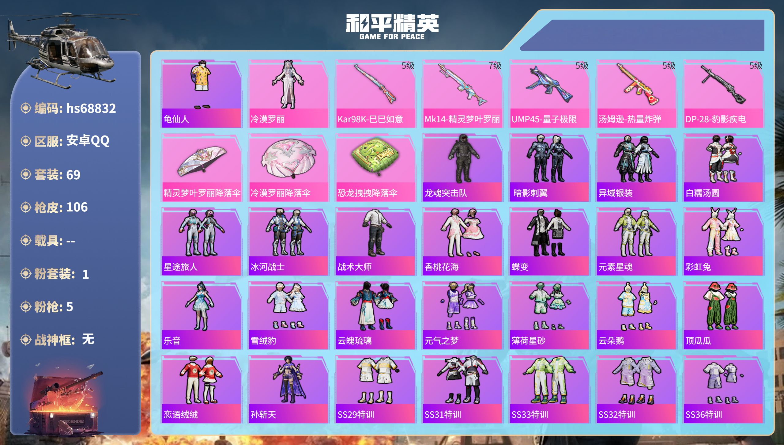 PX_2558459-,安卓手Q-4王牌印记-1粉装-5特效枪-31836热力值-69套装-106枪皮 【1粉装】角色-冷漠罗丽 【5特效枪】汤姆逊-热量炸弹/5级,UMP45-量子极限/5级,DP-28-豹影疾电/5级,Mk14-精灵梦叶罗丽/7级,Kar98K-巳巳如意/5级 【1稀有紫装】龟仙人 【69稀有时装】冷漠罗丽,龟仙人,龙魂突击队,,暗影刺翼,异域银装,白糯汤圆,星途旅人,冰河战士,战术大师,香桃花海,蝶变,元素星魂,彩虹兔,乐音,雪绒豹,云魄琉璃,元气之梦,薄荷星砂,云朵鹅,顶瓜瓜,恋语绒绒,孙斩天,SS29特训,SS31特训,SS33特训,SS32特训,SS36特训,焰鹰斗篷,雪兔飞飞,都市漫游者,虎虎生威吉莉,龙的传人,潮流炫酷,SS28特训,猎鹰,湖蓝色名流,涂山之恋,SS26特训,空岛之星,热情海星,黑色伏地魔,纯真浪花,SS34特训,竞技名士,雨林探路者,SS30特训,长空猛禽,惊鸿侠骨,灼焰舞者,云霞荷露,春光漫游,冰川特警,狙击之神,幽夜迷踪,快闪甜心,绮丽涂鸦,竞技达人朋克,破晓战魂,SS27特训,SS17特训,缤纷果语,幻羽潜行,海盐绵绵冰,老实芭蕉,吉莉礼服,荣耀,SS24特训,SS25特训,锦衣飞扬 【106稀有枪械】Kar98K-巳巳如意/5级,Mk14-精灵梦叶罗丽/7级,UMP45-量子极限/5级,汤姆逊-热量炸弹/5级,DP-28-豹影疾电/5级,QBZ-纯真浪花,AWM-纯真浪花,汤姆逊-纯真浪花,DBS-乌木金纹,AA12-G-纯真浪花,平底锅-纯真浪花,SCAR-L-海盐豹豹,GROZA-海盐豹豹,Mk14-冰河战士,UZI-冰河战士,M16A4-冰河战士,MK20-H-乌木金纹,GROZA-无面战甲,MG3-霓彩脉冲,DBS-幻彩电音,蜜獾-乌木金纹,M762-云朵鹅,SVD-云朵鹅,M417-玩趣呆呆,MK20-H-狂鲨锋刃,AKS-74U-乌木金纹,AKM-涂鸦街区,Famas-乌木金纹,SPAS-12-云朵鹅,M249-无面战甲,S1897-糯团青竹,AKS-74U-鸡智如我,汤姆逊-智耀战神,S12K-智耀战神,沙漠之鹰-云朵鹅,烟雾弹-冰氧夏日,大砍刀-云朵鹅,P1911-无面战甲,蜜獾-鸡智如我,M416-红色方程式,M416-糯团青竹,AKM-生命誓言,AKM-龙的传人,AKM-虎虎生威,SCAR-L-黄金龙骨,M16A4-幻世战舞者,AUG-天降萌叽,G36C-乌木金纹,AC-VAL-闲梦青缨,AC-VAL-快闪甜心,AC-VAL-乌木金纹,蜜獾-天降萌叽,Kar98K-红色方程式,Kar98K-彩虹符号,AWM-天降萌叽,AWM-焰鹰斗篷,AWM-恐龙拽拽,AMR-乌木金纹,M200-惊鸿侠骨,VSS-彩虹符号,Mini14-炫彩节奏,Mk14-乌木金纹,SLR-守护天翼,M417-惊鸿侠骨,MK20-H-快闪甜心,UZI-啾咪啾咪,UMP45-生命誓言,Vector-生命誓言,Vector-彩虹符号,Vector-焰鹰斗篷,汤姆逊-天降萌叽,MP5K-乌木金纹,P90-乌木金纹,P90-快闪甜心,P90-玩趣呆呆,S686-彩虹符号,S686-生命誓言,S12K-玩趣呆呆,DBS-焰鹰斗篷,DBS-彩虹符号,M249-彩虹符号,M249-糯团青竹,DP-28-焰鹰斗篷,DP-28-彩虹符号,MG3-惊鸿侠骨,沙漠之鹰-快闪甜心,TMP-9-江南烟雨,平底锅-惊鸿侠骨,平底锅-快闪甜心,平底锅-焰鹰斗篷,爆炸猎弓-惊鸿侠骨,破片手榴弹-呆爆全场,Kar98K-顶峰精英,S686-千金淑猫,AUG-异域银装,VSS-虎痴许褚,MK20-H-星途旅人,M200-乌木金纹,十字弩-异域银装,SCAR-L-星途旅人,SPAS-12-乌木金纹,破片手榴弹-星途旅人,AKM-荧星灵猫,GROZA-福马献瑞,VSS-香桃花海,Mini14-香桃花海 【4稀有飞行器】破刃行动尾迹,粉色滑翔尾迹,顶峰精英尾迹,异域银装飞行器 【16稀有背包】冷漠罗丽背包(3级),薄荷星砂背包(3级),巳巳如意背包(3级),云朵鹅背包(3级),焰鹰斗篷背包(3级),海盐豹豹背包(3级),快闪甜心背包(3级),蝶变背包(3级),千金淑猫背包(3级),虎痴许褚背包(3级),异域银装背包(3级),龙的传人背包(3级),洛神天依背包(3级),福马献瑞背包(3级),香桃花海背包(3级),冰河战士背包(3级) 【26稀有降落伞】纯真浪花降落伞,精灵梦叶罗丽降落伞,无面战甲降落伞,冷漠罗丽降落伞,SS32王牌降落伞,属我最6降落伞,福马献瑞降落伞,SS34王牌降落伞,SS33王牌降落伞,云朵鹅降落伞,一举夺葵降落伞,焰鹰斗篷降落伞,恐龙拽拽降落伞,普通降落伞,化学天才降落伞,迎春赐福降落伞,异域银装降落伞,寂夜之火降落伞,惊鸿侠骨降落伞,SS30王牌降落伞,香桃花海降落伞,踏青降落伞,快闪甜心降落伞,冰河战士降落伞,蓝海之火降落伞,幻世战舞者降落伞 【11稀有头盔】云朵鹅头盔(3级),龙的传人头盔(3级),海盐豹豹头盔(3级),异域银装头盔(3级),焰鹰斗篷头盔(3级),惊鸿侠骨头盔(3级),香桃花海头盔(3级),暗夜玫瑰头盔(3级),虎虎生威头盔(3级),恐龙拽拽头盔(3级),冰河战士头盔(3级)