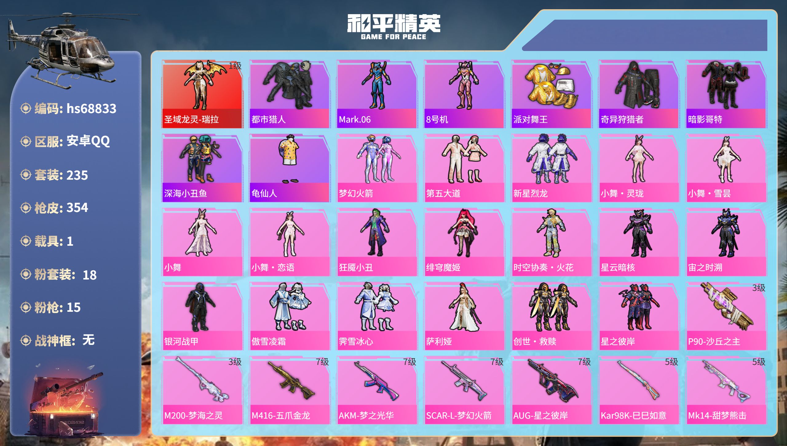 PX_2558464-,安卓手Q-13王牌印记-1红装-18粉装-15特效枪-1载具-热力值-235套装-354枪皮-2卓越印记 【1红装】圣域龙灵-瑞拉/1级 【18粉装】套装-霁雪冰心,套装-银河战甲,角色-狂魇小丑,角色-星云暗核,人物-小舞·灵珑,角色-宙之时溯,套装-傲雪凌霜,人物-小舞·雪昙,角色-绯穹魔姬,套装-新星烈龙,角色-萨利娅,人物-小舞·恋语,套装-第五大道,人物-小舞,套装-梦幻火箭,套装-创世·救赎,套装-星之彼岸,时空协奏·火花 【15特效枪】M416-五爪金龙/7级,DP-28-豹影疾电/5级,Mk14-福马献瑞/5级,P90-沙丘之主/3级,AKM-梦之光华/7级,Kar98K-巳巳如意/5级,MK20-H-海螺星光/4级,撬棍-小舞/2级,SCAR-L-梦幻火箭/7级,AUG-星之彼岸/7级,MG-36-沧焰双生/5级,Vector-绯穹魔姬/3级,UMP45-量子极限/5级,Mk14-甜梦熊击/5级,M200-梦海之灵/3级 【8稀有紫装】都市猎人,Mark.06,8号机,派对舞王,奇异狩猎者,暗影哥特,深海小丑鱼,龟仙人 【1稀有载具】暮色幽蹄 【235稀有时装】瑞拉/1级,梦幻火箭,第五大道,新星烈龙,小舞·灵珑,小舞·雪昙,小舞,小舞·恋语,狂魇小丑,绯穹魔姬,时空协奏·火花,星云暗核,宙之时溯,银河战甲,傲雪凌霜,霁雪冰心,萨利娅,创世·救赎,星之彼岸,迅捷龙虾,SS38特训,都市猎人,奇异狩猎者,龟仙人,Mark.06,暗影哥特,深海小丑鱼,8号机,派对舞王,潮萌小黄鸭,净心行者,粉雾星云,萌趣咩咩,花面小丑,龙魂突击队,,暗影刺翼,小熊娃娃,异域银装,摩登魅猫,星渊小夜曲,街头风暴,星途旅人,光矢逐梦,冰河战士,鱼渊荷华,黑曜寓言,创世·追猎,青团波波,大橘大利,燕燕于飞,达芬奇,风玲,战术大师,智谋强哥,雏菊兔兔,马上有钱,糖糖葫芦,晶辉守护,香桃花海,蝶变,巳巳如意,曼妙人鱼,棉花软糖,月烬之祷,彩虹兔,时希公主,琴音绮想,雪绒豹,画境星梦,朱霞炽焰,夜瞳黯灵,绛羽幽主,凌霄紫焰,擎苍青焰,绯色魅影,萌鸡速递,书海巡游,诡诞巡游,混沌火种,漫游都市,薄荷星砂,云朵鹅,虚空漩涡,顶瓜瓜,蓝冰羽,恋语绒绒,孙斩天,青翼流星,紫幽梦,樱梦幻音,SS35特训,迷域探索者,SS29特训,萝兰蝴蝶,SS31特训,SS33特训,SS32特训,SS16特训,SS36特训,焰鹰斗篷,暗夜傀儡,英勇保护者,军械专家,粉彩缠枝,彩虹嘻嘻猴,云丝凤蟒,福星高照,都市漫游者,龙的传人,甜梦熊熊,果汁能量,白熊同盟,青玉碎影,萌黄之夏,SS37特训,SS28特训,特训学院,黄色伏地魔,热血青春,绯格组合,涂山之恋,SS26特训,漫步者,空岛之星,热情海星,黑色伏地魔,炫蓝之夏,纯真浪花,SS34特训,竞技名士,浑天鲲鹏,深蓝色名流,猛禽,SS30特训,长空猛禽,旭日情侣,六六大吉,怒火燎原,冷焰舞者,惊鸿侠骨,魅力单车,灼焰舞者,青羽突袭者,春光漫游,猎梦纪元,甜心亚梦,虚音幻奏,极地朋克,贵族骑装,幻世战舞者,战地督导,牛气满满,娇憨猪猪,冰川特警,龙腾端午,滨海假日,狙击之神,沙漠毒蛇,红釉青花,麻辣教官,鹰眼刺客,雨过天青,福马献瑞,冰冻风暴,灵幻魔术师,完美偶像,SS11特训,幻影武者,梦魇先生,潮流游乐家,特战英豪,快闪甜心,绮丽涂鸦,坚韧舞者,野性战心,和煦暖阳,霓虹街区,田园牧歌,萌趣颜团子,轻风白浪,沙漠兵团,烈火街头,耀粉歌者,探宝勇士,星夜迷魅,SS12特训,SS27特训,牛气冲天,SS18特训,治愈之星,科技之星,SS13特训,飞行日记,SS17特训,瑞龙福将,团圆交子,金耀舞者,蓝调潮人,熠彩粉晶,异彩先驱,霓虹极客,空投萌叽,金戈铁马,SS19特训,光之冒险,SS20特训,SS21特训,玉兔迎春,梦起落英,SS22特训,SS23特训,甜蜜熊情侣,青涩年华,香榭午后,SS14特训,神气柴柴,灵蜜圈圈,妙红点点,幻彩翩翩,幻羽潜行,海盐绵绵冰,竹华凝韵,王牌教练,荣耀,柠萌假日,SS24特训,鹤鸣,绚紫流光,懵萌河马,SS25特训,快乐星愿,锦衣飞扬,星梦畅游,月影鸳鸯,SS15特训 【353稀有枪械】P90-沙丘之主/3级,M200-梦海之灵/3级,M416-五爪金龙/7级,AKM-梦之光华/7级,SCAR-L-梦幻火箭/7级,AUG-星之彼岸/7级,Kar98K-巳巳如意/5级,Mk14-甜梦熊击/5级,Mk14-福马献瑞/5级,UMP45-量子极限/5级,Vector-绯穹魔姬/3级,DP-28-豹影疾电/5级,MK20-H-海螺星光/4级,MG-36-沧焰双生/5级,撬棍-小舞/2级,MG3-梦海之灵,QBZ-纯真浪花,AWM-纯真浪花,汤姆逊-纯真浪花,DBS-乌木金纹,AA12-G-纯真浪花,平底锅-纯真浪花,突击盾牌-初号机,觉醒Ver.,S1897-精灵梦叶罗丽,R1895-绊爱,SCAR-L-海盐豹豹,DBS-绊爱,GROZA-海盐豹豹,TMP-9-霓彩节奏,野牛-雏菊兔兔,Mk14-冰河战士,AKS-74U-尼罗河传说,平底锅-雏菊兔兔,M762-雏菊兔兔,Mini14-雏菊兔兔,R1895-雏菊兔兔,UZI-冰河战士,M16A4-冰河战士,MK20-H-乌木金纹,MK20-H-圣域龙灵,Win94-乌木金纹,MK12-乌木金纹,PKM-紫幽梦,汤姆逊-灵猫魔法师,撬棍-灵猫魔法师,DBS-幻彩电音,R45-幻彩电音,ACE32-画境星梦,M1加兰德-画境星梦,MP5K-画境星梦,Mk14-紫幽梦,M24-幻彩电音,蜜獾-乌木金纹,M762-云朵鹅,S1897-紫幽梦,SVD-云朵鹅,P92-紫幽梦,蜜獾-绯穹魔姬,M249-绯穹魔姬,SPAS-12-狂鲨锋刃,Mk14-绒绒粉兔,M417-玩趣呆呆,MK20-H-狂鲨锋刃,ARX-像素花束,Mini14-绯穹魔姬,大砍刀-像素花束,AA12-G-画境星梦,平底锅-画境星梦,JS9-凌霄紫焰,MG-36-凌霄紫焰,平底锅-紫幽梦,ARX-凌霄紫焰,AKS-74U-乌木金纹,P92-凌霄紫焰,AMR-喜羊羊与灰太狼,Famas-乌木金纹,SPAS-12-云朵鹅,信号枪-异瞳寒姬,平底锅-凌霄紫焰,Mk14-薄荷星砂,AKS-74U-鸡智如我,沙漠之鹰-云朵鹅,烟雾弹-冰氧夏日,MG-36-薄荷星砂,大砍刀-云朵鹅,PKM-啾咪啾咪,撬棍-双重狂想,GROZA-荧海星豚,SLR-霓彩脉冲,S686-雪月幻音,M16A4-最终圣卫者,AUG-紫晶流影,AMR-鸡智如我,撬棍-火尖枪,SKS-圣域龙灵,M416-红色方程式,M416-