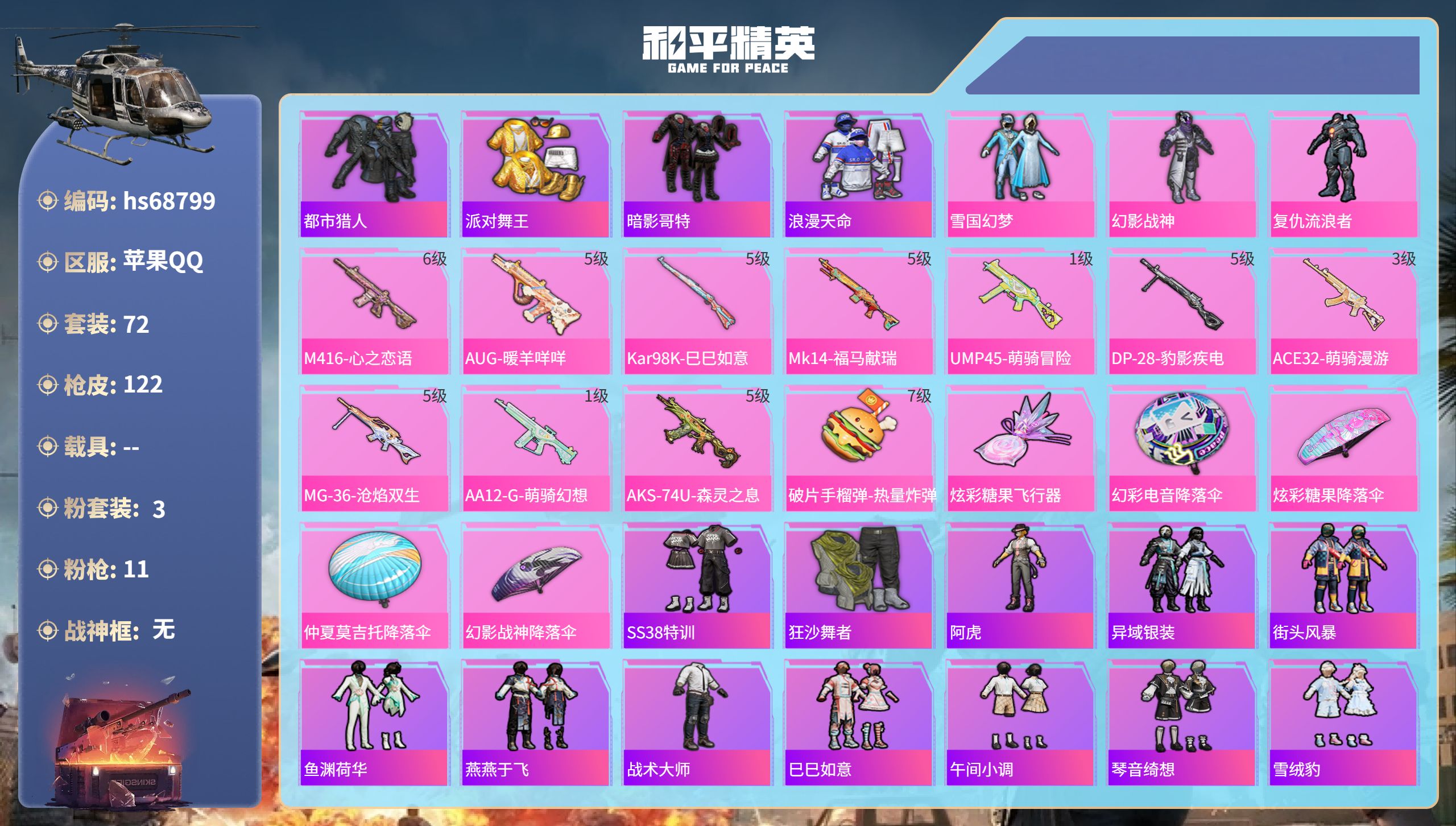 PX_2558281-,苹果手Q-5王牌印记-3粉装-11特效枪-33907热力值-72套装-122枪皮-4卓越印记-1传奇印记 【3粉装】角色-复仇流浪者,套装-雪国幻梦,套装-幻影战神 【11特效枪】UMP45-萌骑冒险/1级,AA12-G-萌骑幻想/1级,Kar98K-巳巳如意/5级,DP-28-豹影疾电/5级,M416-心之恋语/6级,ACE32-萌骑漫游/3级,AUG-暖羊咩咩/5级,MG-36-沧焰双生/5级,AKS-74U-森灵之息/5级,破片手榴弹-热量炸弹/7级,Mk14-福马献瑞/5级 【4稀有紫装】都市猎人,派对舞王,暗影哥特,浪漫天命 【72稀有时装】雪国幻梦,幻影战神,复仇流浪者,SS38特训,都市猎人,浪漫天命,暗影哥特,派对舞王,狂沙舞者,阿虎,异域银装,街头风暴,鱼渊荷华,燕燕于飞,战术大师,巳巳如意,午间小调,琴音绮想,雪绒豹,画境星梦,朱霞炽焰,狂鲨锋刃,夜瞳黯灵,阳光菠萝,凌霄紫焰,粉黛兰香,擎苍青焰,炫彩糖果,绯色魅影,萌鸡速递,元气之梦,书海巡游,风迹短诗,秘语星愿,云朵鹅,雪国风尚,恋语绒绒,青翼流星,马上来财,SS35特训,SS33特训,SS36特训,军械专家,SS37特训,红色运动,白色伏地魔,湖蓝色名流,漫步者,SS34特训,雪鹰学院,竞技名士,长空猛禽,特战装甲,街头潮人,魅力单车,传奇侦探,狙击之神,红釉青花,鹰眼刺客,雨过天青,福马献瑞,冰冻风暴,破蛋小黄鸡,海岛探路者,幻世保卫者,光之冒险,呆萌铁蟹,夏日倾情,滨海厨神,香榭午后,白兰地假日,暗夜之虎 【122稀有枪械】M416-心之恋语/6级,AUG-暖羊咩咩/5级,Kar98K-巳巳如意/5级,Mk14-福马献瑞/5级,UMP45-萌骑冒险/1级,DP-28-豹影疾电/5级,ACE32-萌骑漫游/3级,MG-36-沧焰双生/5级,AA12-G-萌骑幻想/1级,AKS-74U-森灵之息/5级,破片手榴弹-热量炸弹/7级,DBS-风迹短诗,莫辛纳甘-风迹短诗,Mini14-鸡智如我,Win94-乌木金纹,MK12-风迹短诗,MK12-乌木金纹,破片手榴弹-爆破雪人,S12K-极意拳锋,DBS-幻彩电音,ACE32-画境星梦,Famas-桃粉嫣然,M1加兰德-画境星梦,MP5K-画境星梦,M762-登顶巅峰,蜜獾-乌木金纹,M762-云朵鹅,SVD-云朵鹅,M249-绯穹魔姬,SPAS-12-狂鲨锋刃,MK20-H-狂鲨锋刃,AUG-冰晶雪宝,突击盾牌-绝对恒星,铝热弹-炫彩糖果,UZI-炫彩糖果,UMP45-绿洲时空,ARX-像素花束,Mini14-绯穹魔姬,大砍刀-像素花束,AA12-G-画境星梦,平底锅-画境星梦,M249-冰晶雪宝,Mk47-风迹短诗,JS9-凌霄紫焰,MG-36-凌霄紫焰,ARX-凌霄紫焰,AKS-74U-乌木金纹,AKM-涂鸦街区,蜜獾-风迹短诗,爆炸猎弓-喜羊羊与灰太狼,P92-凌霄紫焰,Famas-乌木金纹,Famas-霓彩脉冲,SPAS-12-云朵鹅,破片手榴弹-拽到爆炸,信号枪-异瞳寒姬,平底锅-凌霄紫焰,Mk14-薄荷星砂,沙漠之鹰-云朵鹅,烟雾弹-冰氧夏日,Mk14-紫晶流影,MG-36-薄荷星砂,蜜獾-青瓷战姬,大砍刀-云朵鹅,PKM-啾咪啾咪,SVD-霓彩脉冲,SLR-霓彩脉冲,SCAR-L-彩虹符号,S12K-霓彩脉冲,AMR-鸡智如我,AKM-霓彩脉冲,AKM-影袭,SCAR-L-夜灯,SCAR-L-炫彩节奏,GROZA-影袭,AUG-幻影战神,AUG-甜蜜菠萝,Kar98K-幻影战神,Kar98K-影袭,M24-影袭,M24-仲夏莫吉托,M24-炫彩节奏,AWM-雷霆特警,M200-仲夏莫吉托,SKS-迅猛狂鲨,UZI-影袭,UMP45-夜灯,UMP45-仲夏莫吉托,S12K-玩趣呆呆,M249-彩虹符号,MG3-第五大道,MG3-幻世战舞者,撬棍-冰晶雪宝,DBS-绿洲时空,MG3-火熔核心,ACE32-冰晶雪宝,AUG-异域银装,汤姆逊-樱桃泡泡,野牛-燕燕于飞,M200-乌木金纹,SPAS-12-燕燕于飞,蝎式手枪-燕燕于飞,十字弩-异域银装,爆炸猎弓-花中眠,Vector-燕燕于飞,十字弩-燕燕于飞,M16A4-雨过天青,GROZA-福马献瑞,蜜獾-启元战纹,AMR-雨过天青,SLR-乌木金纹,AA12-G-雨过天青,PKM-雨过天青,沙漠之鹰-雨过天青,燃烧瓶-福马献瑞,P90-紫矿核心,GROZA-紫矿核心,VSS-香桃花海,汤姆逊-像素花束,P90-巳巳如意,DBS-绿洲时空,MG3-火熔核心 【6稀有飞行器】狂鲨锋刃飞行器,马上有福飞行器,鸡智如我飞行器,炫彩糖果飞行器,登顶巅峰飞行器,异域银装飞行器 【22稀有背包】雪国精灵背包(3级),酷熊伴侣背包(3级),狂鲨锋刃背包(3级),画境星梦背包(3级),炫彩糖果背包(3级),凌霄紫焰背包(3级),粉黛兰香背包(3级),萌鸡速递背包(3级),薄荷星砂背包(3级),风迹短诗背包(3级),巳巳如意背包(3级),云朵鹅背包(3级),幻影战神背包(3级),仲夏莫吉托背包(3级),异域银装背包(3级),雪国风尚背包(3级),星之彼岸背包(3级),雨过天青背包(3级),甜蜜菠萝背包(3级),金羽特工背包(3级),福马献瑞背包(3级),雷霆特警背包(3级) 【26稀有降落伞】SS35王牌降落伞,魔童闹海,敖闰降落伞,SS36王牌降落伞,幻彩电音降落伞,炫彩糖果降落伞,狂鲨锋刃降落伞,雨过天青降落伞,福马献瑞降落伞,画境星梦降落伞,SS34王牌降落伞,百战成名降落伞,凌霄紫焰降落伞,SS33王牌降落伞,风迹短诗降落伞,云朵鹅降落伞,钢铁雄心降落伞,都市猎人降落伞,普通降落伞,化学天才降落伞,白昼之火降落伞,异域银装降落伞,燕燕于飞降落伞,仲夏莫吉托降落伞,青瓷战姬降落伞,幻影战神降落伞,电竞之星降落伞 【17稀有头盔】幻影战神头盔(3级),甜蜜菠萝头盔(3级),雪国精灵头盔(3级),雪国风尚头盔(3级),狂鲨锋刃头盔(3级),炫彩糖果头盔(3级),粉黛兰香头盔(3级),萌鸡速递头盔(3级),凌霄紫焰头盔(3级),风迹短诗头盔(3级),画境星梦头盔(3级),云朵鹅头盔(3级),炫彩节奏头盔(3级),沙丘之主头盔(3级),异域银装头盔(3级),福马献瑞头盔(3级),雷霆特警头盔(3级)