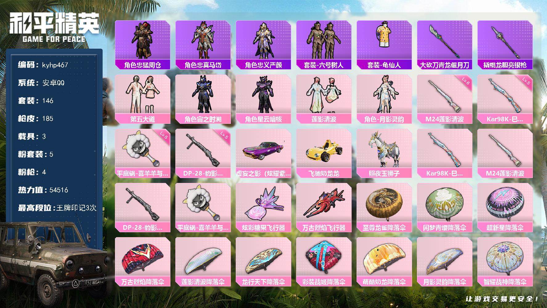 PX_2558248--5粉装-4特效枪-3载具-2粉色飞行器-54516热力值-3王牌印记-146套装-185枪皮 【热门品类】:角色-忠猛周仓,角色-忠真马岱,角色-忠义严颜,套装-六号树人,套装-龟仙人,大砍刀-青龙偃月刀,撬棍-龙胆亮银枪 【粉色套装】:粉装-第五大道,角色-宙之时溯,角色-星云暗核,粉装-莲影清波,角色-月影灵韵 【粉色枪皮等级】:Kar98K-巳巳如意(五级),M24-莲影清波
