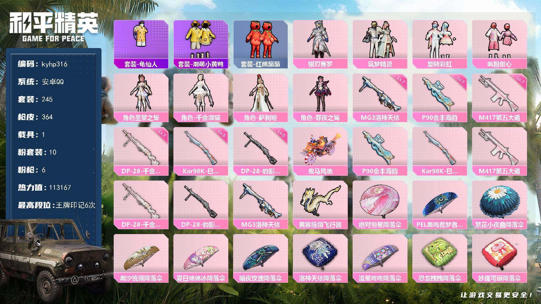 PX_2558135--10粉装-6特效枪-1载具-3粉色飞行器-113167热力值-6王牌印记-245套装-364枪皮 【热门品类】:套装-龟仙人,套装-潮萌小黄鸭,套装-红熊茄茄 【粉色套装】:粉装-银刃赛罗,粉装-筑梦精灵,粉装-旋转彩虹,粉装-飒粉甜心,角色-圣堂之誓,角色-千金淑猫,角色-萨利娅,角色-罪夜之冕 【粉色枪皮等级】:P90-金丰海韵(七级),Kar98K-巳巳如意(五级),M417
