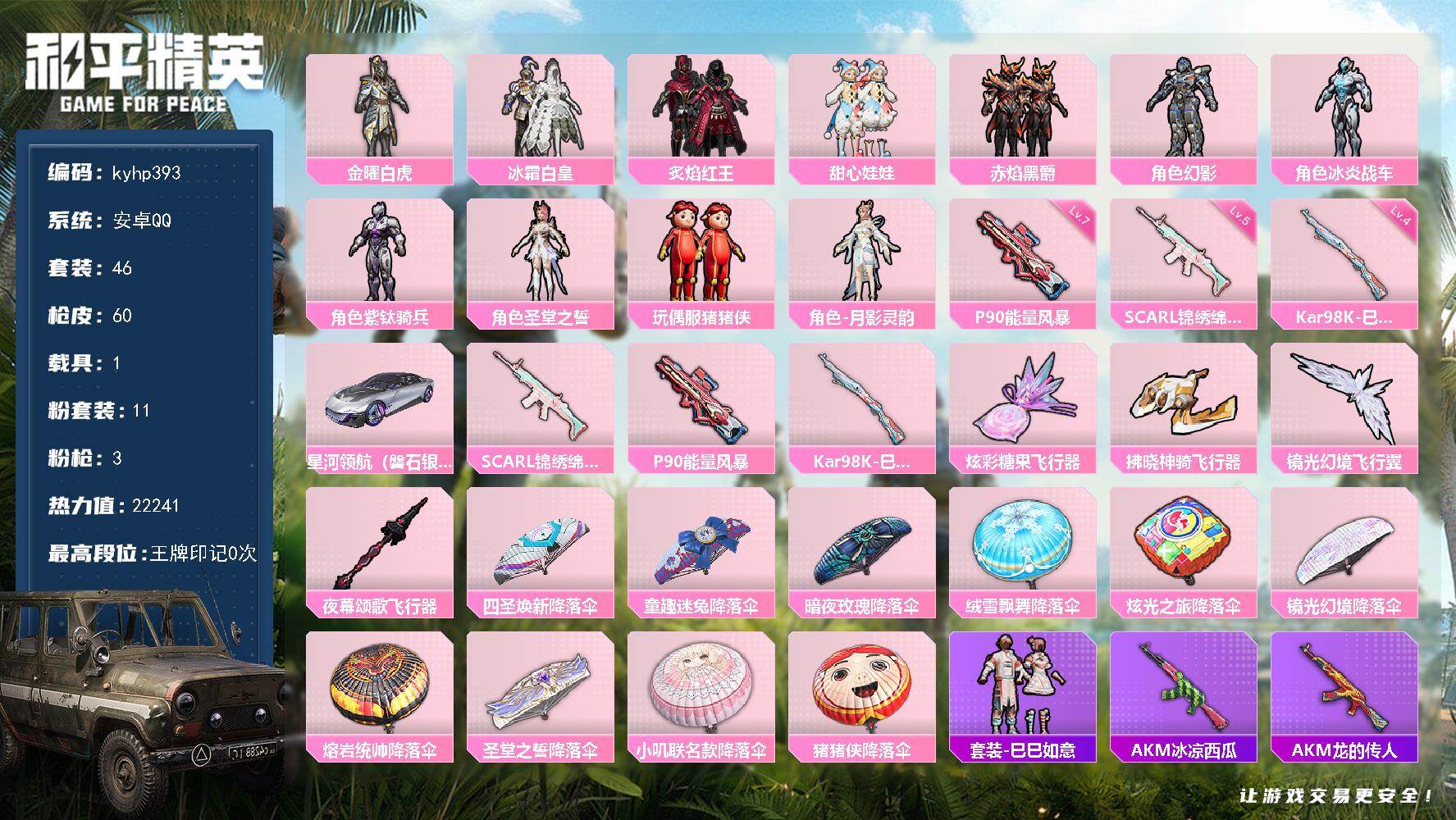 PX_2557908--9粉装-6特效枪-1载具-3粉色飞行器-56517热力值-3王牌印记-148套装-175枪皮 【热门品类】:角色-军刀雅典娜,套装-金羽特工,熔岩游骑兵连帽夹克 【粉色套装】:粉装-烈焰拳霸,粉装-炙焰赤龙,粉装-蜜桃特工,粉装-暗夜玫瑰,粉装-齐天大圣,粉装-沙场疾风,粉装-吟月归客,角色-复仇流浪者,角色-樱桃泡泡 【粉色枪皮等级】:AKM-绿萝繁花(五级),SCAR-L-锦绣