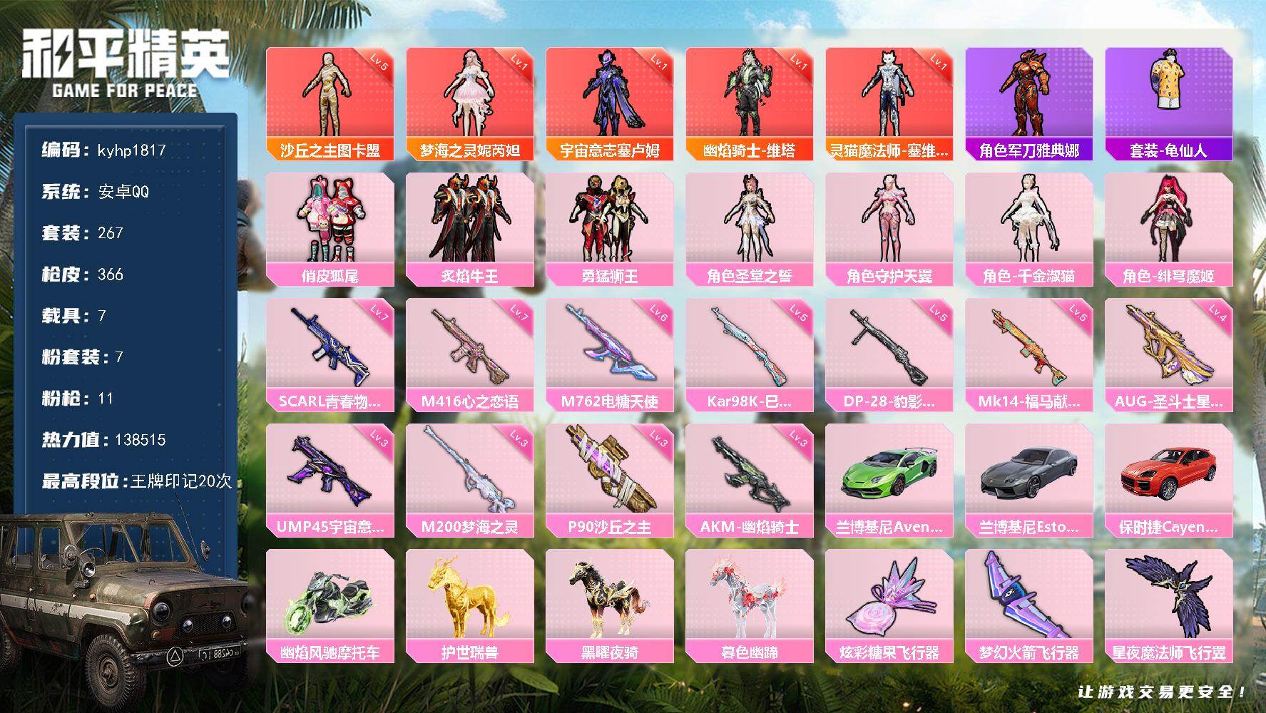PX_2557908--9粉装-6特效枪-1载具-3粉色飞行器-56517热力值-3王牌印记-148套装-175枪皮 【热门品类】:角色-军刀雅典娜,套装-金羽特工,熔岩游骑兵连帽夹克 【粉色套装】:粉装-烈焰拳霸,粉装-炙焰赤龙,粉装-蜜桃特工,粉装-暗夜玫瑰,粉装-齐天大圣,粉装-沙场疾风,粉装-吟月归客,角色-复仇流浪者,角色-樱桃泡泡 【粉色枪皮等级】:AKM-绿萝繁花(五级),SCAR-L-锦绣